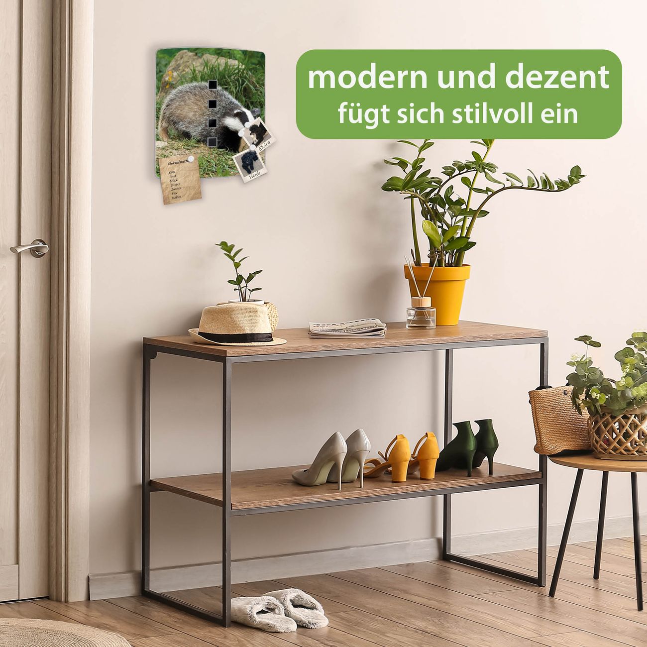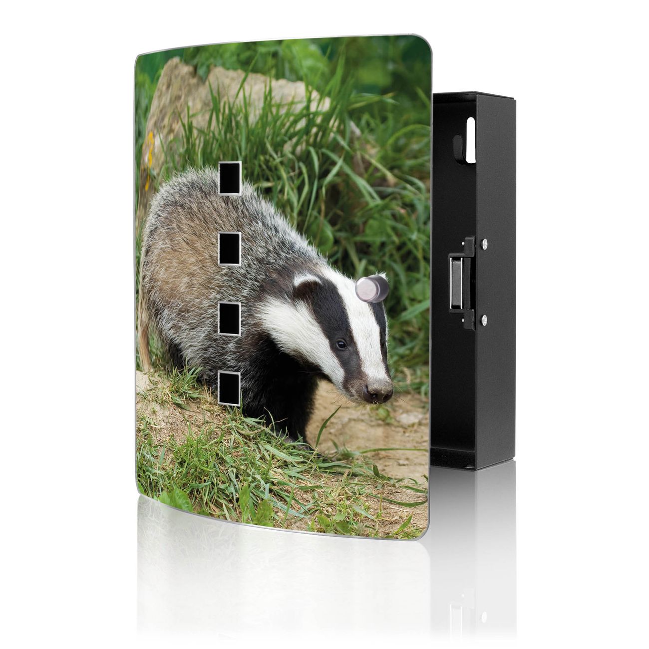 Funktion / Nutzen: Die leicht geschwungene Edelstahltür ist mit einer hochwertigen Motivfolie und dem Motiv Motiv Dachs kaschiert. Ein praktischer Magnetverschluss ermöglicht Ihnen ein schnelles Öffnen und Schließen. Befestigt wird der Schlüsselkasten an 2 Stellen auf der Rückseite, passendes Montagematerial fügen wir bereits bei.