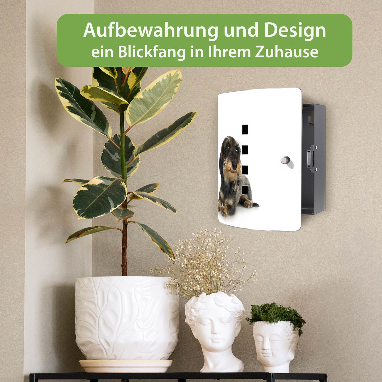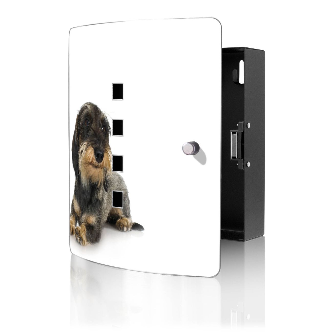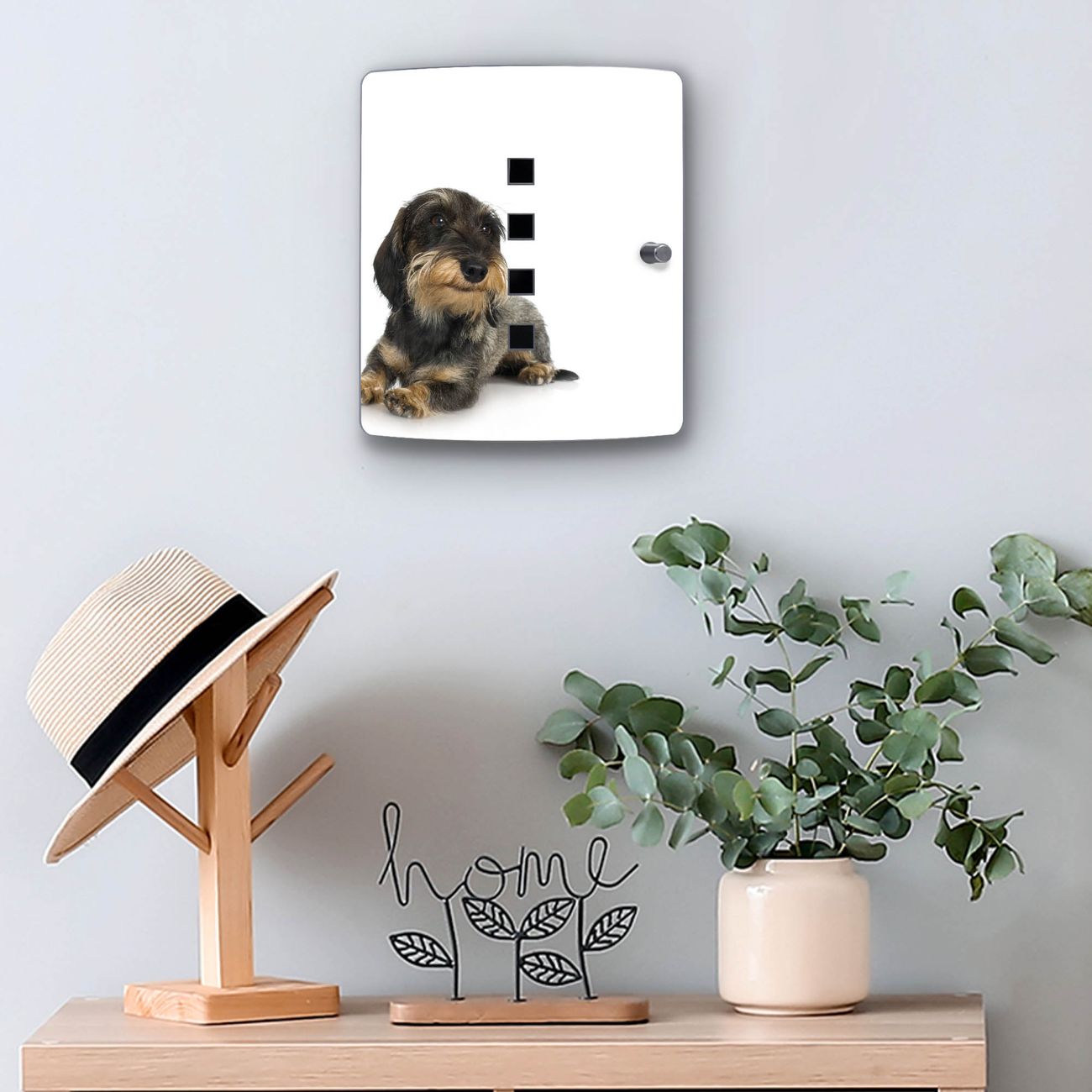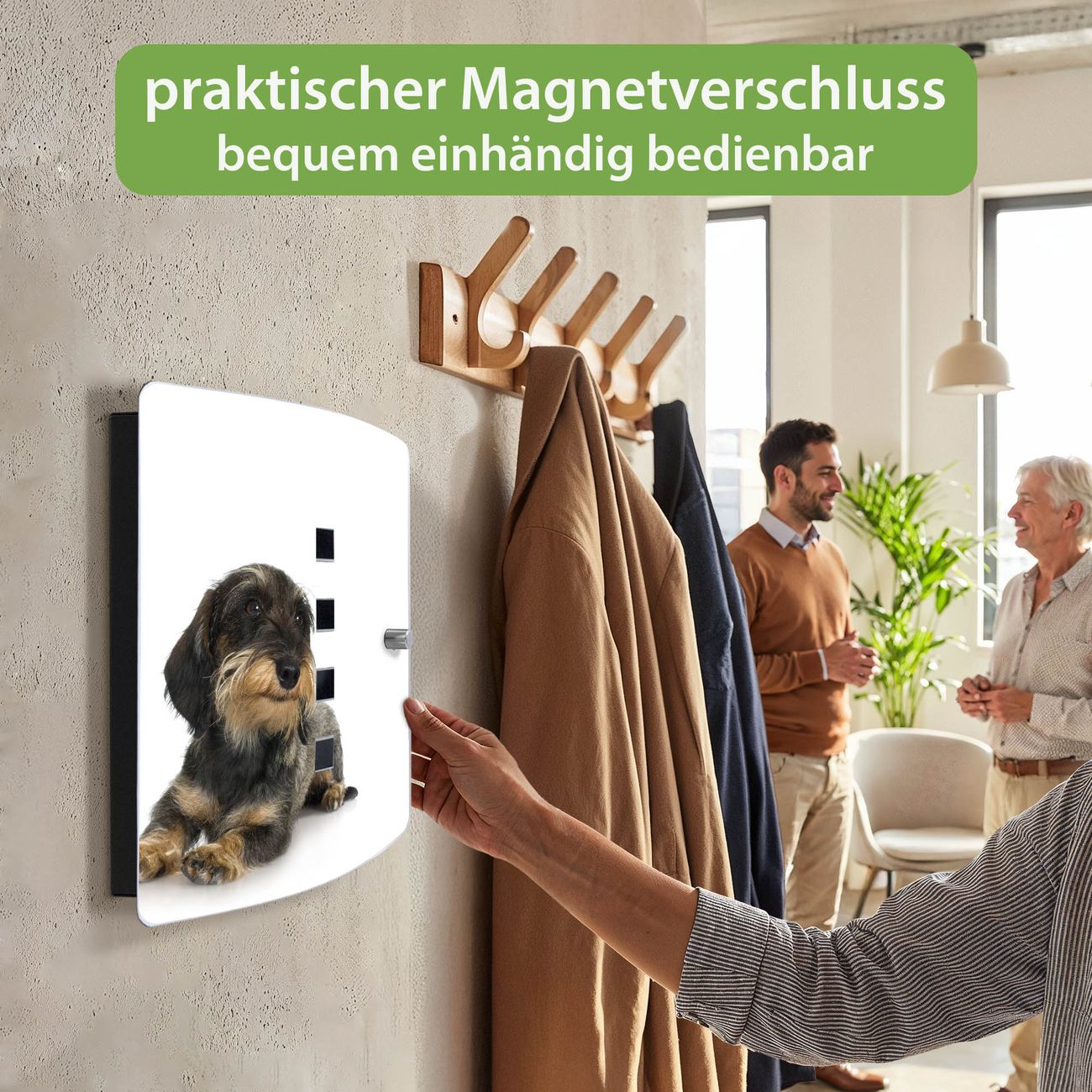 Funktion / Nutzen: Die leicht geschwungene Edelstahltür ist mit einer hochwertigen Motivfolie und dem Motiv Motiv Dackel kaschiert. Ein praktischer Magnetverschluss ermöglicht Ihnen ein schnelles Öffnen und Schließen. Befestigt wird der Schlüsselkasten an 2 Stellen auf der Rückseite, passendes Montagematerial fügen wir bereits bei.