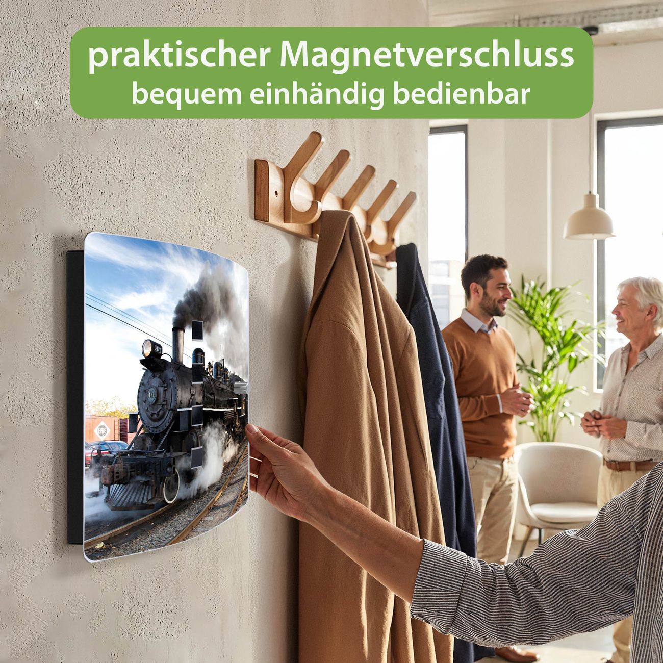 Funktion / Nutzen: Die leicht geschwungene Edelstahltür ist mit einer hochwertigen Motivfolie und dem Motiv Motiv Dampflok kaschiert. Ein praktischer Magnetverschluss ermöglicht Ihnen ein schnelles Öffnen und Schließen. Befestigt wird der Schlüsselkasten an 2 Stellen auf der Rückseite, passendes Montagematerial fügen wir bereits bei.