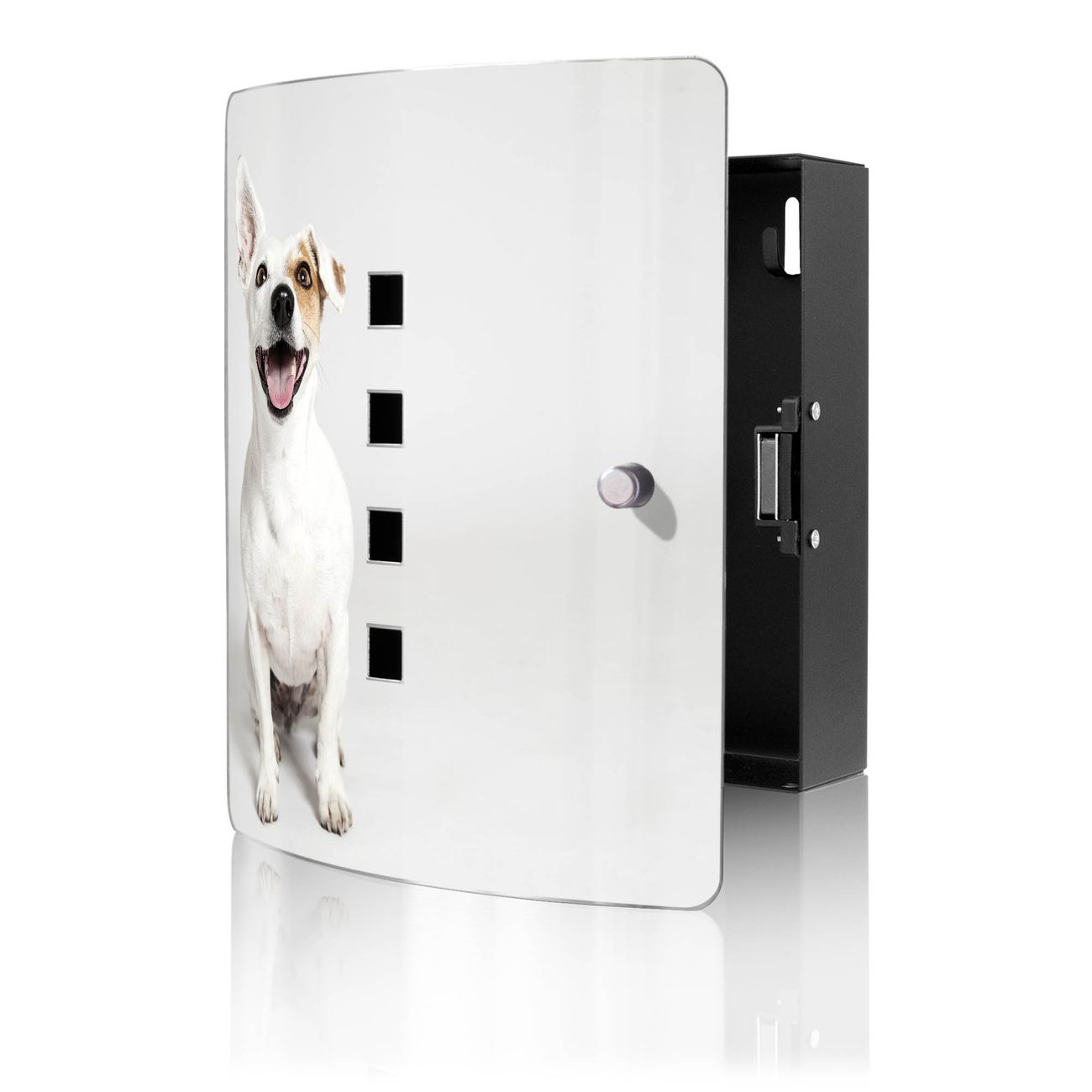 Funktion / Nutzen: Die leicht geschwungene Edelstahltür ist mit einer hochwertigen Motivfolie und dem Motiv Motiv Derek kaschiert. Ein praktischer Magnetverschluss ermöglicht Ihnen ein schnelles Öffnen und Schließen. Befestigt wird der Schlüsselkasten an 2 Stellen auf der Rückseite, passendes Montagematerial fügen wir bereits bei.
