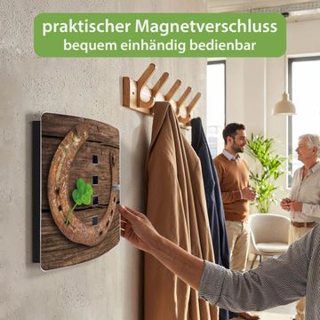 Funktion / Nutzen: Die leicht geschwungene Edelstahltür ist mit einer hochwertigen Motivfolie und dem Motiv Motiv Doppeltes Glück kaschiert. Ein praktischer Magnetverschluss ermöglicht Ihnen ein schnelles Öffnen und Schließen. Befestigt wird der Schlüsselkasten an 2 Stellen auf der Rückseite, passendes Montagematerial fügen wir bereits bei.