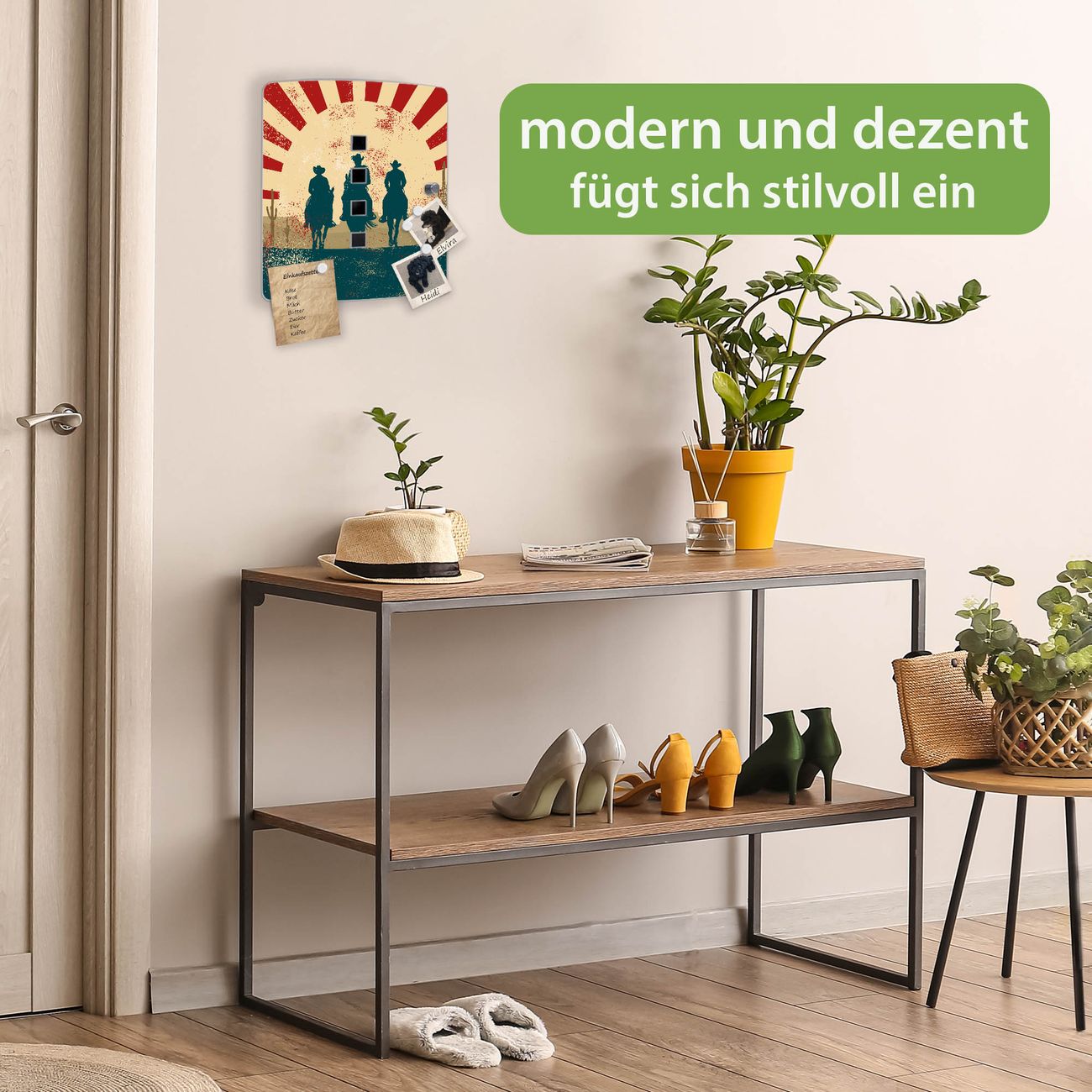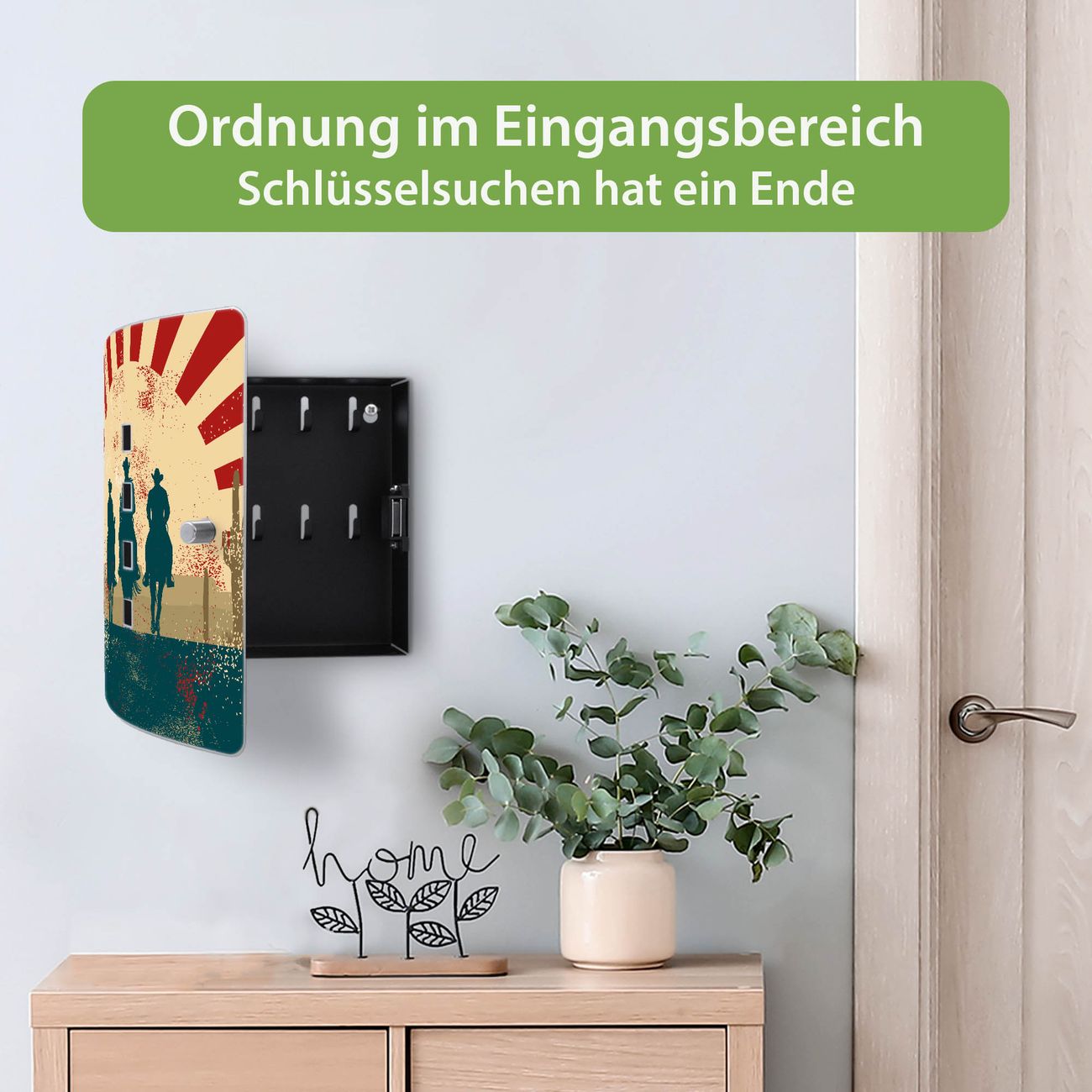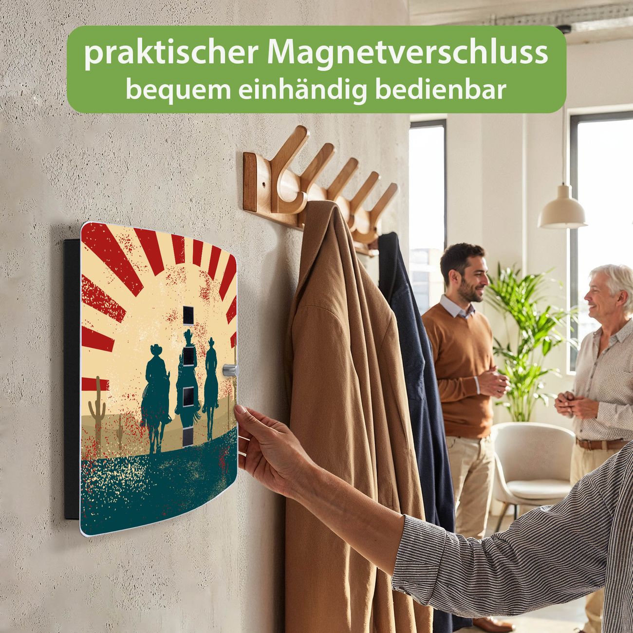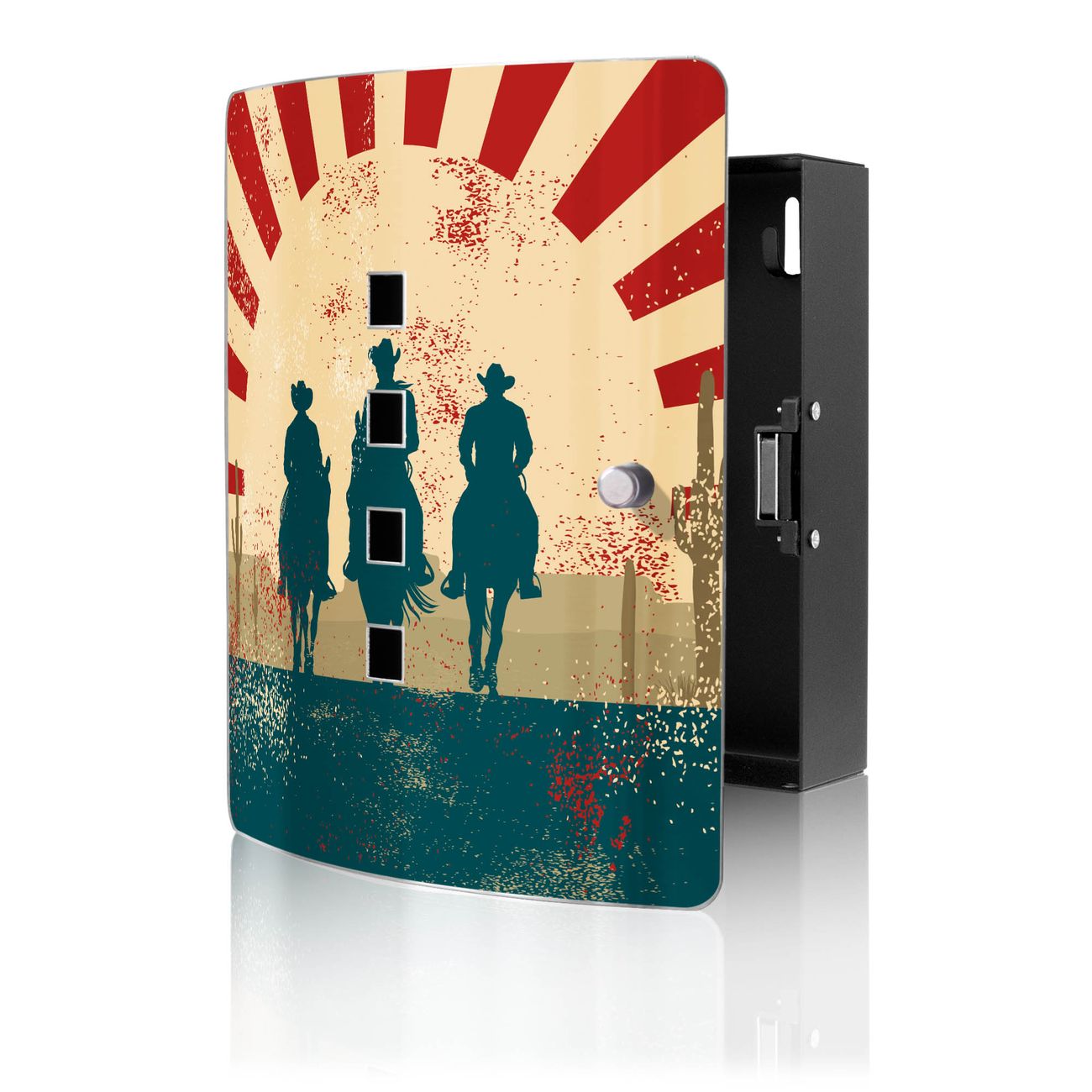 Funktion / Nutzen: Die leicht geschwungene Edelstahltür ist mit einer hochwertigen Motivfolie und dem Motiv Motiv Drei Cowboys kaschiert. Ein praktischer Magnetverschluss ermöglicht Ihnen ein schnelles Öffnen und Schließen. Befestigt wird der Schlüsselkasten an 2 Stellen auf der Rückseite, passendes Montagematerial fügen wir bereits bei.