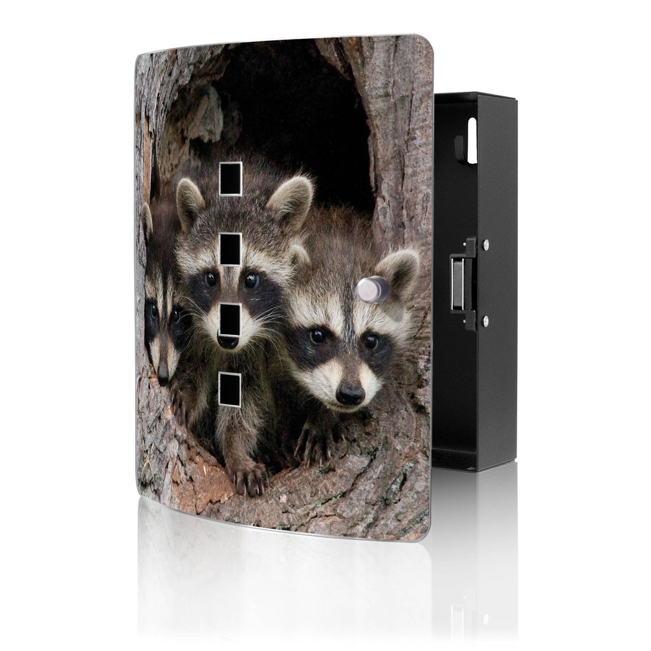 Funktion / Nutzen: Die leicht geschwungene Edelstahltür ist mit einer hochwertigen Motivfolie und dem Motiv Motiv Drei Waschbären kaschiert. Ein praktischer Magnetverschluss ermöglicht Ihnen ein schnelles Öffnen und Schließen. Befestigt wird der Schlüsselkasten an 2 Stellen auf der Rückseite, passendes Montagematerial fügen wir bereits bei.