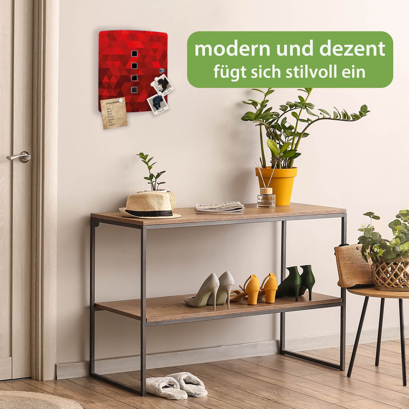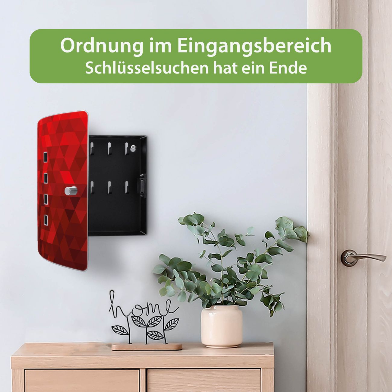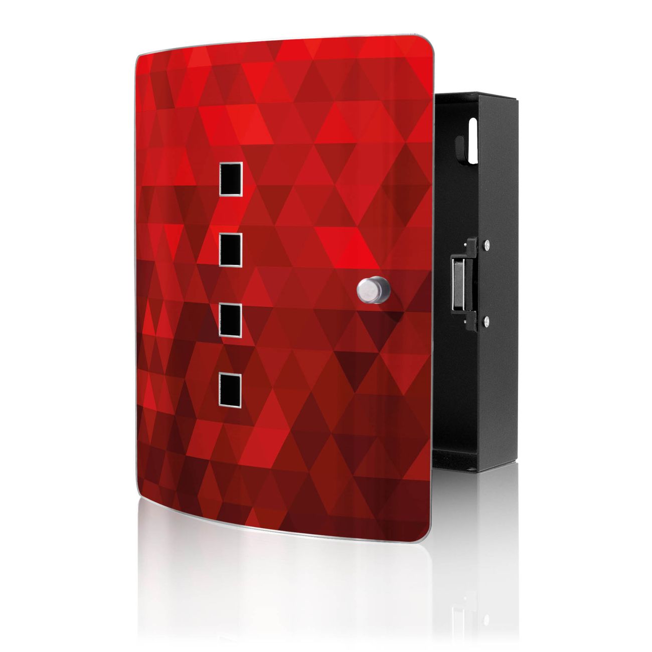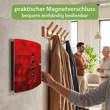 Funktion / Nutzen: Die leicht geschwungene Edelstahltür ist mit einer hochwertigen Motivfolie und dem Motiv Motiv Dreiecke Rot kaschiert. Ein praktischer Magnetverschluss ermöglicht Ihnen ein schnelles Öffnen und Schließen. Befestigt wird der Schlüsselkasten an 2 Stellen auf der Rückseite, passendes Montagematerial fügen wir bereits bei.