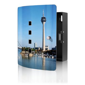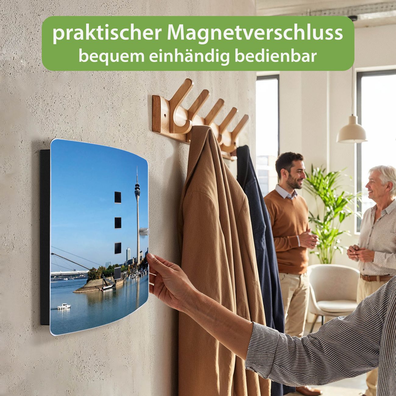 Funktion / Nutzen: Die leicht geschwungene Edelstahltür ist mit einer hochwertigen Motivfolie und dem Motiv Motiv Düsseldorf kaschiert. Ein praktischer Magnetverschluss ermöglicht Ihnen ein schnelles Öffnen und Schließen. Befestigt wird der Schlüsselkasten an 2 Stellen auf der Rückseite, passendes Montagematerial fügen wir bereits bei.
