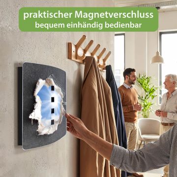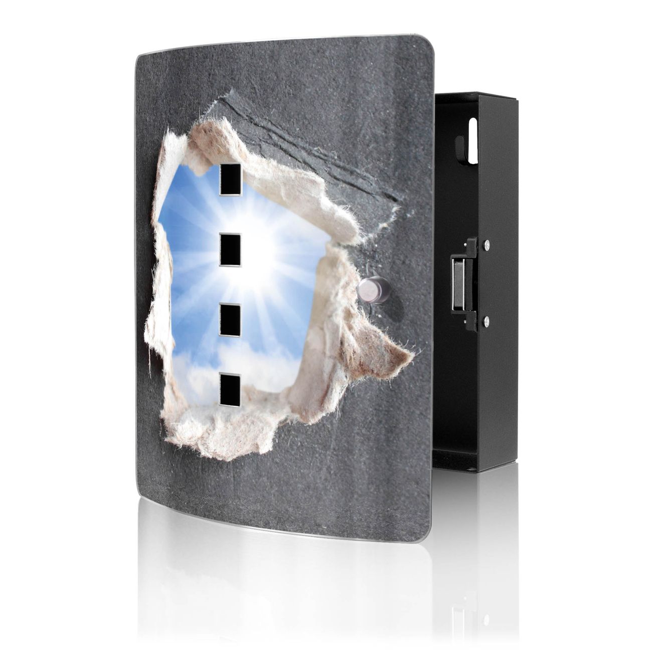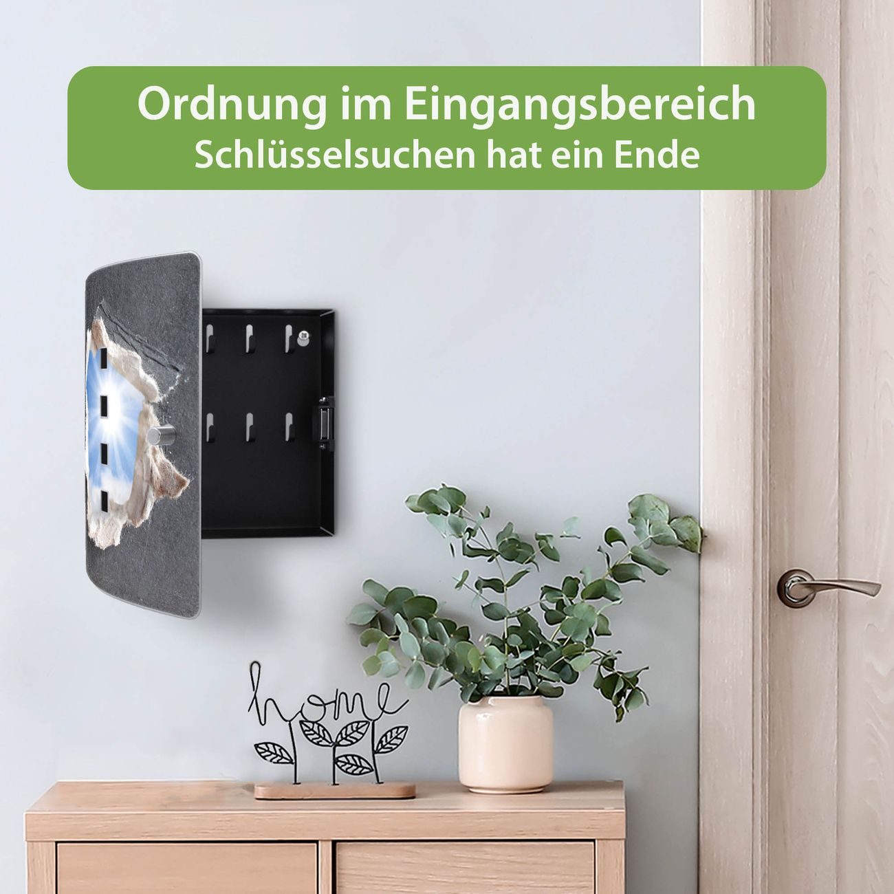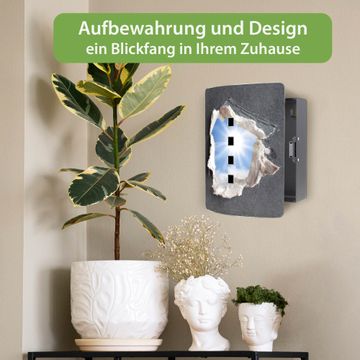 Funktion / Nutzen: Die leicht geschwungene Edelstahltür ist mit einer hochwertigen Motivfolie und dem Motiv Motiv Durchblick kaschiert. Ein praktischer Magnetverschluss ermöglicht Ihnen ein schnelles Öffnen und Schließen. Befestigt wird der Schlüsselkasten an 2 Stellen auf der Rückseite, passendes Montagematerial fügen wir bereits bei.
