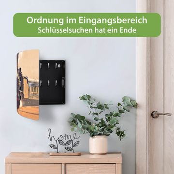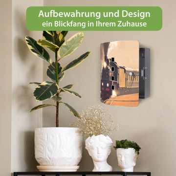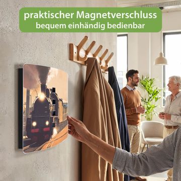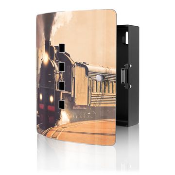 Funktion / Nutzen: Die leicht geschwungene Edelstahltür ist mit einer hochwertigen Motivfolie und dem Motiv Motiv Einfahrender Zug kaschiert. Ein praktischer Magnetverschluss ermöglicht Ihnen ein schnelles Öffnen und Schließen. Befestigt wird der Schlüsselkasten an 2 Stellen auf der Rückseite, passendes Montagematerial fügen wir bereits bei.
