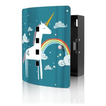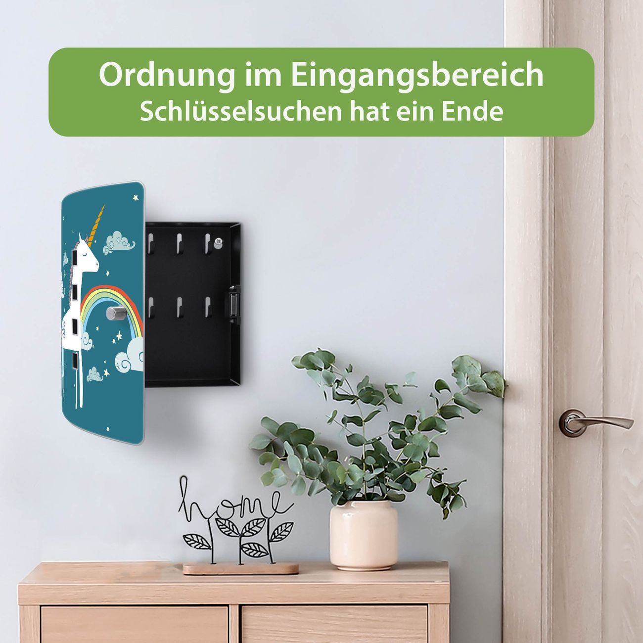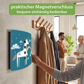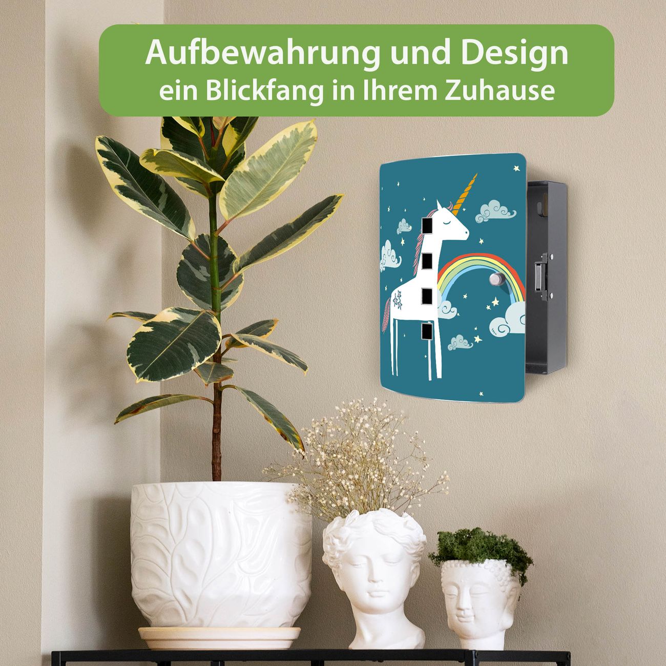 Funktion / Nutzen: Die leicht geschwungene Edelstahltür ist mit einer hochwertigen Motivfolie und dem Motiv Motiv Einhorn kaschiert. Ein praktischer Magnetverschluss ermöglicht Ihnen ein schnelles Öffnen und Schließen. Befestigt wird der Schlüsselkasten an 2 Stellen auf der Rückseite, passendes Montagematerial fügen wir bereits bei.