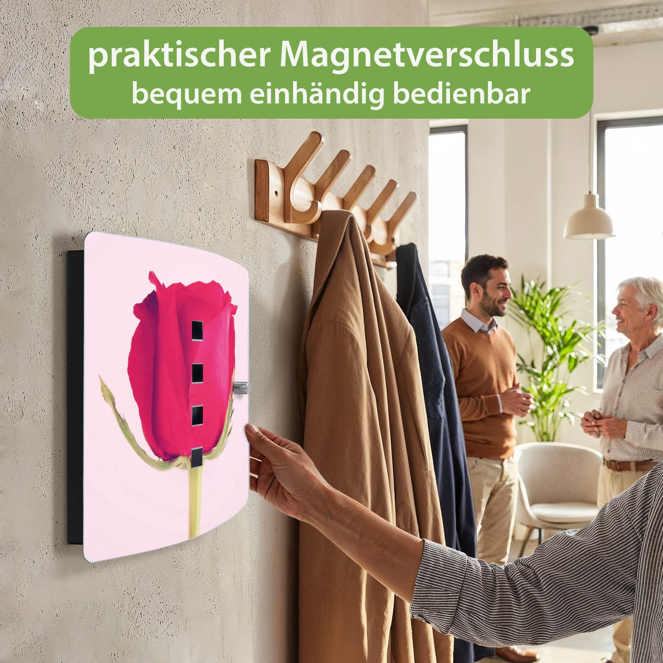 Funktion / Nutzen: Die leicht geschwungene Edelstahltür ist mit einer hochwertigen Motivfolie und dem Motiv Motiv Einzelne Rose kaschiert. Ein praktischer Magnetverschluss ermöglicht Ihnen ein schnelles Öffnen und Schließen. Befestigt wird der Schlüsselkasten an 2 Stellen auf der Rückseite, passendes Montagematerial fügen wir bereits bei.