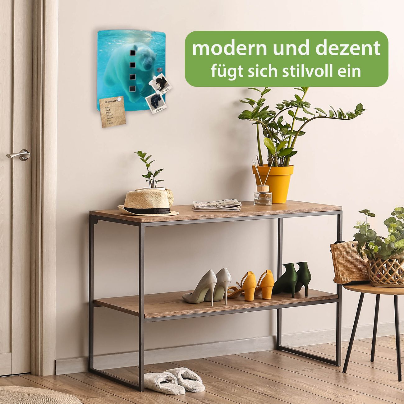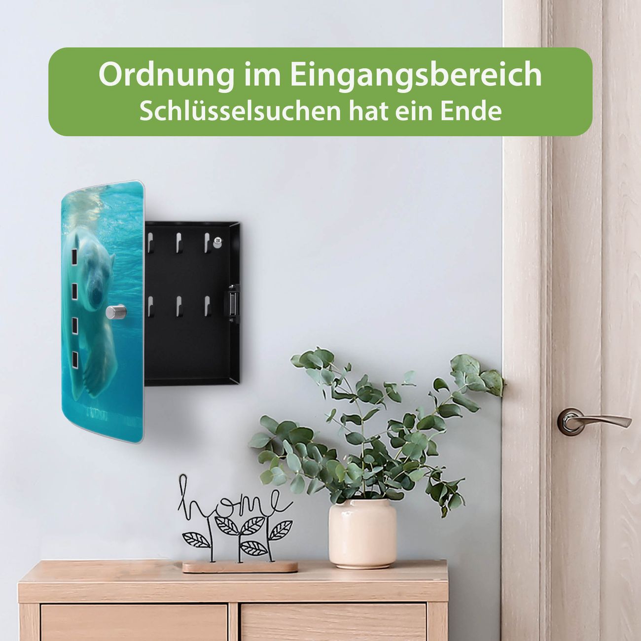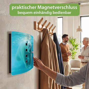 Funktion / Nutzen: Die leicht geschwungene Edelstahltür ist mit einer hochwertigen Motivfolie und dem Motiv Motiv Eisbär unter Wasser kaschiert. Ein praktischer Magnetverschluss ermöglicht Ihnen ein schnelles Öffnen und Schließen. Befestigt wird der Schlüsselkasten an 2 Stellen auf der Rückseite, passendes Montagematerial fügen wir bereits bei.