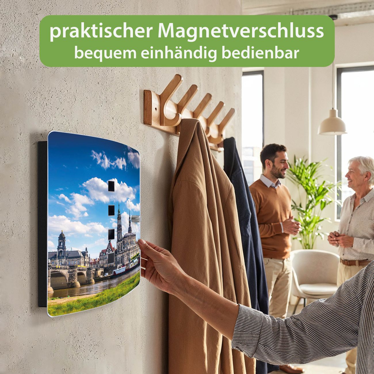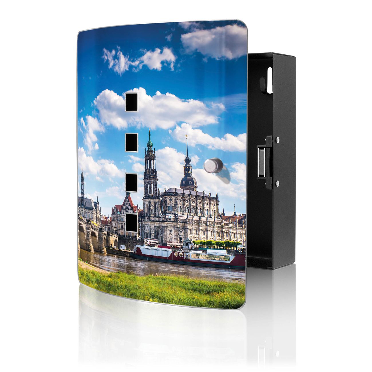 Funktion / Nutzen: Die leicht geschwungene Edelstahltür ist mit einer hochwertigen Motivfolie und dem Motiv Motiv Elbflorenz kaschiert. Ein praktischer Magnetverschluss ermöglicht Ihnen ein schnelles Öffnen und Schließen. Befestigt wird der Schlüsselkasten an 2 Stellen auf der Rückseite, passendes Montagematerial fügen wir bereits bei.