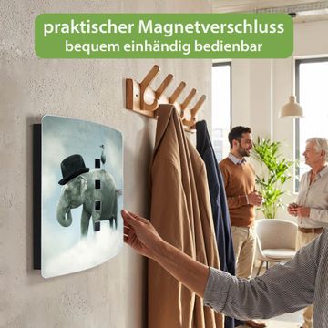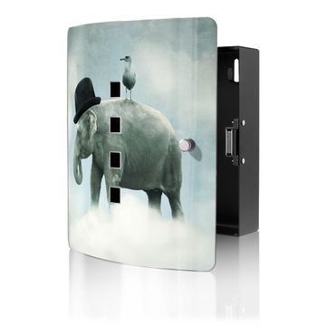 Funktion / Nutzen: Die leicht geschwungene Edelstahltür ist mit einer hochwertigen Motivfolie und dem Motiv Motiv Elefant und Möwe kaschiert. Ein praktischer Magnetverschluss ermöglicht Ihnen ein schnelles Öffnen und Schließen. Befestigt wird der Schlüsselkasten an 2 Stellen auf der Rückseite, passendes Montagematerial fügen wir bereits bei.
