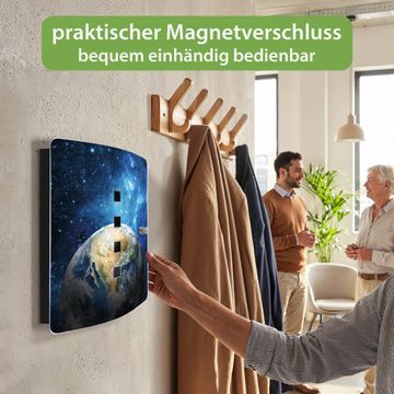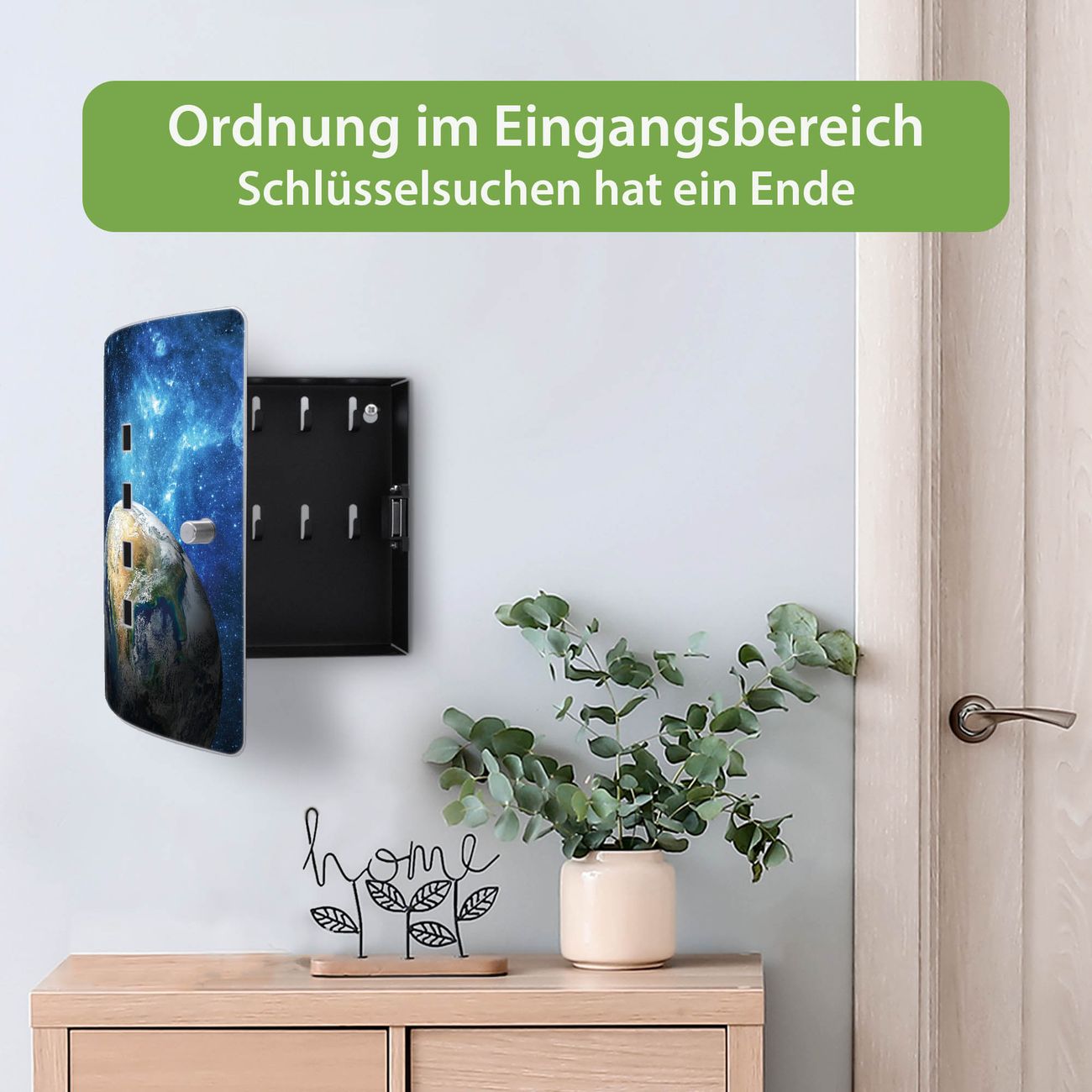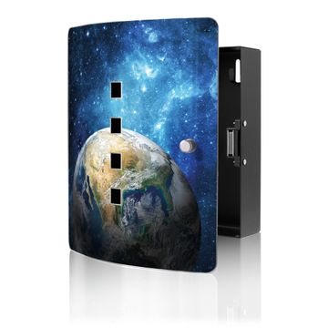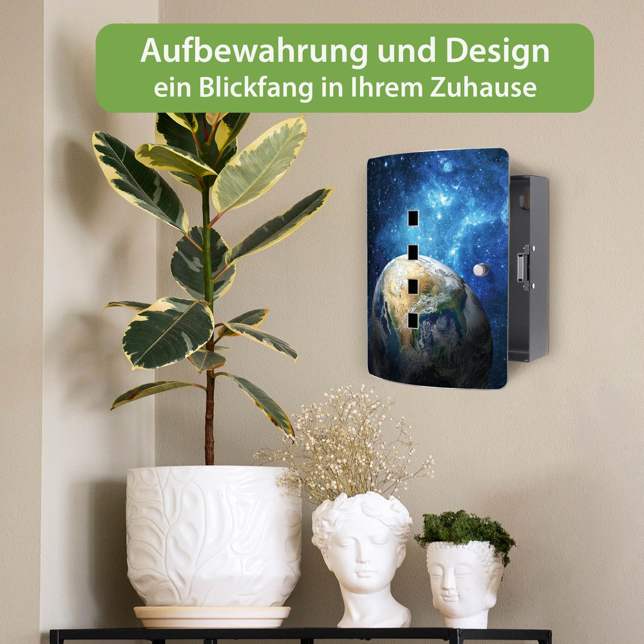 Funktion / Nutzen: Die leicht geschwungene Edelstahltür ist mit einer hochwertigen Motivfolie und dem Motiv Motiv Erdkugel kaschiert. Ein praktischer Magnetverschluss ermöglicht Ihnen ein schnelles Öffnen und Schließen. Befestigt wird der Schlüsselkasten an 2 Stellen auf der Rückseite, passendes Montagematerial fügen wir bereits bei.