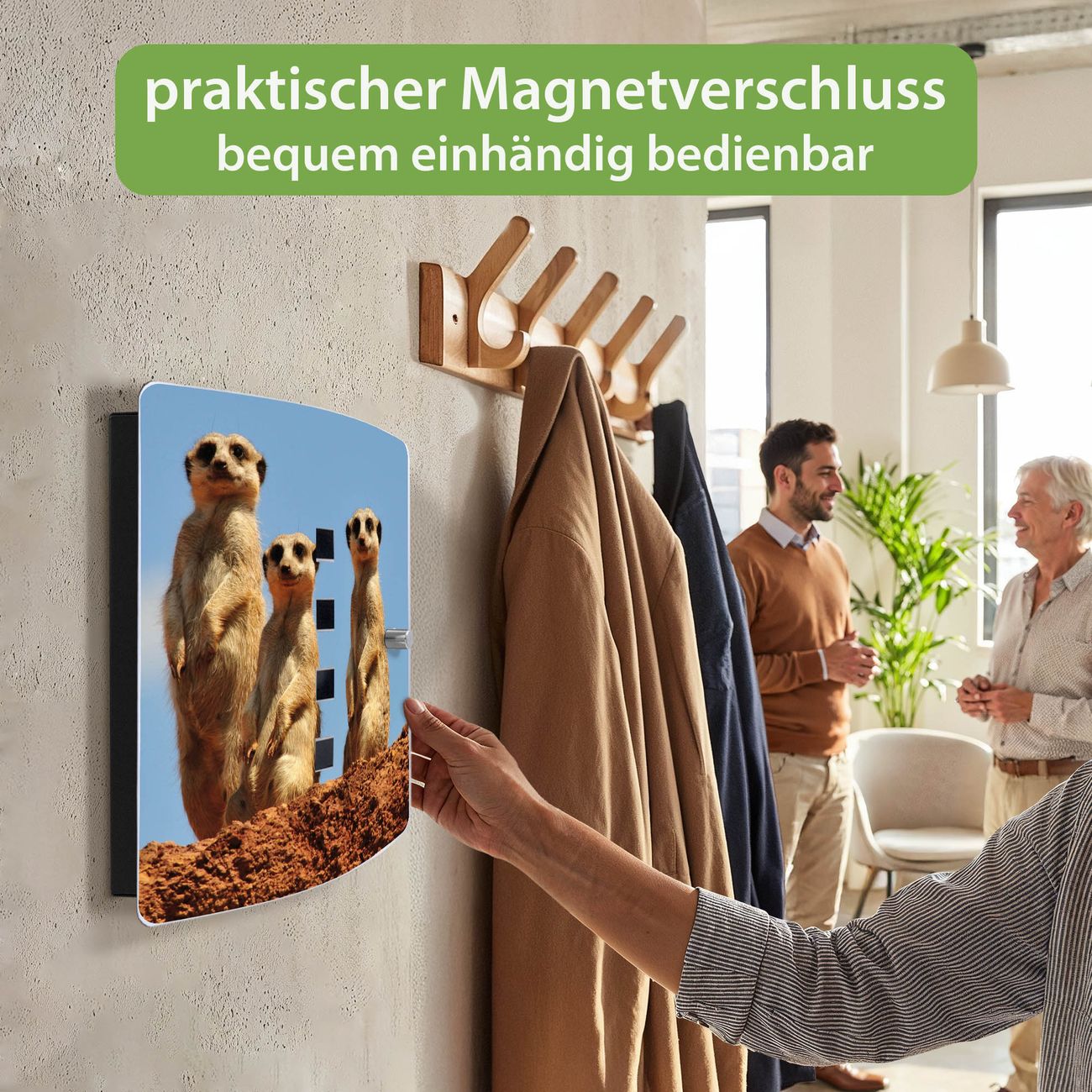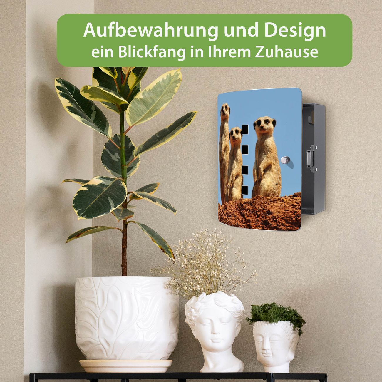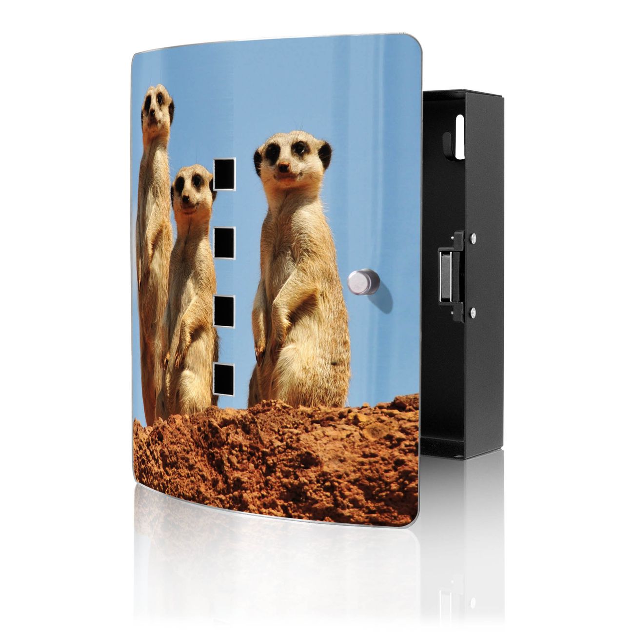 Funktion / Nutzen: Die leicht geschwungene Edelstahltür ist mit einer hochwertigen Motivfolie und dem Motiv Motiv Erdmännchenfamilie kaschiert. Ein praktischer Magnetverschluss ermöglicht Ihnen ein schnelles Öffnen und Schließen. Befestigt wird der Schlüsselkasten an 2 Stellen auf der Rückseite, passendes Montagematerial fügen wir bereits bei.