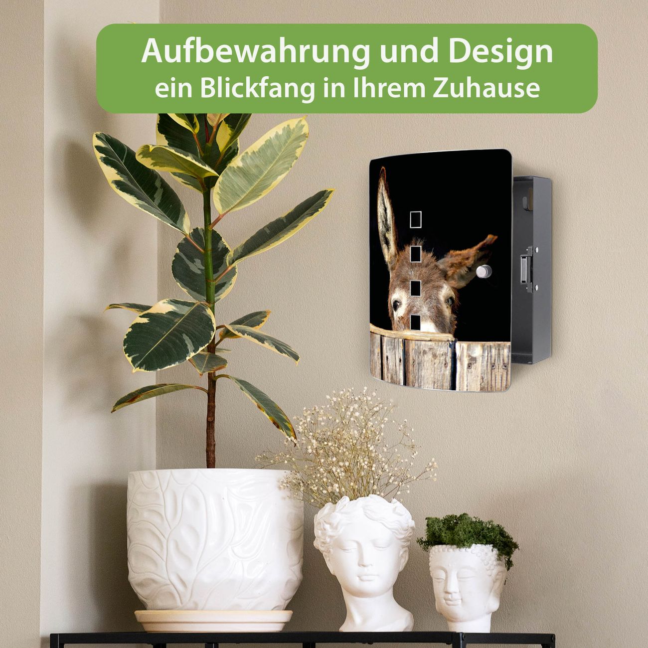 Funktion / Nutzen: Die leicht geschwungene Edelstahltür ist mit einer hochwertigen Motivfolie und dem Motiv Motiv Esel kaschiert. Ein praktischer Magnetverschluss ermöglicht Ihnen ein schnelles Öffnen und Schließen. Befestigt wird der Schlüsselkasten an 2 Stellen auf der Rückseite, passendes Montagematerial fügen wir bereits bei.