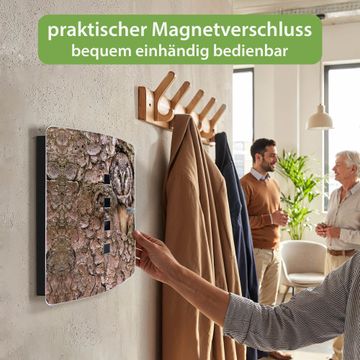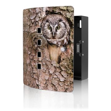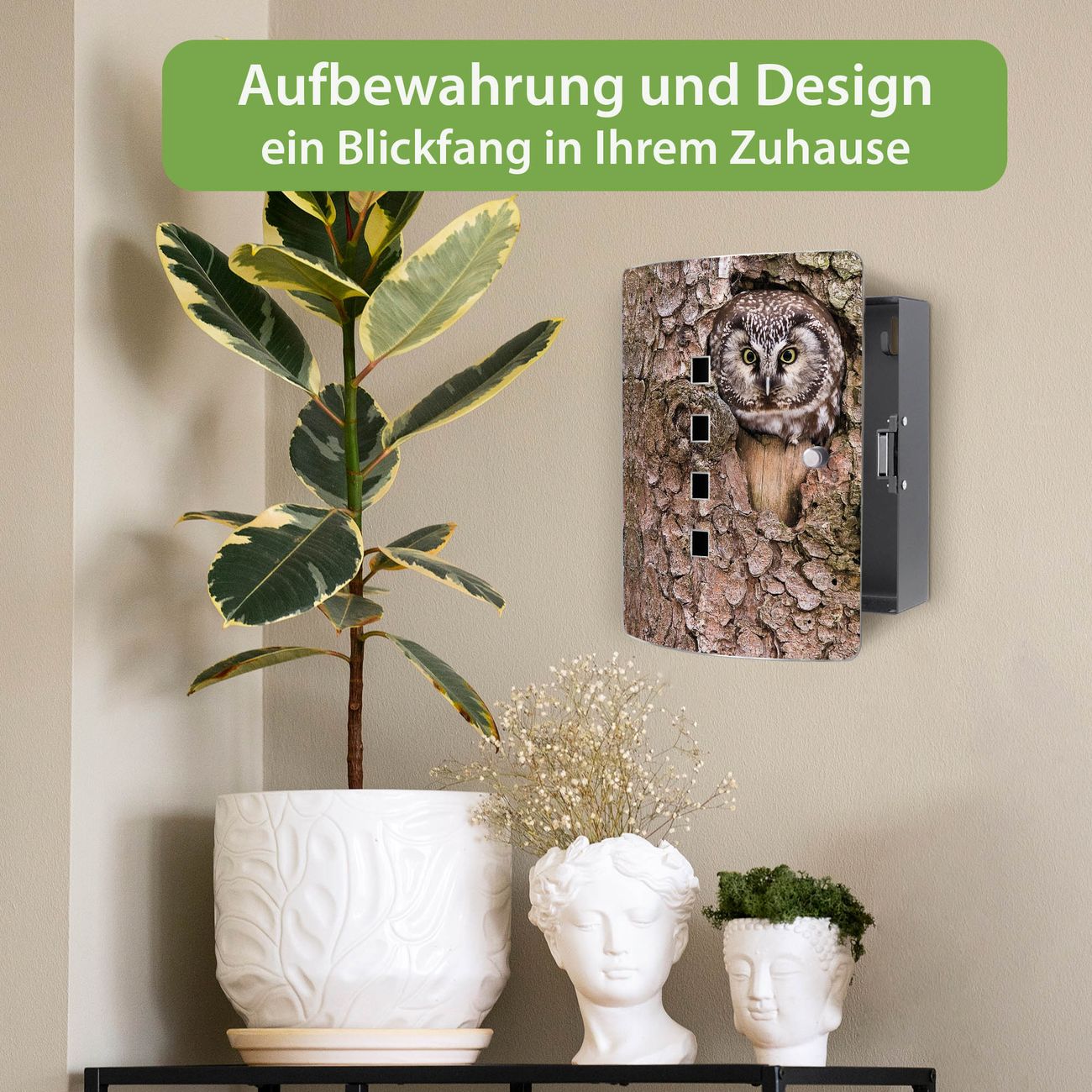 Funktion / Nutzen: Die leicht geschwungene Edelstahltür ist mit einer hochwertigen Motivfolie und dem Motiv Motiv Eule kaschiert. Ein praktischer Magnetverschluss ermöglicht Ihnen ein schnelles Öffnen und Schließen. Befestigt wird der Schlüsselkasten an 2 Stellen auf der Rückseite, passendes Montagematerial fügen wir bereits bei.