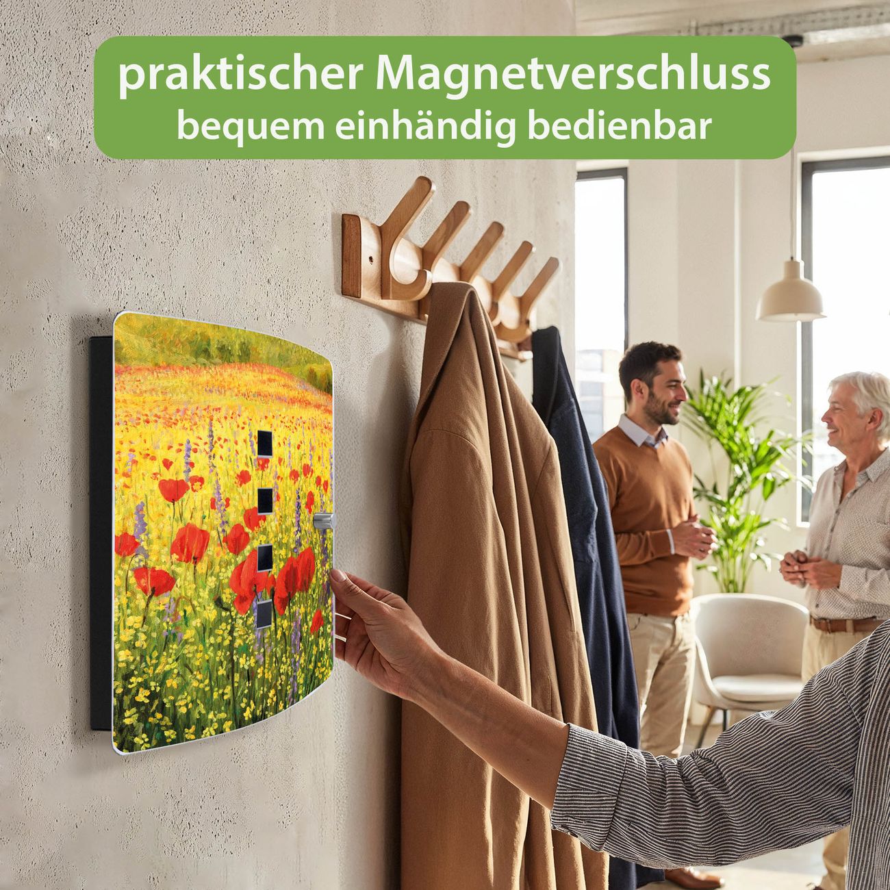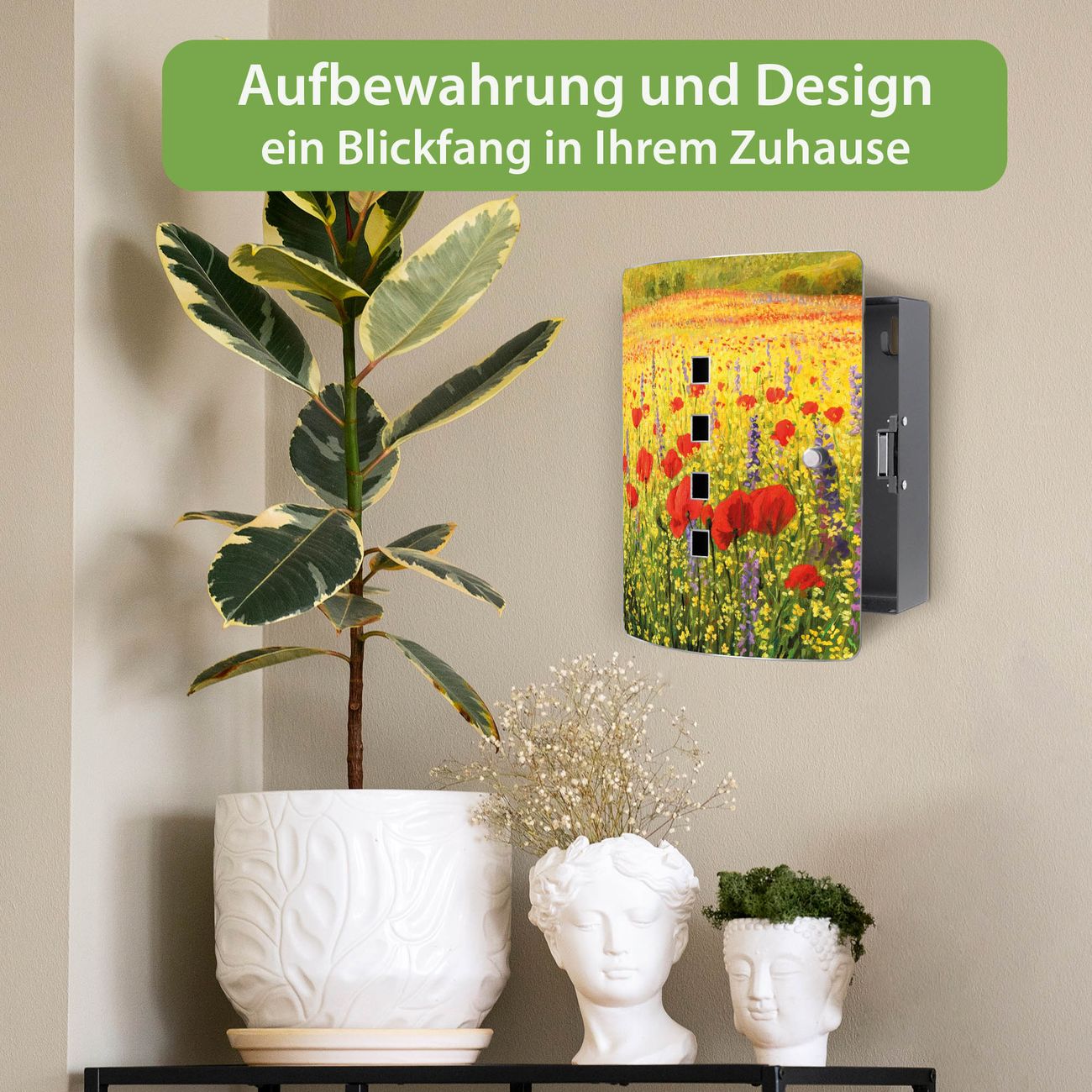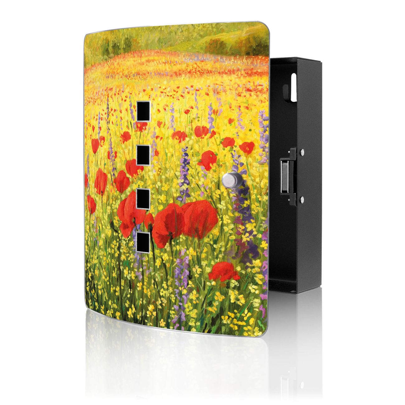 Funktion / Nutzen: Die leicht geschwungene Edelstahltür ist mit einer hochwertigen Motivfolie und dem Motiv Motiv Feld Mit Mohnblumen kaschiert. Ein praktischer Magnetverschluss ermöglicht Ihnen ein schnelles Öffnen und Schließen. Befestigt wird der Schlüsselkasten an 2 Stellen auf der Rückseite, passendes Montagematerial fügen wir bereits bei.
