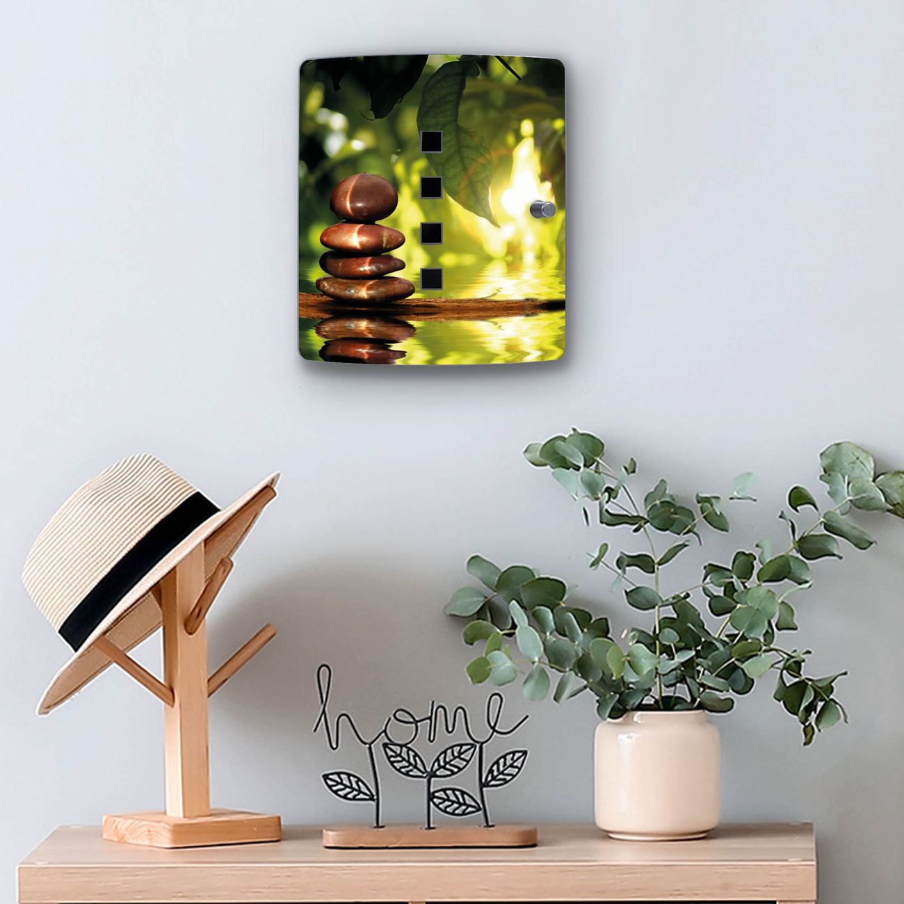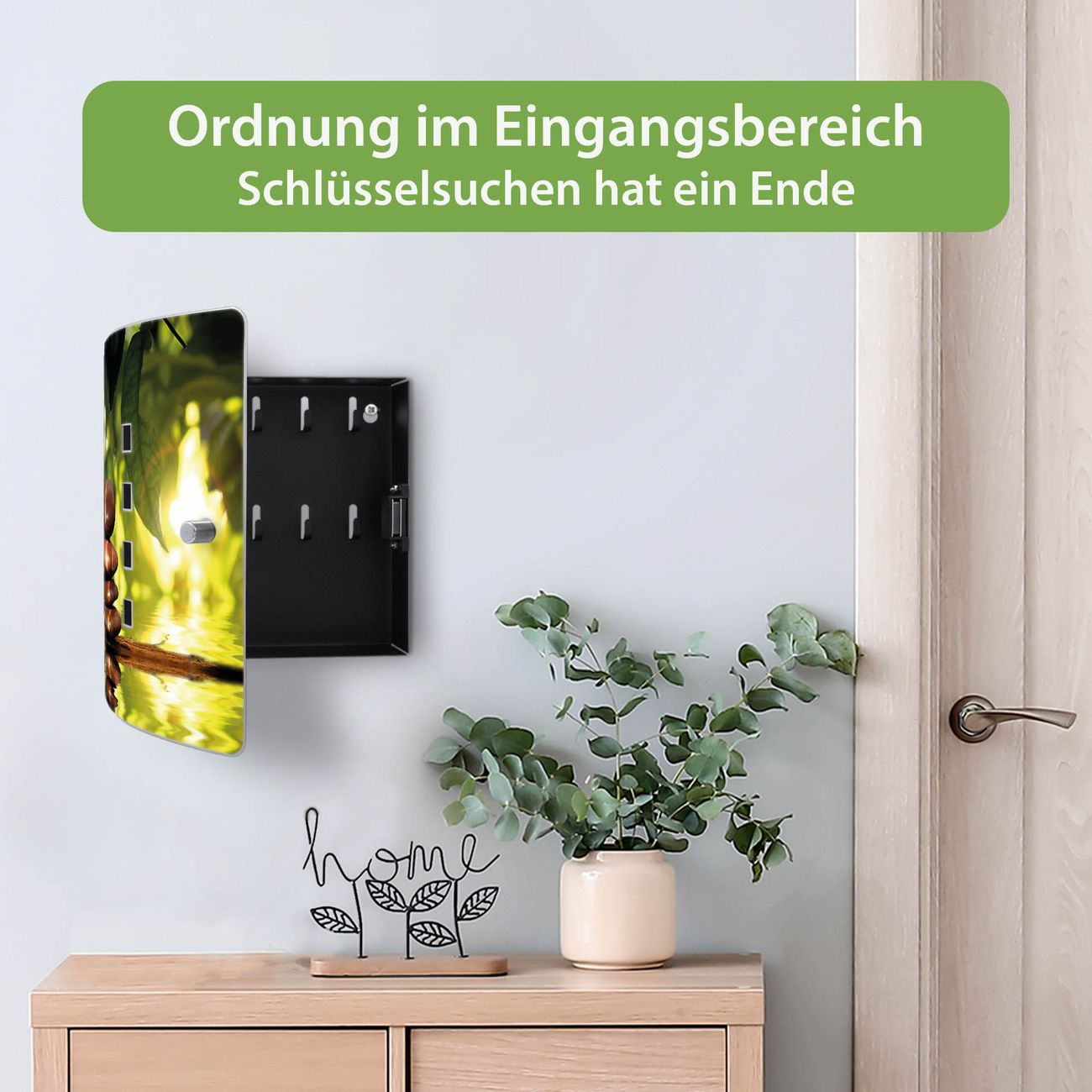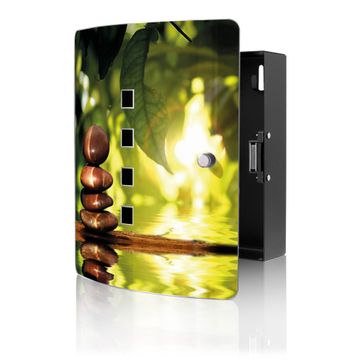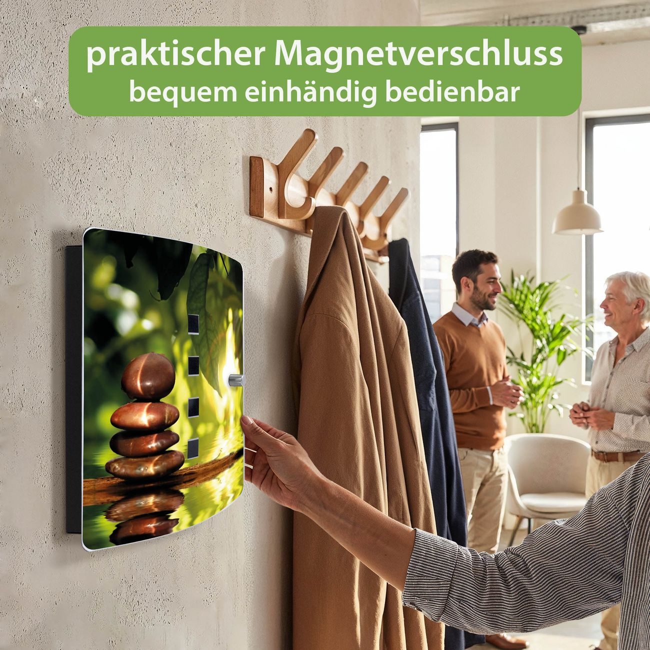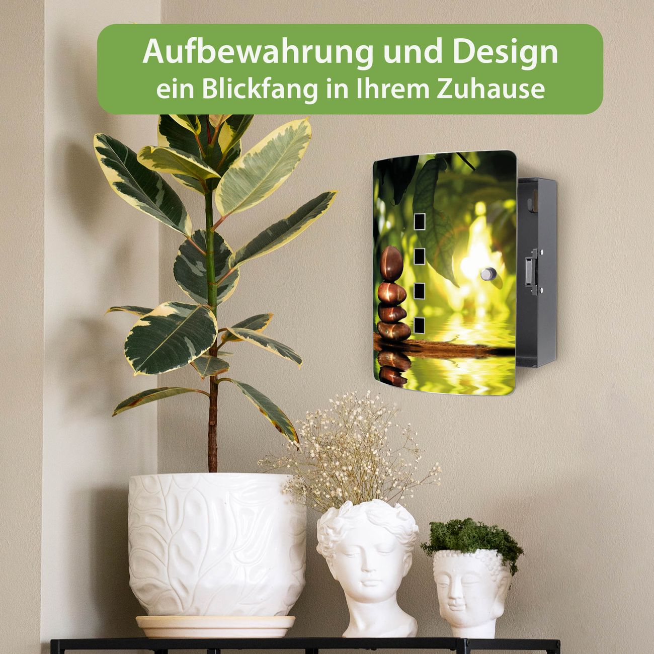 Funktion / Nutzen: Die leicht geschwungene Edelstahltür ist mit einer hochwertigen Motivfolie und dem Motiv Motiv Feng Shui kaschiert. Ein praktischer Magnetverschluss ermöglicht Ihnen ein schnelles Öffnen und Schließen. Befestigt wird der Schlüsselkasten an 2 Stellen auf der Rückseite, passendes Montagematerial fügen wir bereits bei.