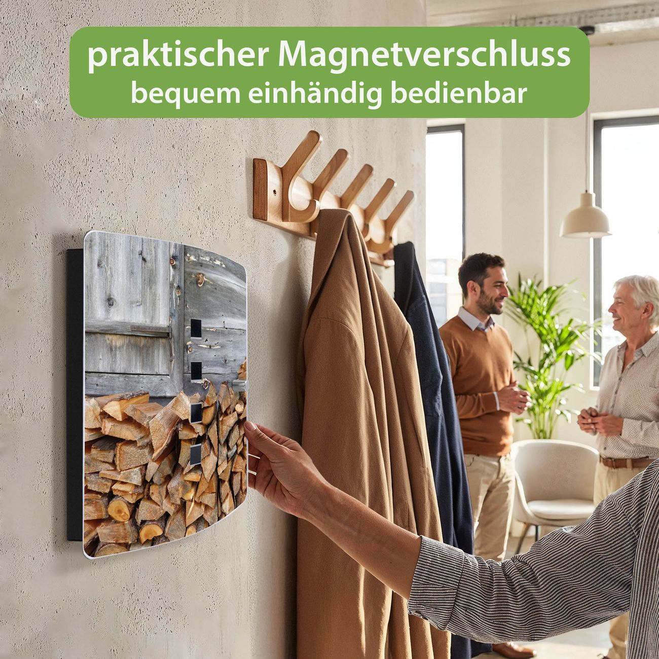 Funktion / Nutzen: Die leicht geschwungene Edelstahltür ist mit einer hochwertigen Motivfolie und dem Motiv Motiv Feuerholz kaschiert. Ein praktischer Magnetverschluss ermöglicht Ihnen ein schnelles Öffnen und Schließen. Befestigt wird der Schlüsselkasten an 2 Stellen auf der Rückseite, passendes Montagematerial fügen wir bereits bei.