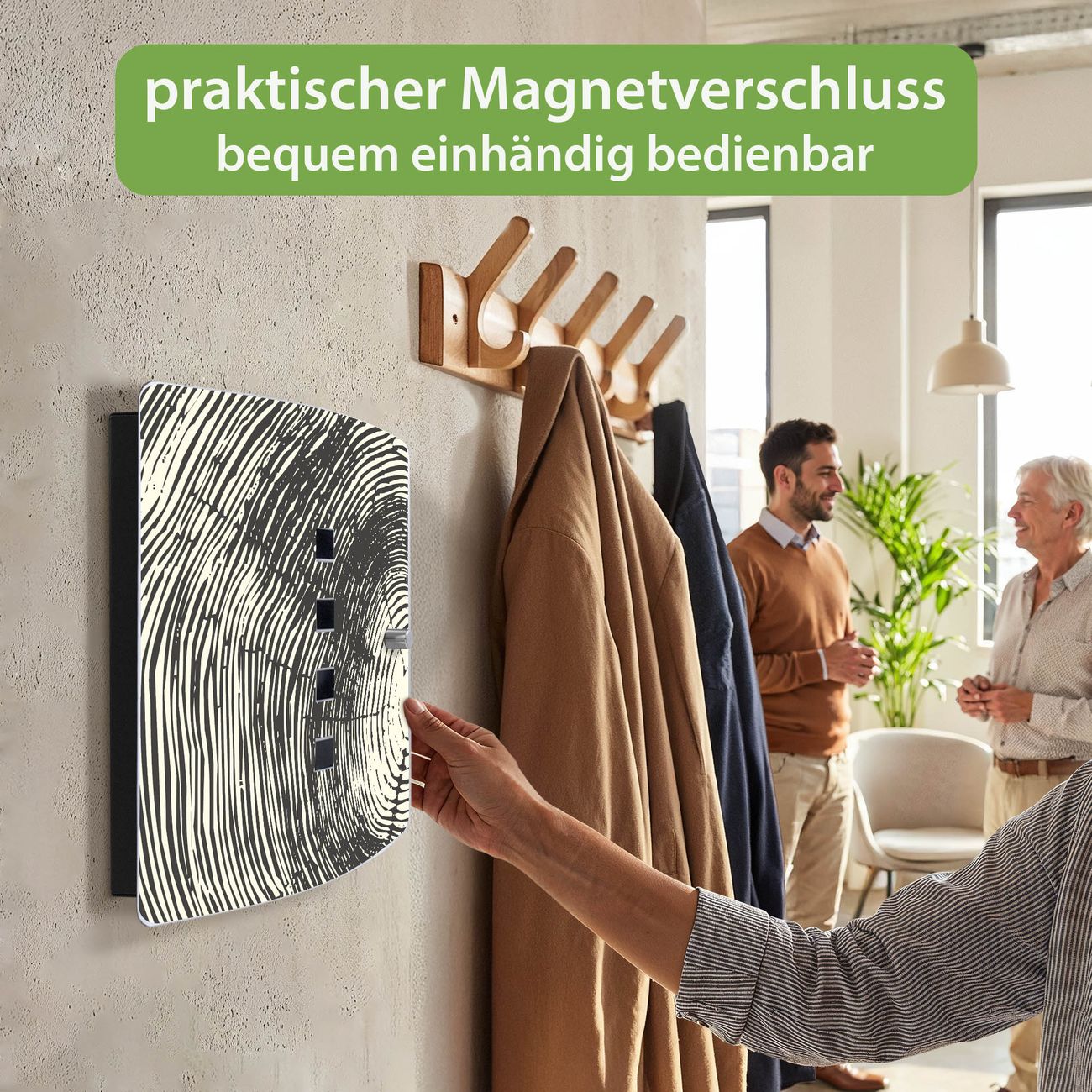 Funktion / Nutzen: Die leicht geschwungene Edelstahltür ist mit einer hochwertigen Motivfolie und dem Motiv Motiv Fingerabdruck kaschiert. Ein praktischer Magnetverschluss ermöglicht Ihnen ein schnelles Öffnen und Schließen. Befestigt wird der Schlüsselkasten an 2 Stellen auf der Rückseite, passendes Montagematerial fügen wir bereits bei.
