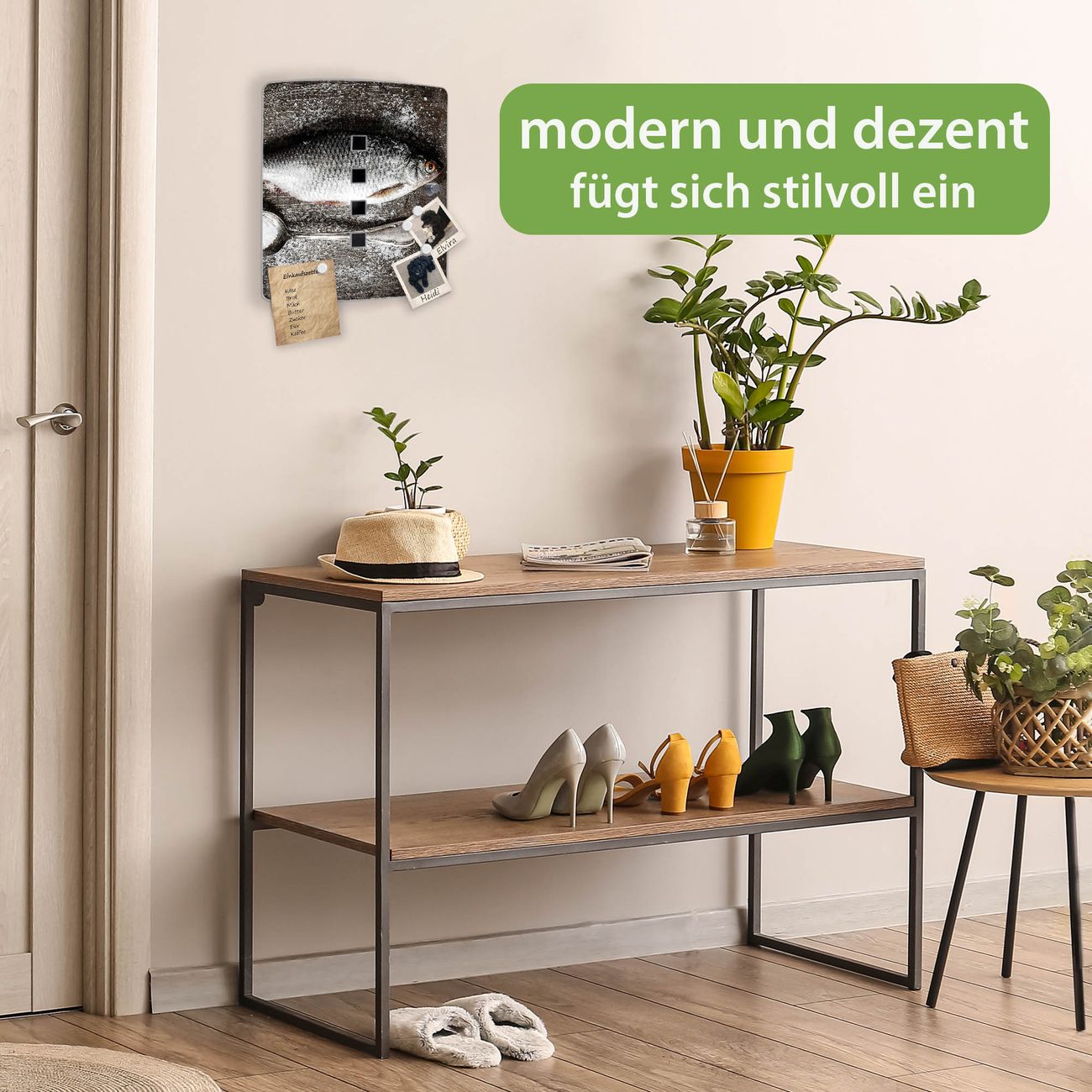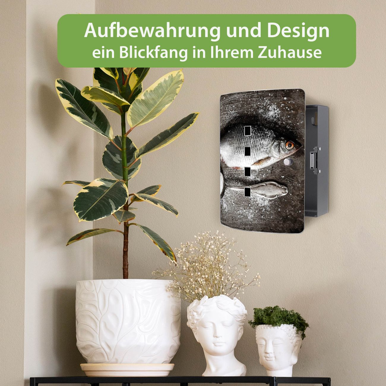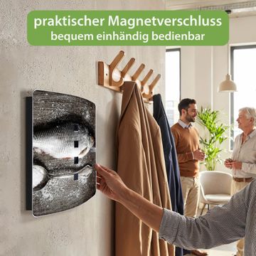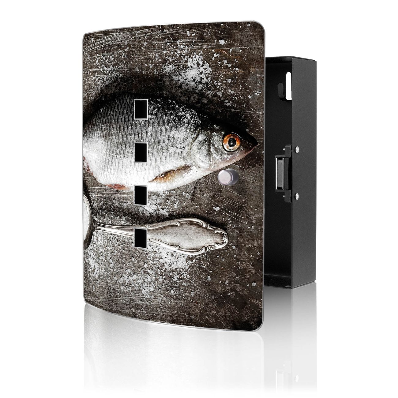 Funktion / Nutzen: Die leicht geschwungene Edelstahltür ist mit einer hochwertigen Motivfolie und dem Motiv Motiv Fisch Und Salz kaschiert. Ein praktischer Magnetverschluss ermöglicht Ihnen ein schnelles Öffnen und Schließen. Befestigt wird der Schlüsselkasten an 2 Stellen auf der Rückseite, passendes Montagematerial fügen wir bereits bei.