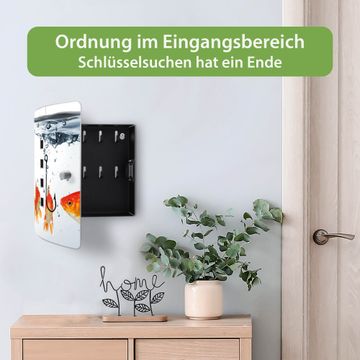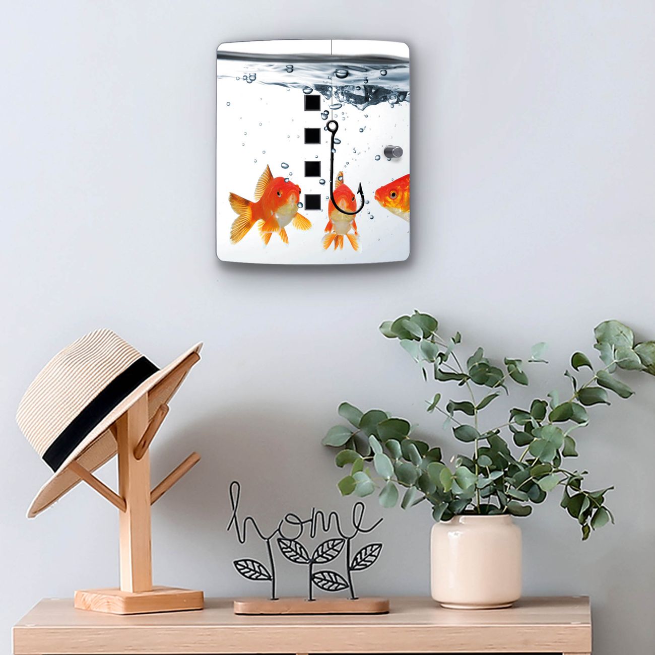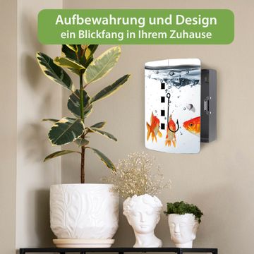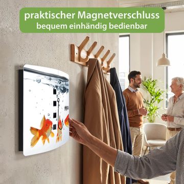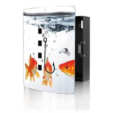 Funktion / Nutzen: Die leicht geschwungene Edelstahltür ist mit einer hochwertigen Motivfolie und dem Motiv Motiv Fische kaschiert. Ein praktischer Magnetverschluss ermöglicht Ihnen ein schnelles Öffnen und Schließen. Befestigt wird der Schlüsselkasten an 2 Stellen auf der Rückseite, passendes Montagematerial fügen wir bereits bei.