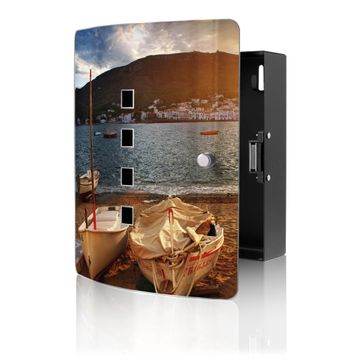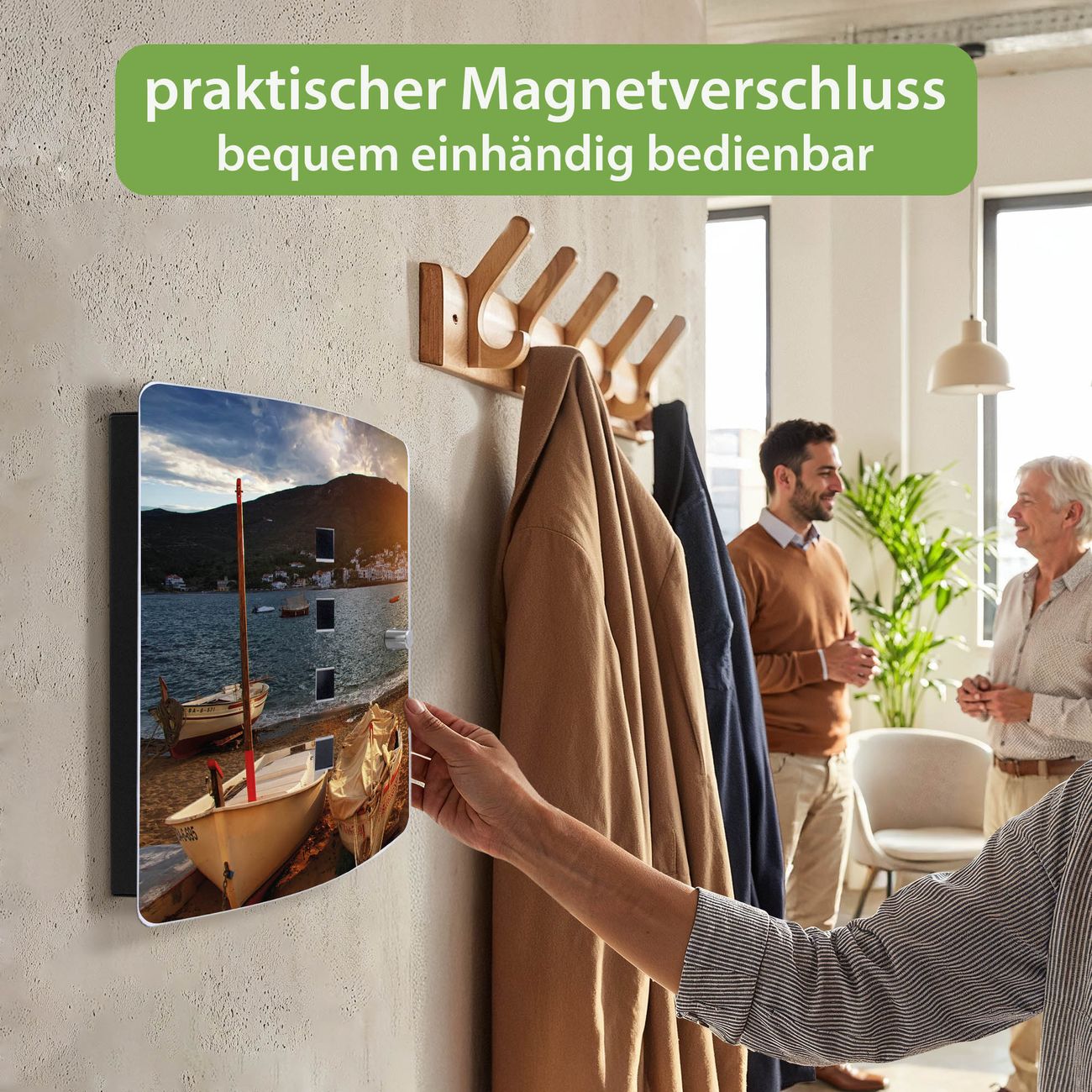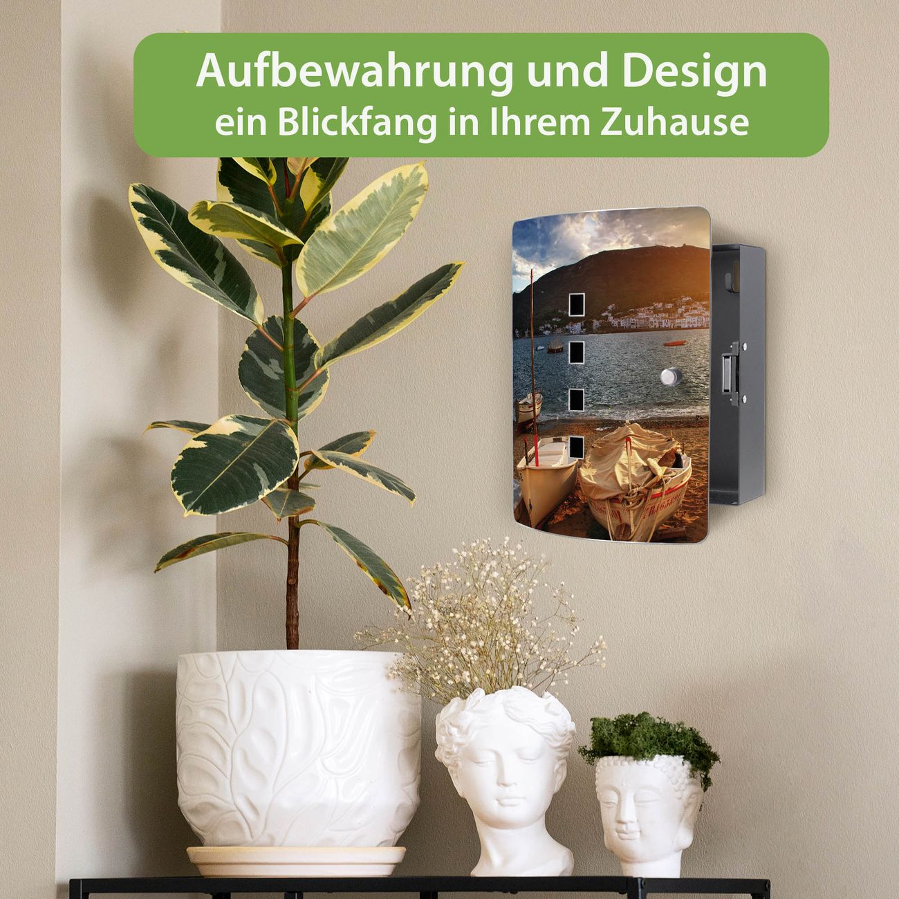 Funktion / Nutzen: Die leicht geschwungene Edelstahltür ist mit einer hochwertigen Motivfolie und dem Motiv Motiv Fischerboote kaschiert. Ein praktischer Magnetverschluss ermöglicht Ihnen ein schnelles Öffnen und Schließen. Befestigt wird der Schlüsselkasten an 2 Stellen auf der Rückseite, passendes Montagematerial fügen wir bereits bei.