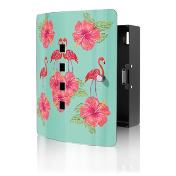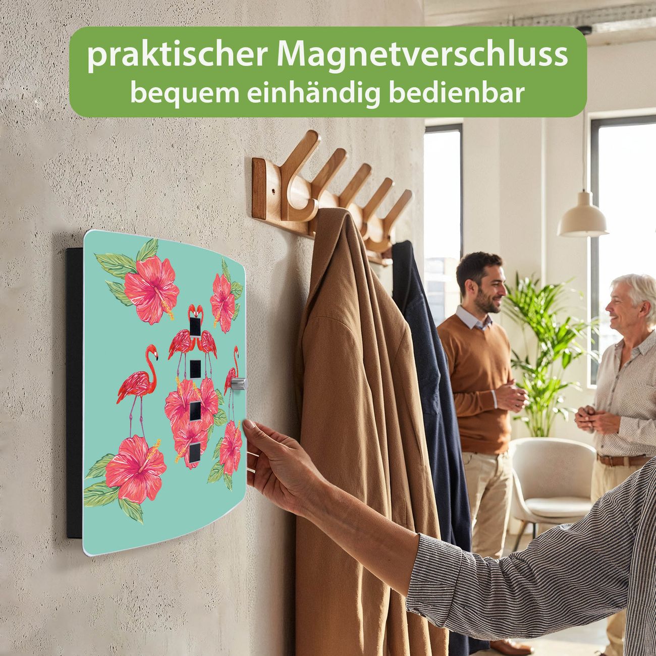 Funktion / Nutzen: Die leicht geschwungene Edelstahltür ist mit einer hochwertigen Motivfolie und dem Motiv Motiv Flamingo Liebe kaschiert. Ein praktischer Magnetverschluss ermöglicht Ihnen ein schnelles Öffnen und Schließen. Befestigt wird der Schlüsselkasten an 2 Stellen auf der Rückseite, passendes Montagematerial fügen wir bereits bei.