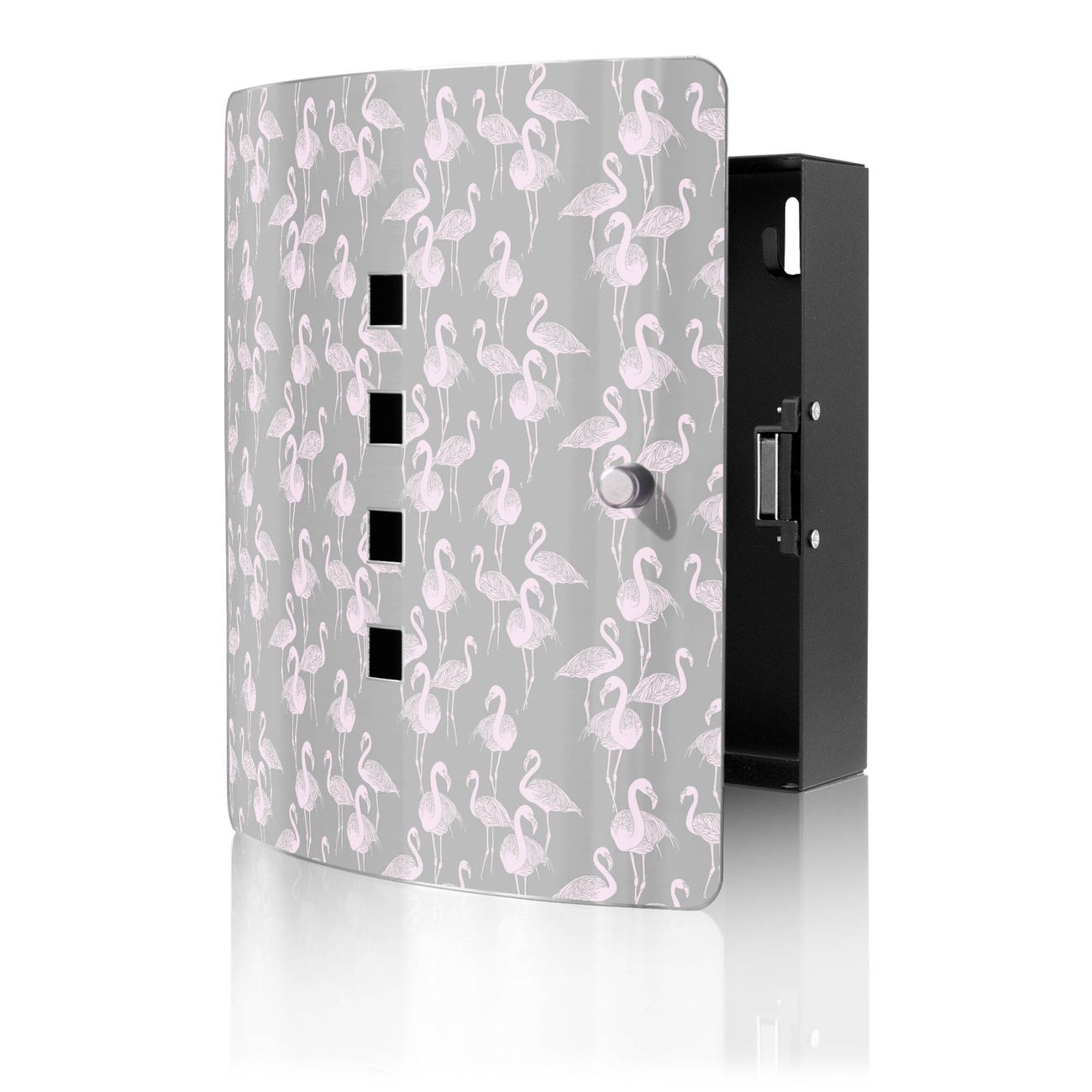 Funktion / Nutzen: Die leicht geschwungene Edelstahltür ist mit einer hochwertigen Motivfolie und dem Motiv Motiv Flamingos Blass kaschiert. Ein praktischer Magnetverschluss ermöglicht Ihnen ein schnelles Öffnen und Schließen. Befestigt wird der Schlüsselkasten an 2 Stellen auf der Rückseite, passendes Montagematerial fügen wir bereits bei.