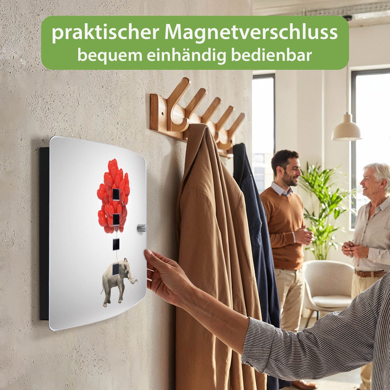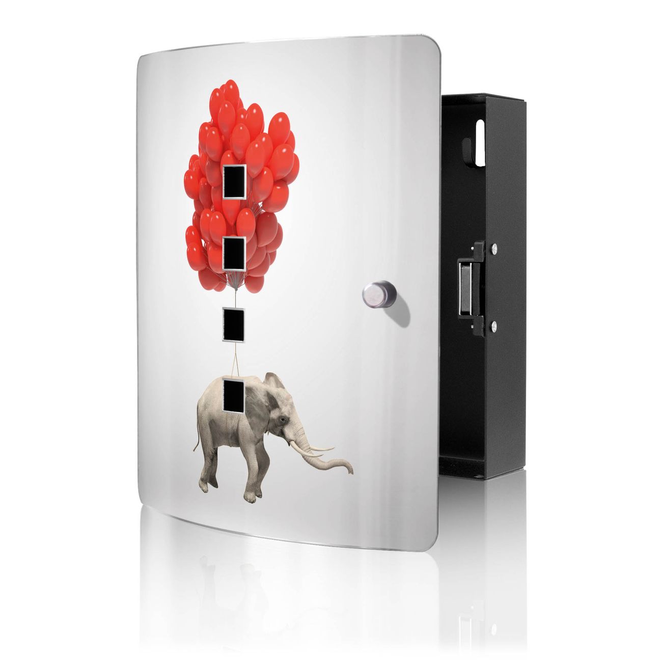 Funktion / Nutzen: Die leicht geschwungene Edelstahltür ist mit einer hochwertigen Motivfolie und dem Motiv Motiv Fliegender Elefant kaschiert. Ein praktischer Magnetverschluss ermöglicht Ihnen ein schnelles Öffnen und Schließen. Befestigt wird der Schlüsselkasten an 2 Stellen auf der Rückseite, passendes Montagematerial fügen wir bereits bei.