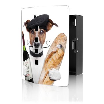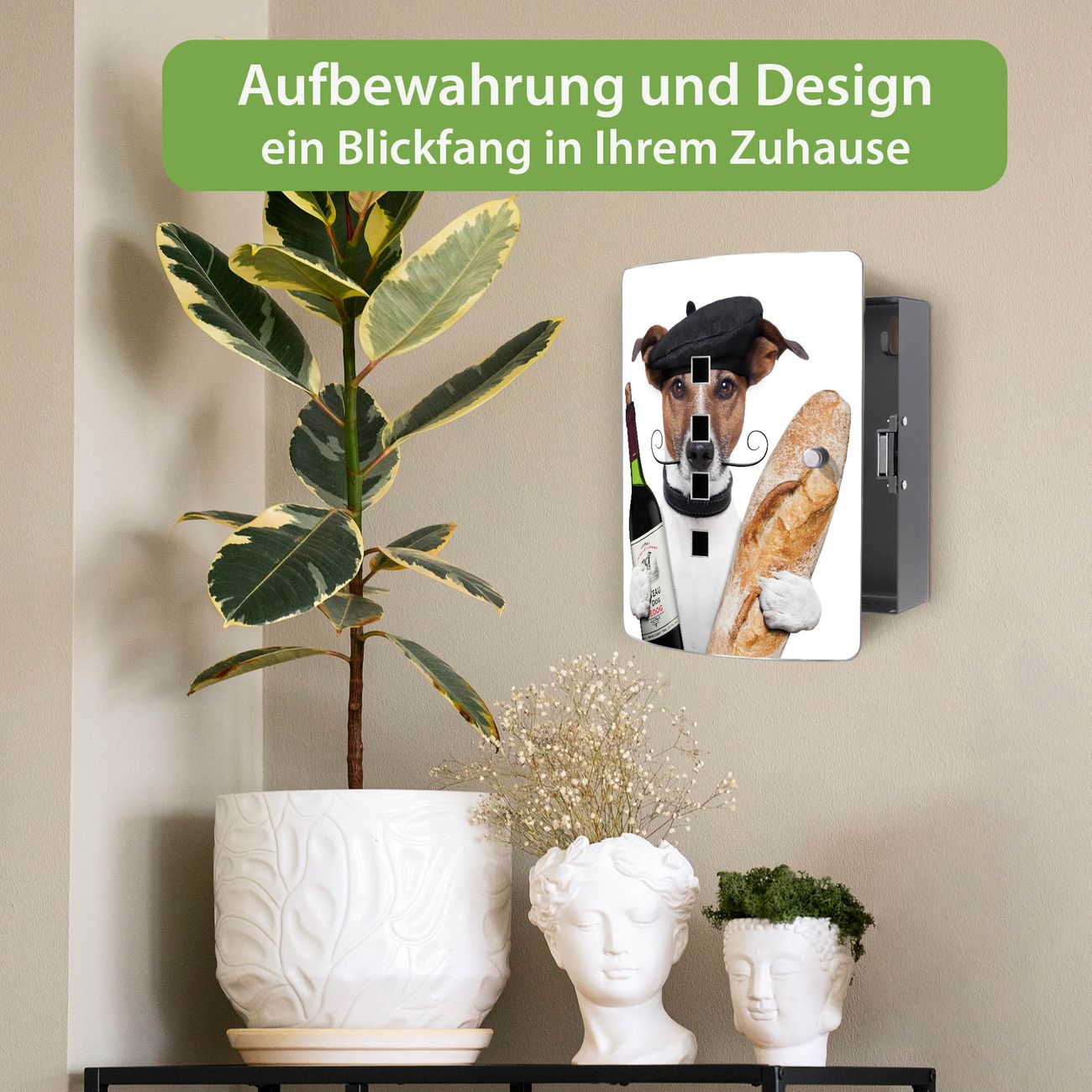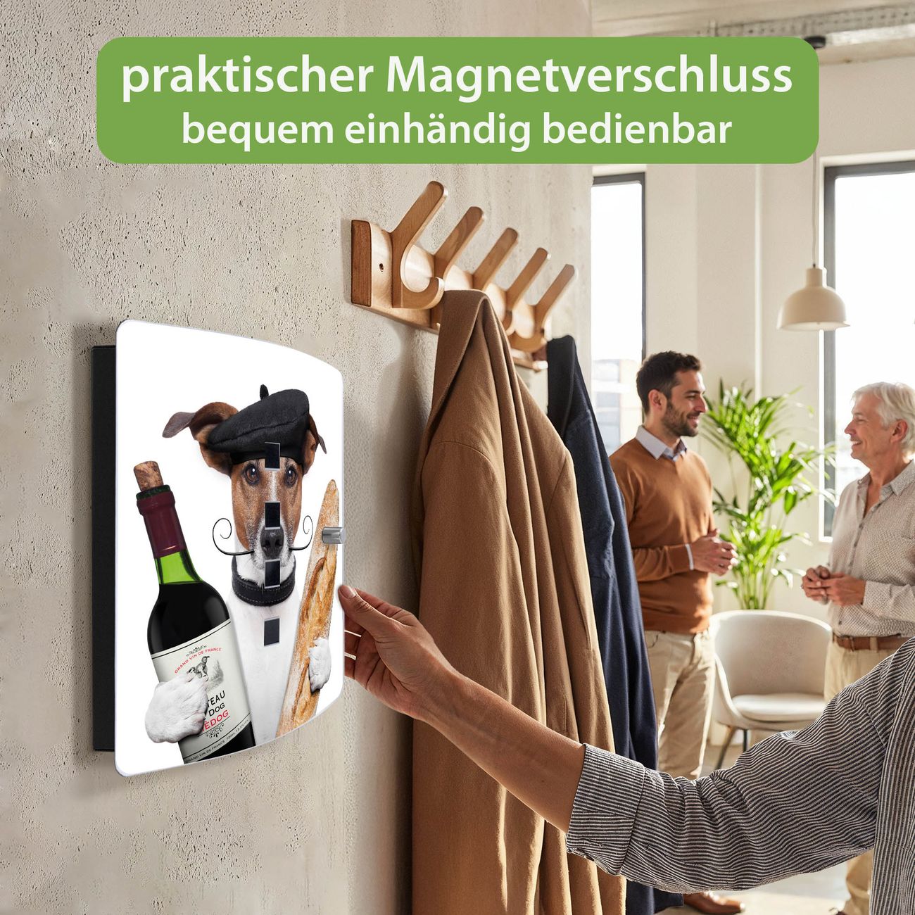 Funktion / Nutzen: Die leicht geschwungene Edelstahltür ist mit einer hochwertigen Motivfolie und dem Motiv Motiv Franzose Jack Russel kaschiert. Ein praktischer Magnetverschluss ermöglicht Ihnen ein schnelles Öffnen und Schließen. Befestigt wird der Schlüsselkasten an 2 Stellen auf der Rückseite, passendes Montagematerial fügen wir bereits bei.