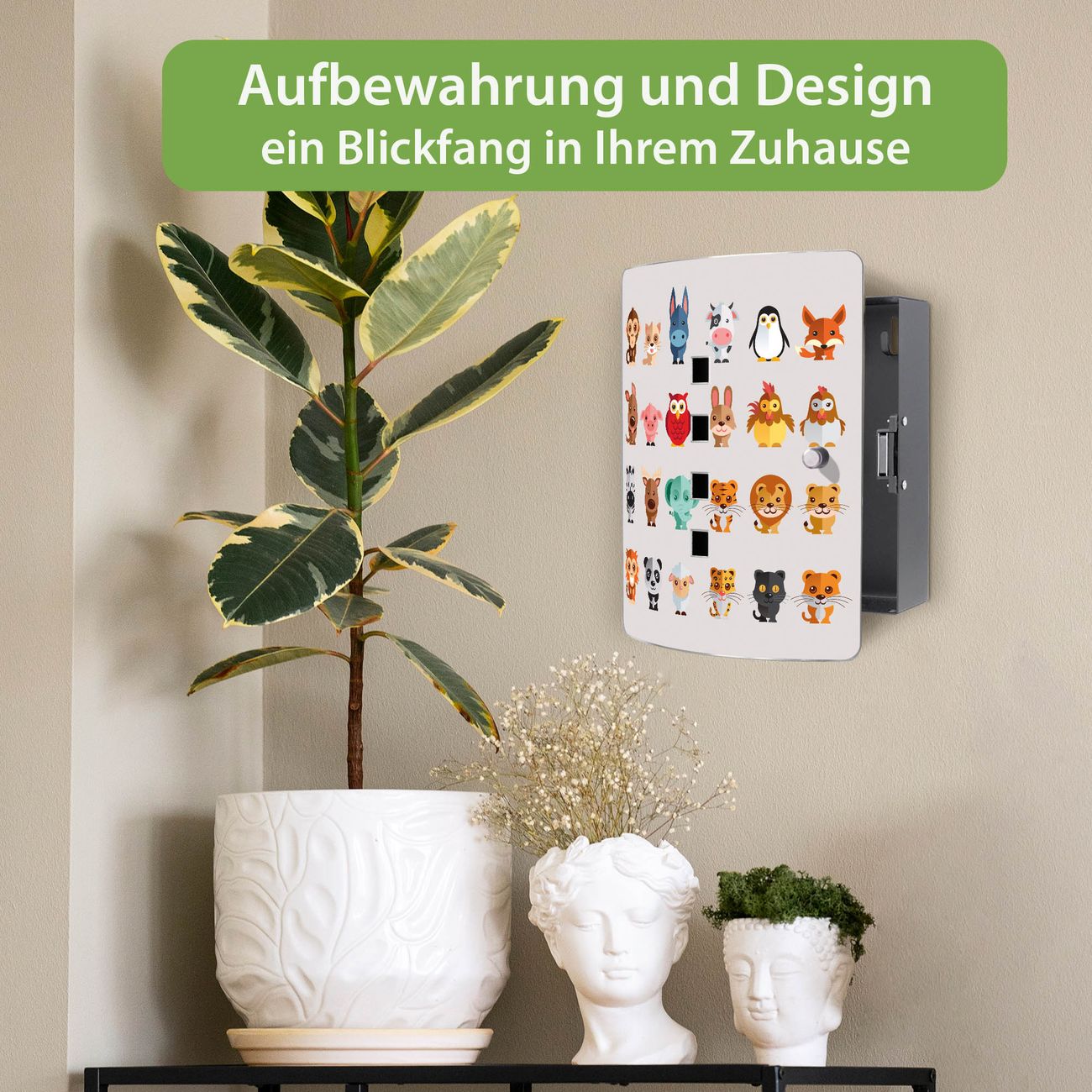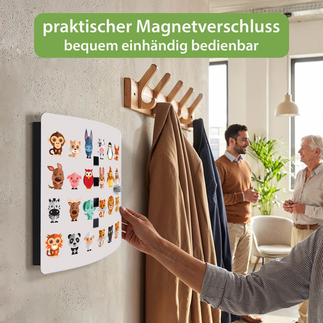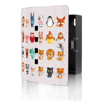 Funktion / Nutzen: Die leicht geschwungene Edelstahltür ist mit einer hochwertigen Motivfolie und dem Motiv Motiv Freunde kaschiert. Ein praktischer Magnetverschluss ermöglicht Ihnen ein schnelles Öffnen und Schließen. Befestigt wird der Schlüsselkasten an 2 Stellen auf der Rückseite, passendes Montagematerial fügen wir bereits bei.