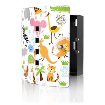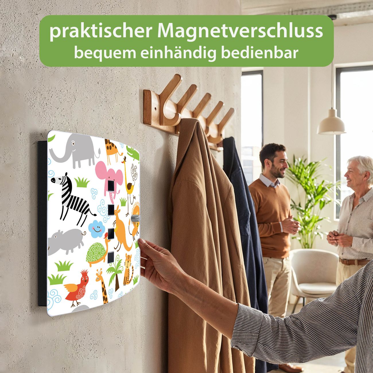 Funktion / Nutzen: Die leicht geschwungene Edelstahltür ist mit einer hochwertigen Motivfolie und dem Motiv Motiv Fröhliche Tiere kaschiert. Ein praktischer Magnetverschluss ermöglicht Ihnen ein schnelles Öffnen und Schließen. Befestigt wird der Schlüsselkasten an 2 Stellen auf der Rückseite, passendes Montagematerial fügen wir bereits bei.