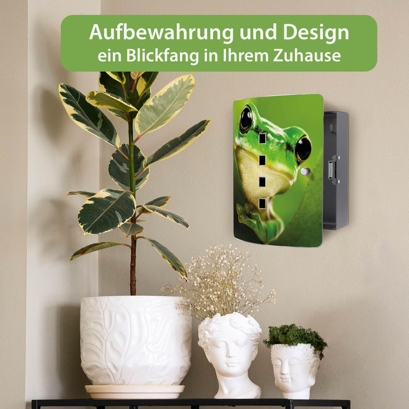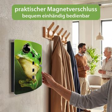 Funktion / Nutzen: Die leicht geschwungene Edelstahltür ist mit einer hochwertigen Motivfolie und dem Motiv Motiv Frosch kaschiert. Ein praktischer Magnetverschluss ermöglicht Ihnen ein schnelles Öffnen und Schließen. Befestigt wird der Schlüsselkasten an 2 Stellen auf der Rückseite, passendes Montagematerial fügen wir bereits bei.