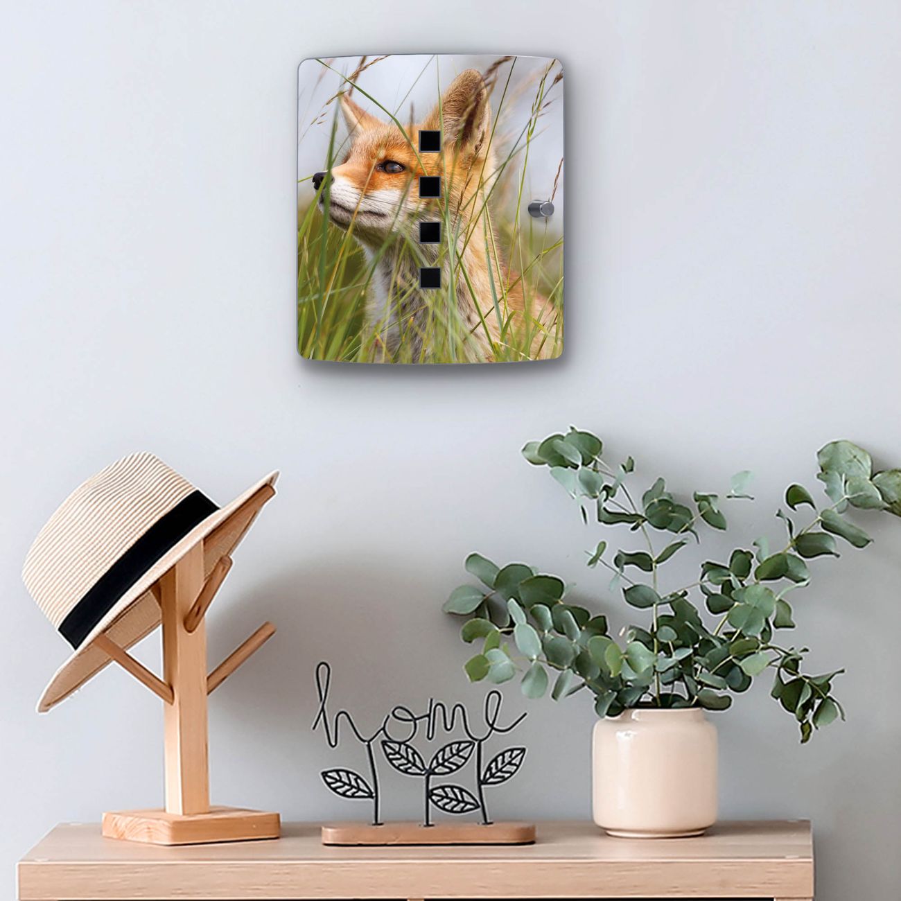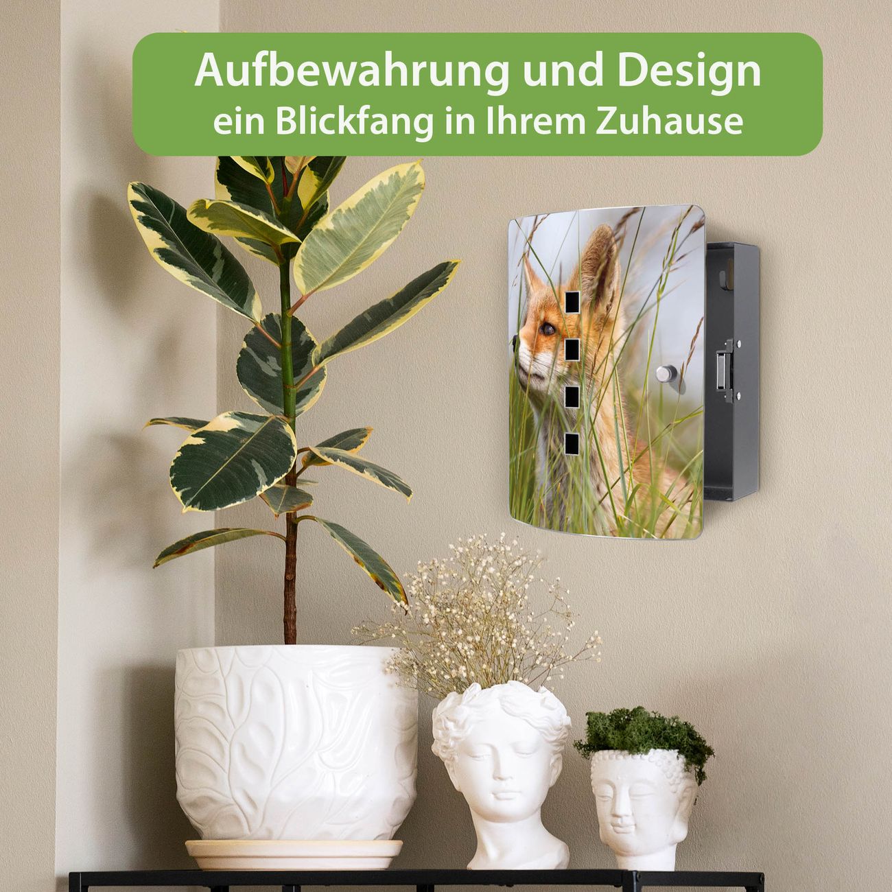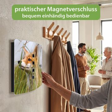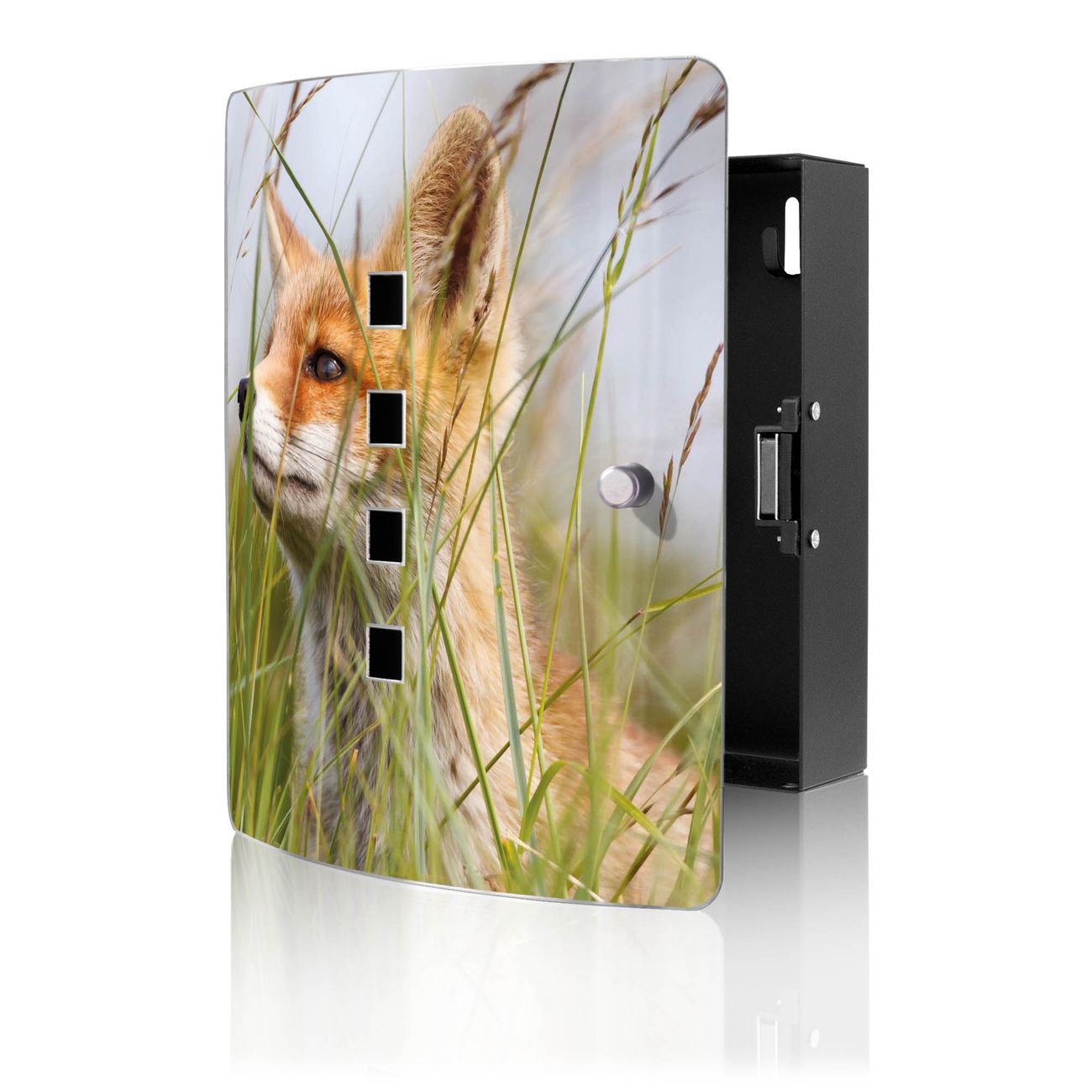 Funktion / Nutzen: Die leicht geschwungene Edelstahltür ist mit einer hochwertigen Motivfolie und dem Motiv Motiv Fuchs kaschiert. Ein praktischer Magnetverschluss ermöglicht Ihnen ein schnelles Öffnen und Schließen. Befestigt wird der Schlüsselkasten an 2 Stellen auf der Rückseite, passendes Montagematerial fügen wir bereits bei.