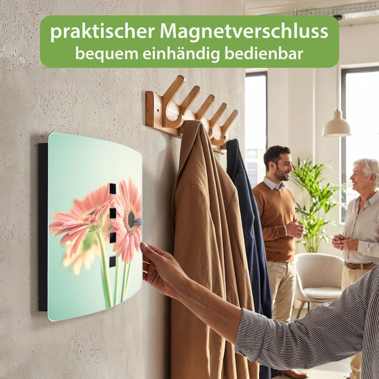 Funktion / Nutzen: Die leicht geschwungene Edelstahltür ist mit einer hochwertigen Motivfolie und dem Motiv Motiv Fünf Gerbera kaschiert. Ein praktischer Magnetverschluss ermöglicht Ihnen ein schnelles Öffnen und Schließen. Befestigt wird der Schlüsselkasten an 2 Stellen auf der Rückseite, passendes Montagematerial fügen wir bereits bei.