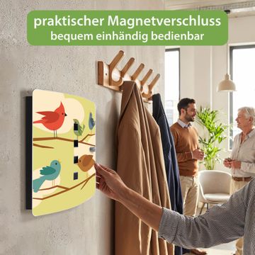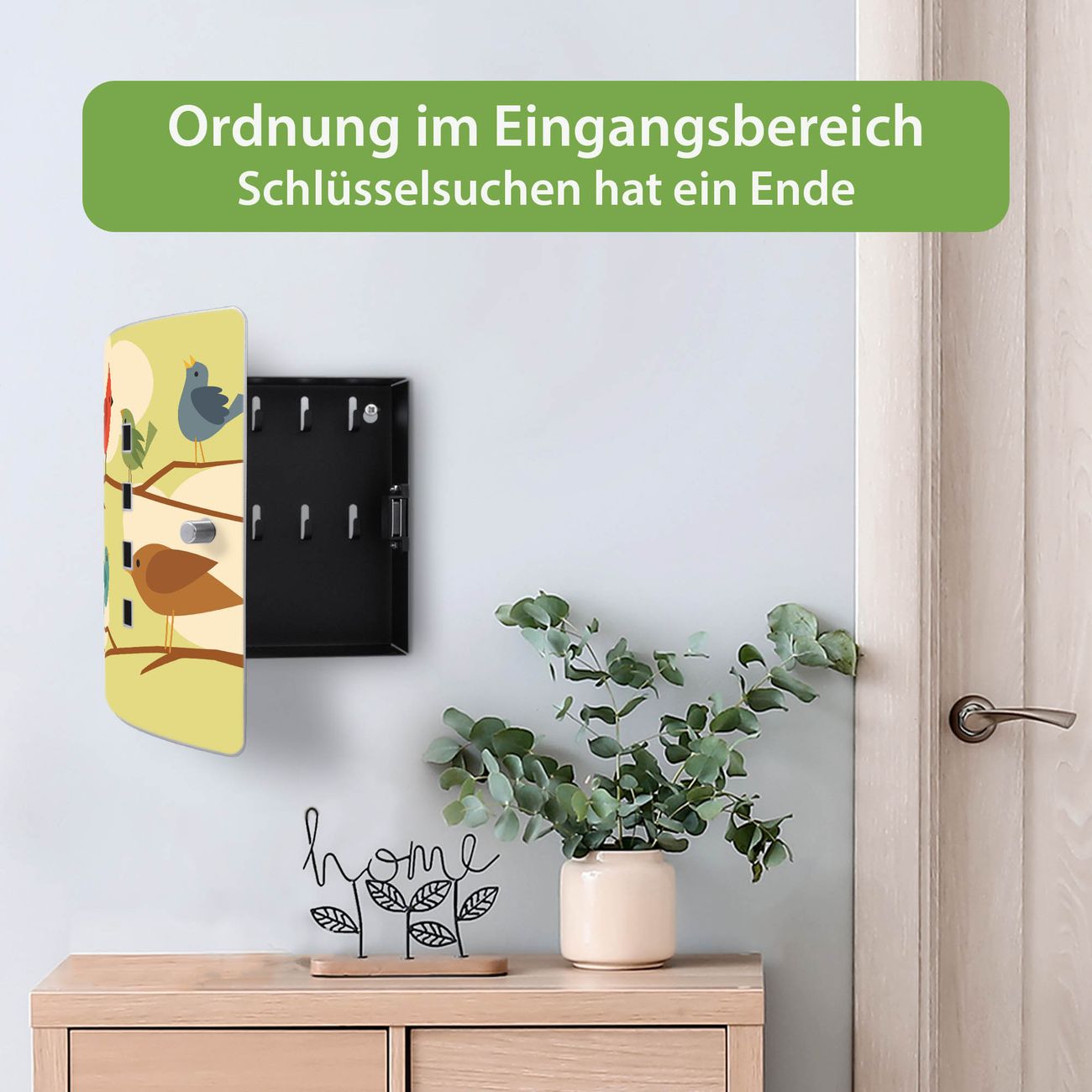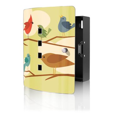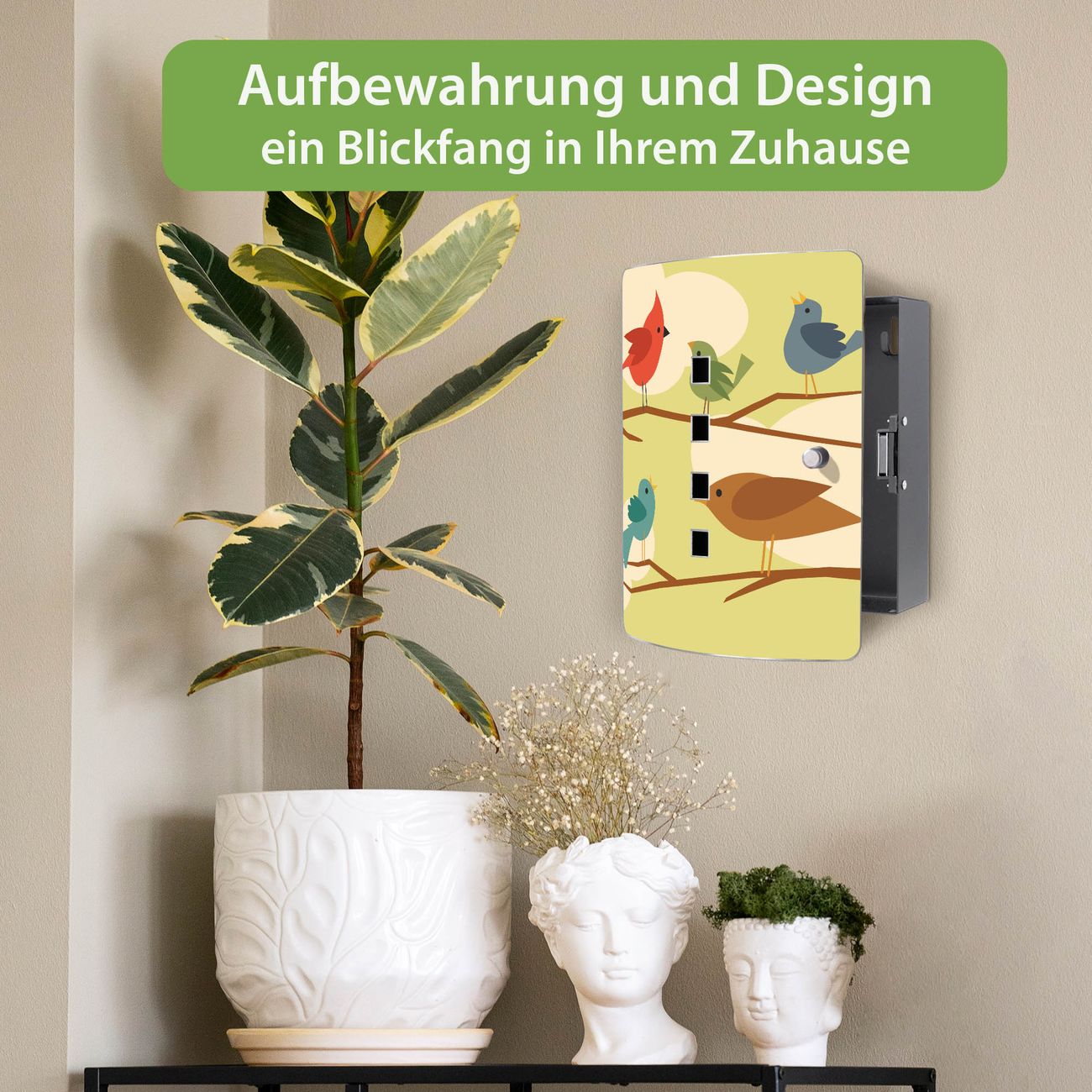 Funktion / Nutzen: Die leicht geschwungene Edelstahltür ist mit einer hochwertigen Motivfolie und dem Motiv Motiv Fünf Vögel kaschiert. Ein praktischer Magnetverschluss ermöglicht Ihnen ein schnelles Öffnen und Schließen. Befestigt wird der Schlüsselkasten an 2 Stellen auf der Rückseite, passendes Montagematerial fügen wir bereits bei.