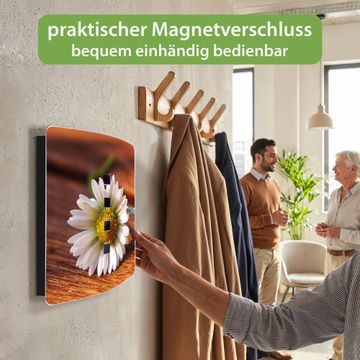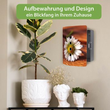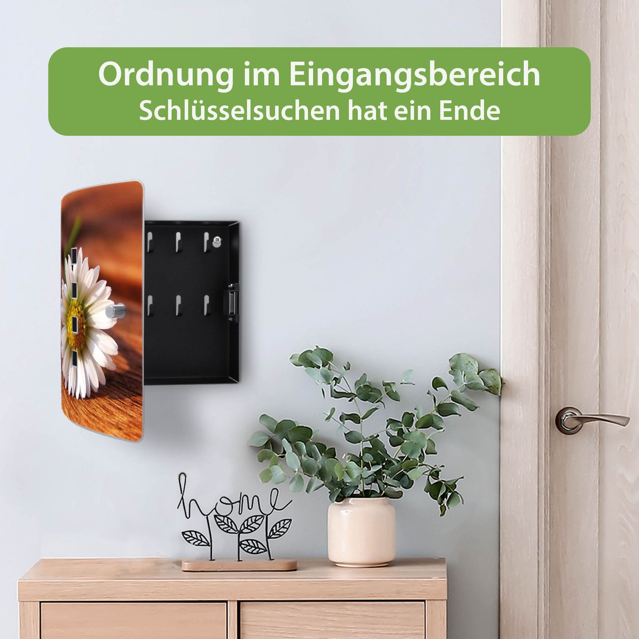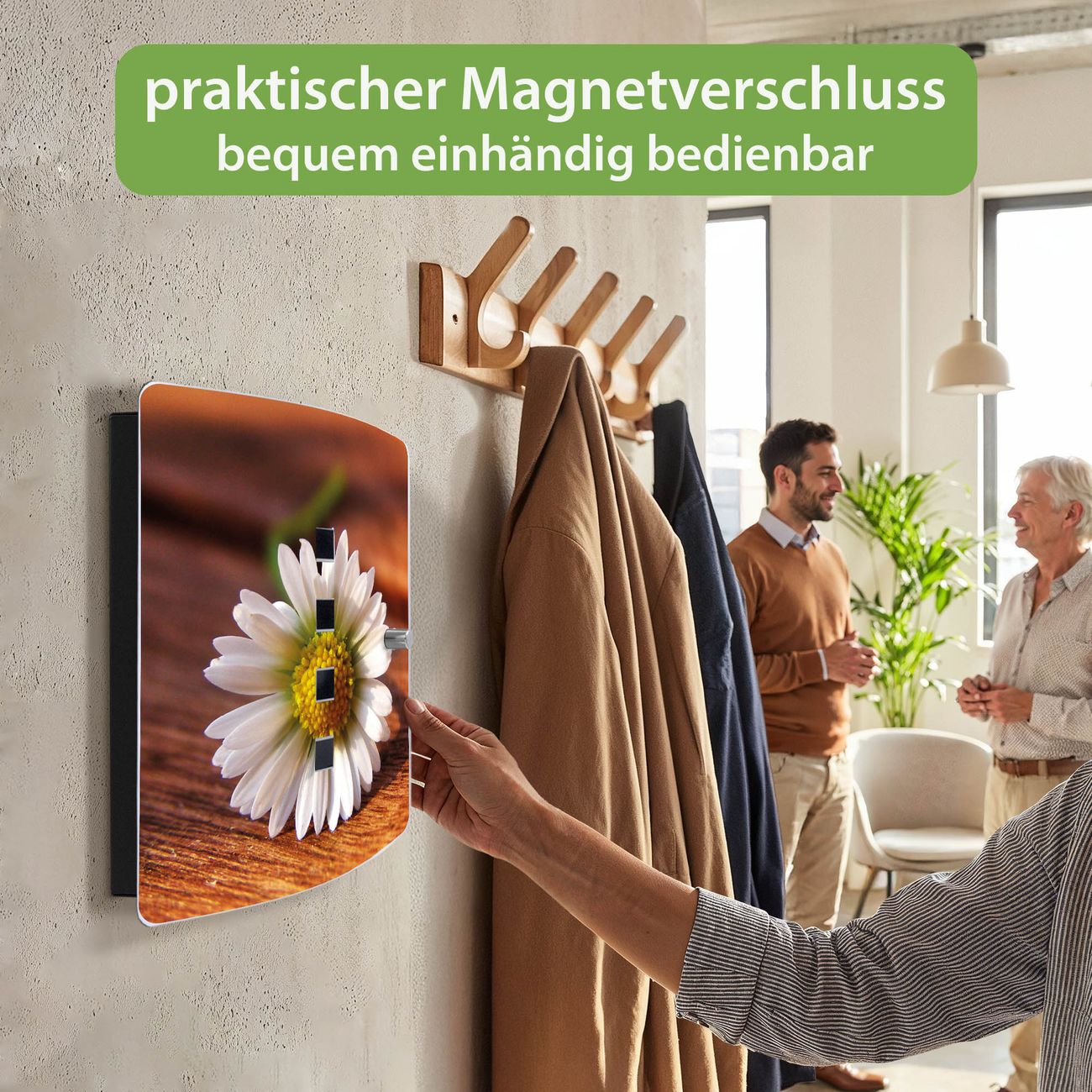 Funktion / Nutzen: Die leicht geschwungene Edelstahltür ist mit einer hochwertigen Motivfolie und dem Motiv Motiv Gänseblümchen kaschiert. Ein praktischer Magnetverschluss ermöglicht Ihnen ein schnelles Öffnen und Schließen. Befestigt wird der Schlüsselkasten an 2 Stellen auf der Rückseite, passendes Montagematerial fügen wir bereits bei.