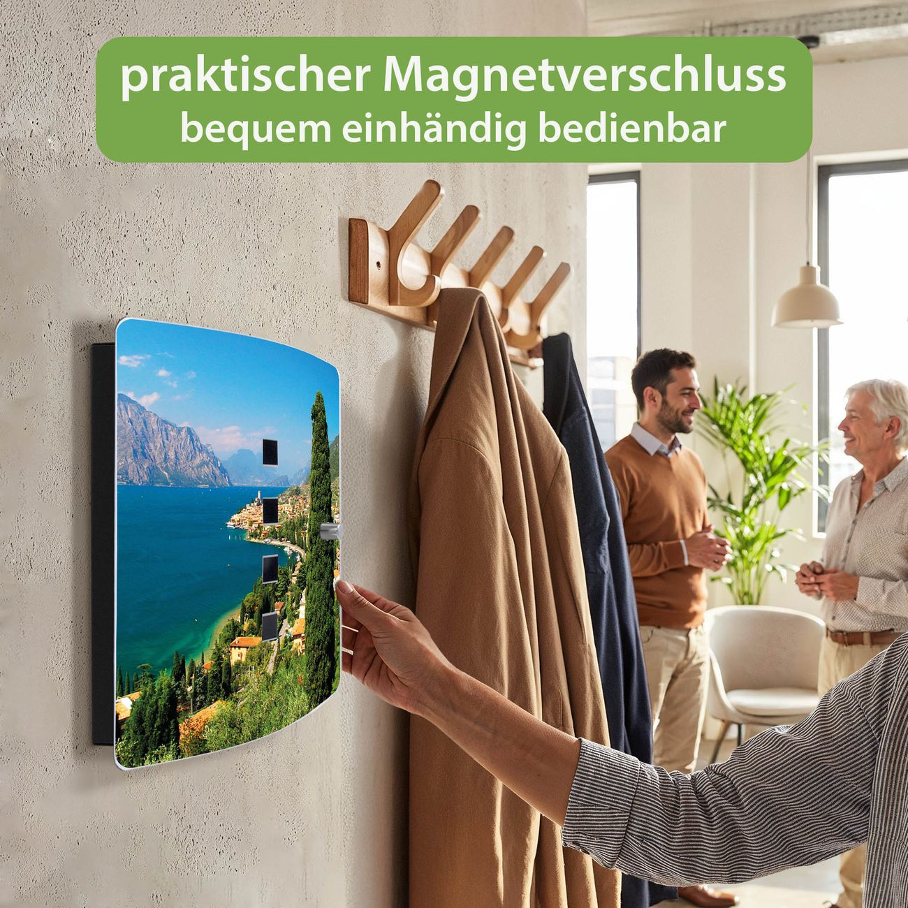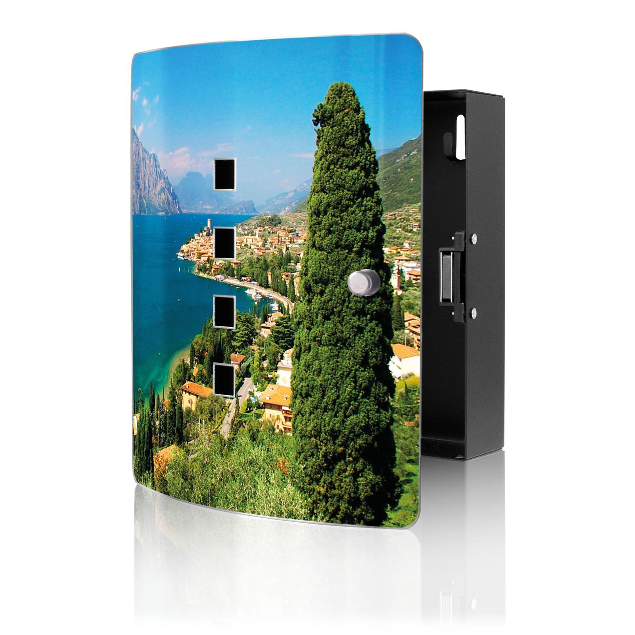 Funktion / Nutzen: Die leicht geschwungene Edelstahltür ist mit einer hochwertigen Motivfolie und dem Motiv Motiv Gardasee kaschiert. Ein praktischer Magnetverschluss ermöglicht Ihnen ein schnelles Öffnen und Schließen. Befestigt wird der Schlüsselkasten an 2 Stellen auf der Rückseite, passendes Montagematerial fügen wir bereits bei.