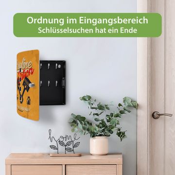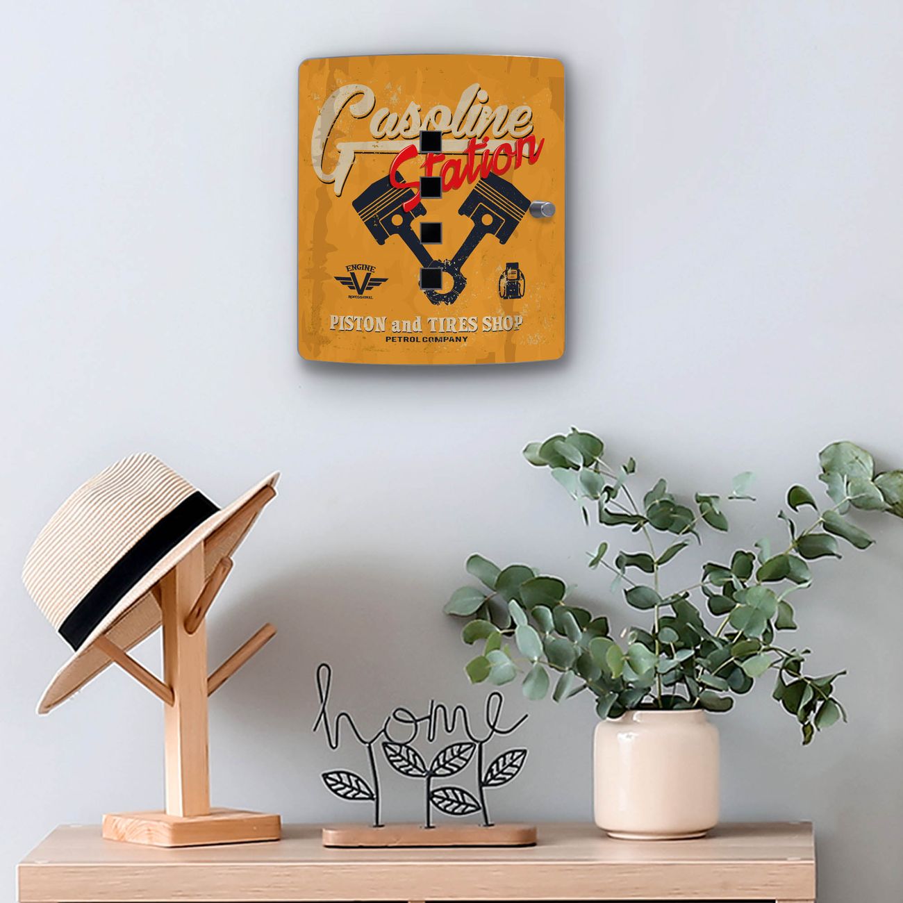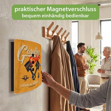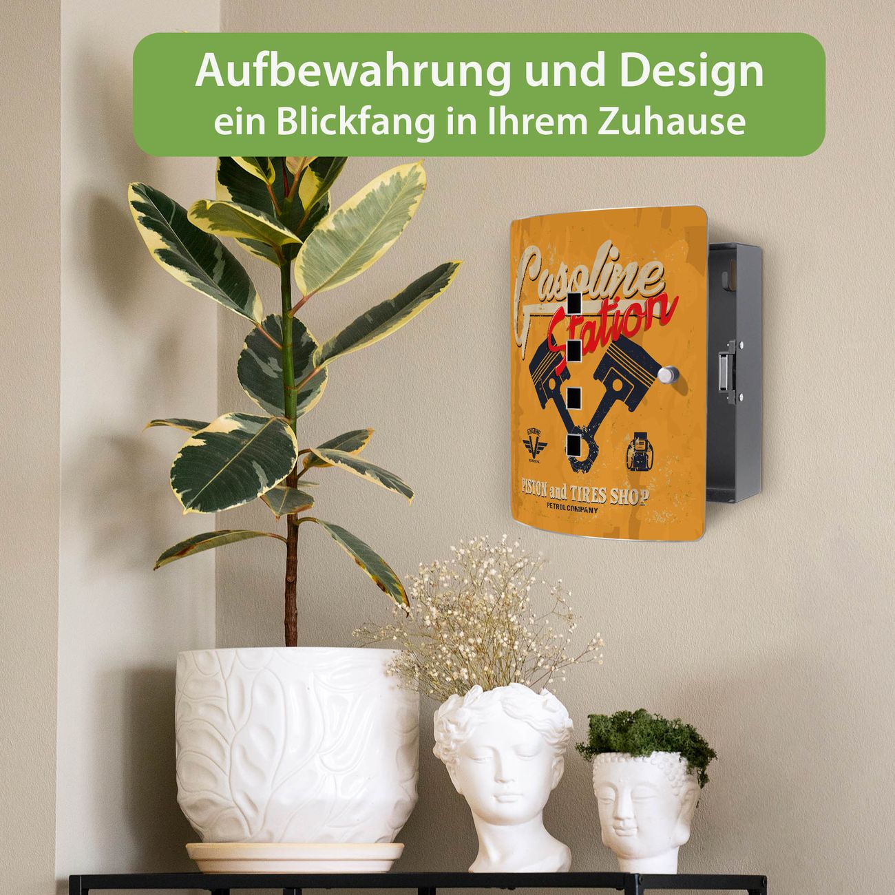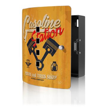 Funktion / Nutzen: Die leicht geschwungene Edelstahltür ist mit einer hochwertigen Motivfolie und dem Motiv Motiv Gasoline Station kaschiert. Ein praktischer Magnetverschluss ermöglicht Ihnen ein schnelles Öffnen und Schließen. Befestigt wird der Schlüsselkasten an 2 Stellen auf der Rückseite, passendes Montagematerial fügen wir bereits bei.