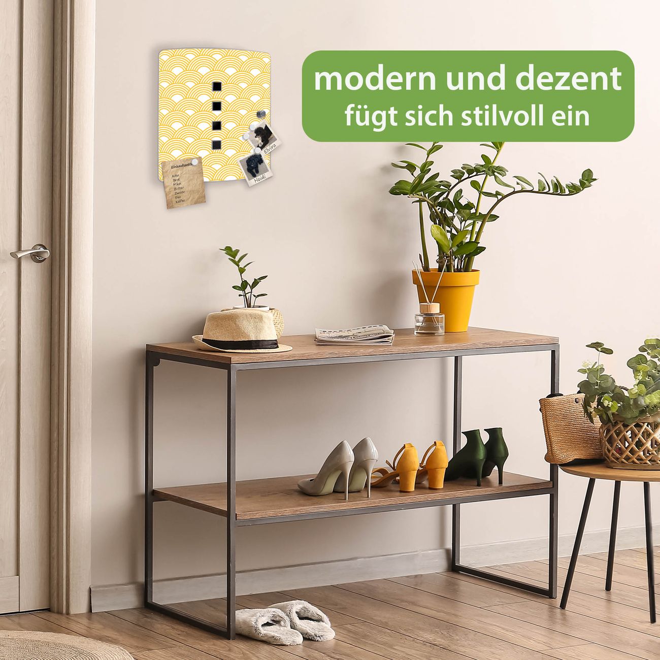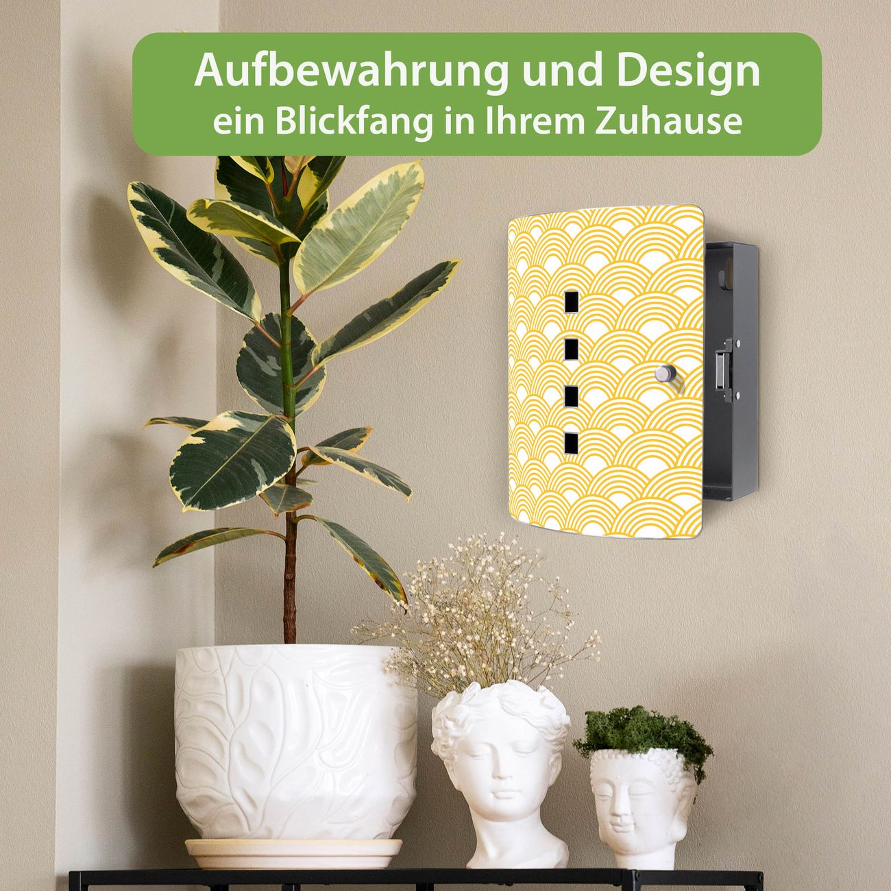 Funktion / Nutzen: Die leicht geschwungene Edelstahltür ist mit einer hochwertigen Motivfolie und dem Motiv Motiv Gelbe Wellen kaschiert. Ein praktischer Magnetverschluss ermöglicht Ihnen ein schnelles Öffnen und Schließen. Befestigt wird der Schlüsselkasten an 2 Stellen auf der Rückseite, passendes Montagematerial fügen wir bereits bei.