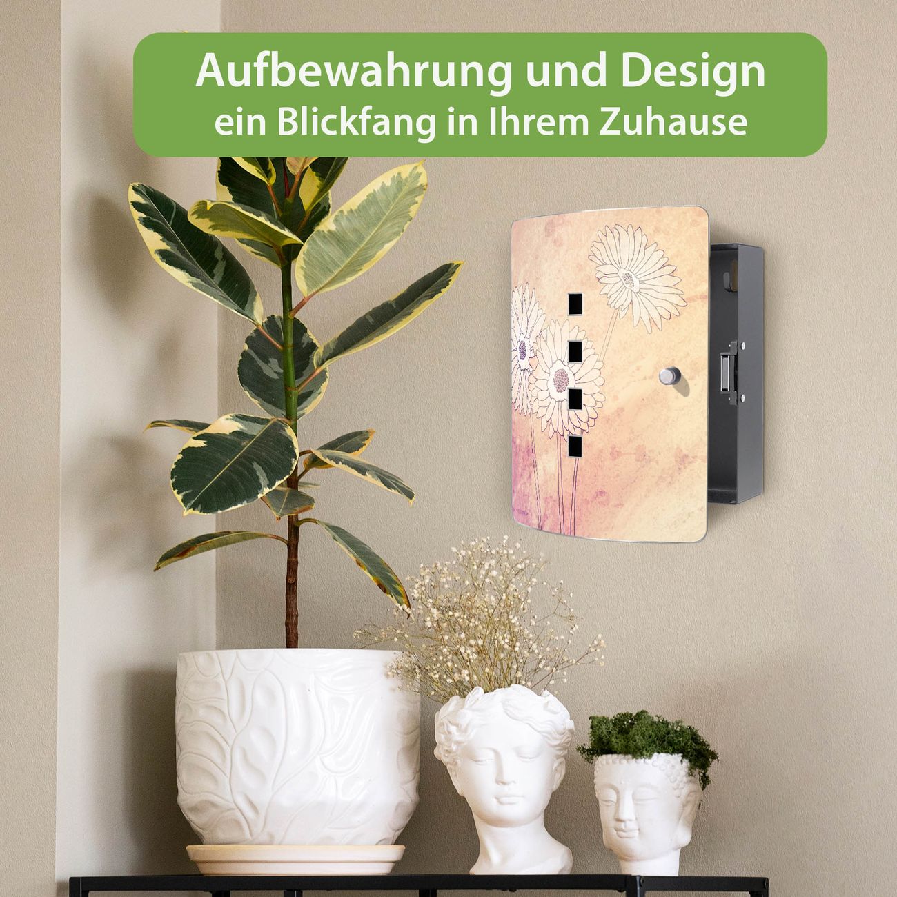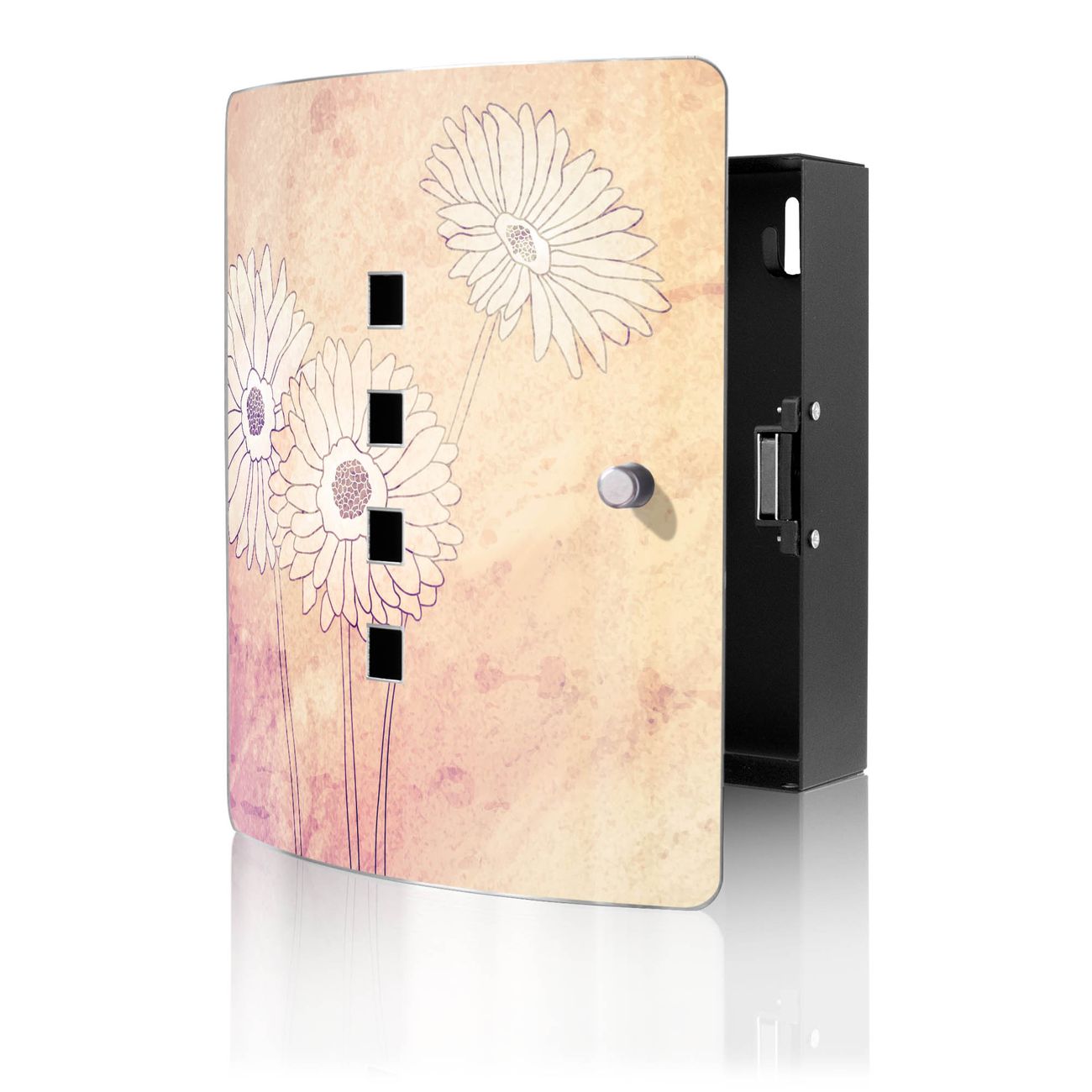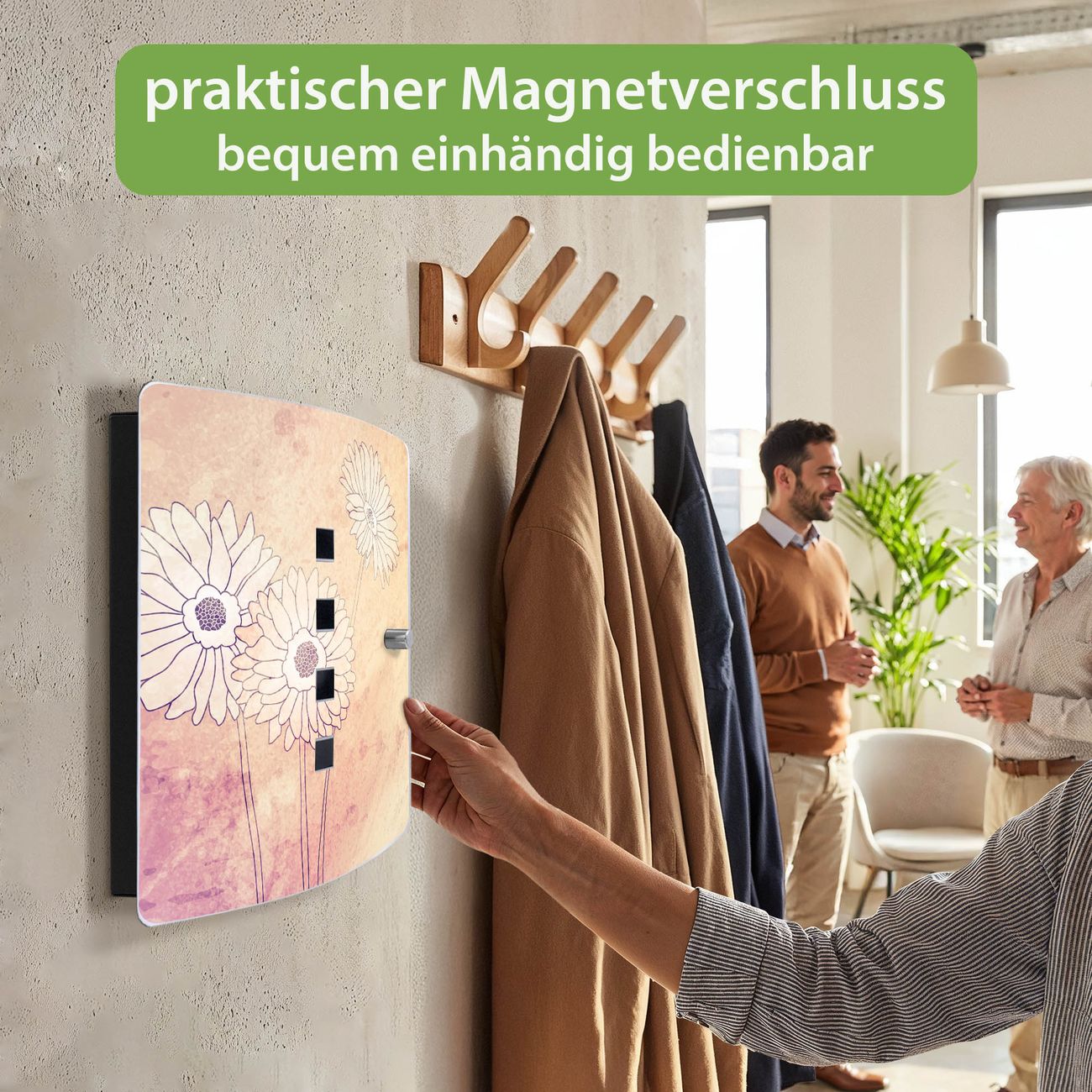 Funktion / Nutzen: Die leicht geschwungene Edelstahltür ist mit einer hochwertigen Motivfolie und dem Motiv Motiv Gerbera kaschiert. Ein praktischer Magnetverschluss ermöglicht Ihnen ein schnelles Öffnen und Schließen. Befestigt wird der Schlüsselkasten an 2 Stellen auf der Rückseite, passendes Montagematerial fügen wir bereits bei.