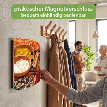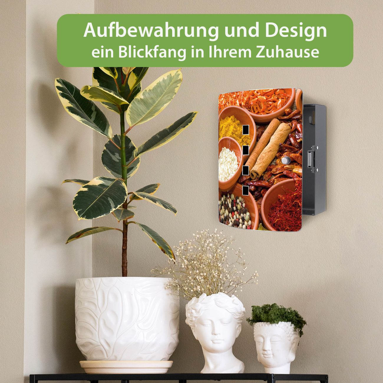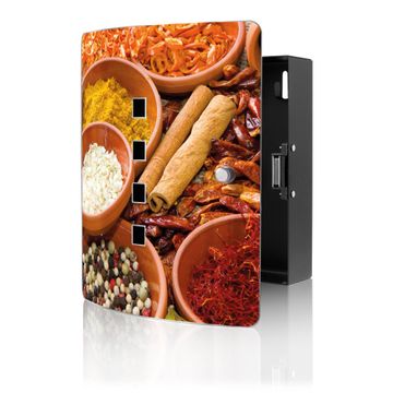 Funktion / Nutzen: Die leicht geschwungene Edelstahltür ist mit einer hochwertigen Motivfolie und dem Motiv Motiv Gewürze kaschiert. Ein praktischer Magnetverschluss ermöglicht Ihnen ein schnelles Öffnen und Schließen. Befestigt wird der Schlüsselkasten an 2 Stellen auf der Rückseite, passendes Montagematerial fügen wir bereits bei.