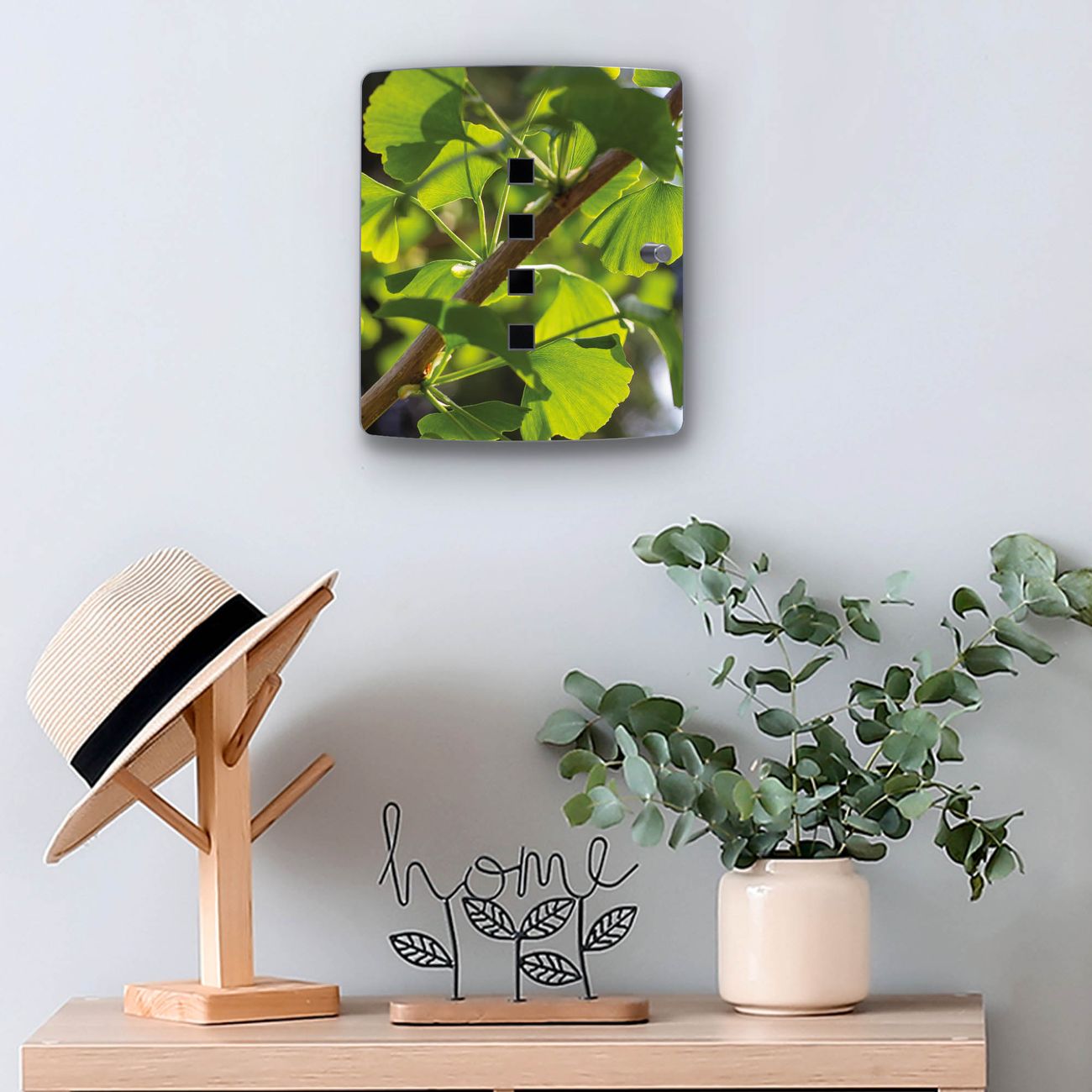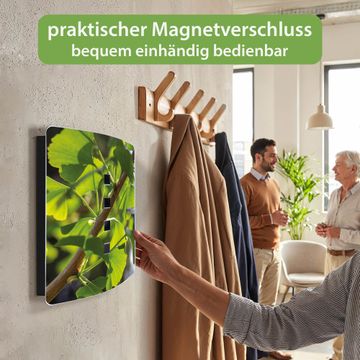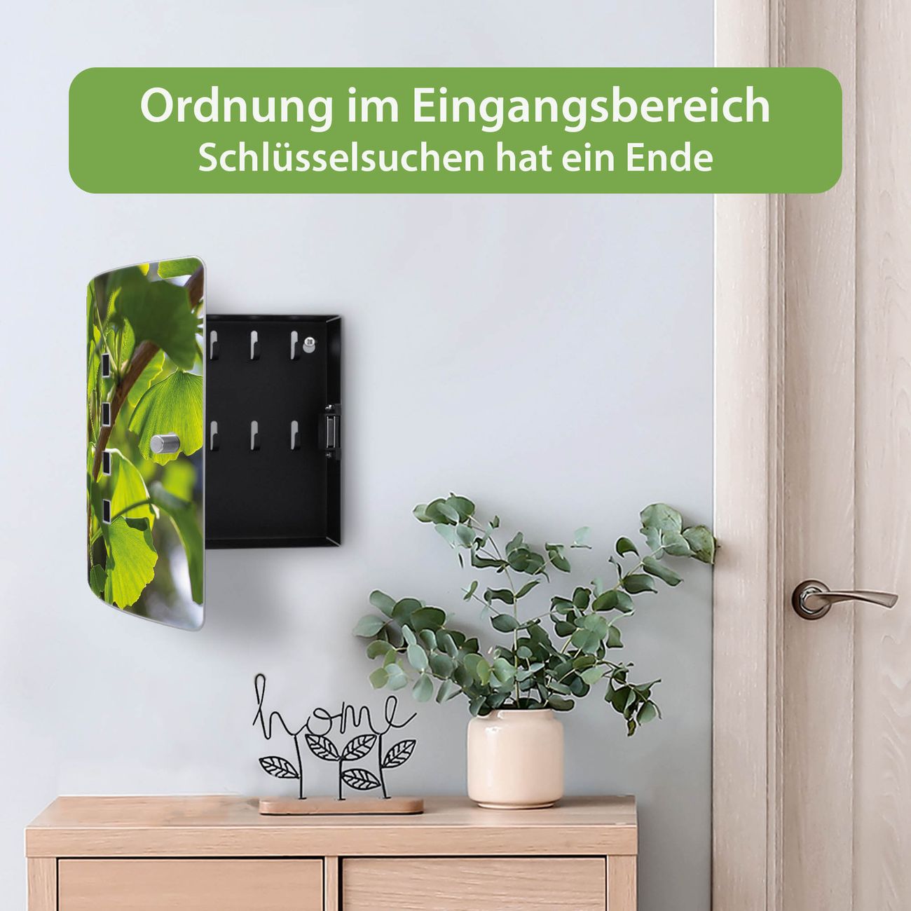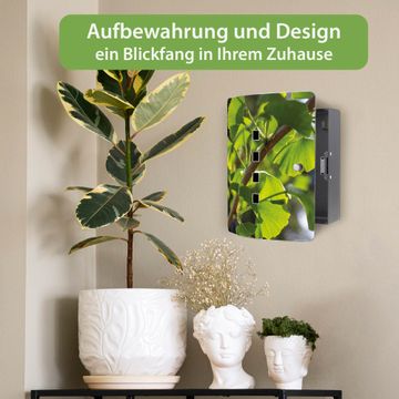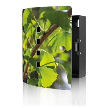 Funktion / Nutzen: Die leicht geschwungene Edelstahltür ist mit einer hochwertigen Motivfolie und dem Motiv Motiv Gingko kaschiert. Ein praktischer Magnetverschluss ermöglicht Ihnen ein schnelles Öffnen und Schließen. Befestigt wird der Schlüsselkasten an 2 Stellen auf der Rückseite, passendes Montagematerial fügen wir bereits bei.