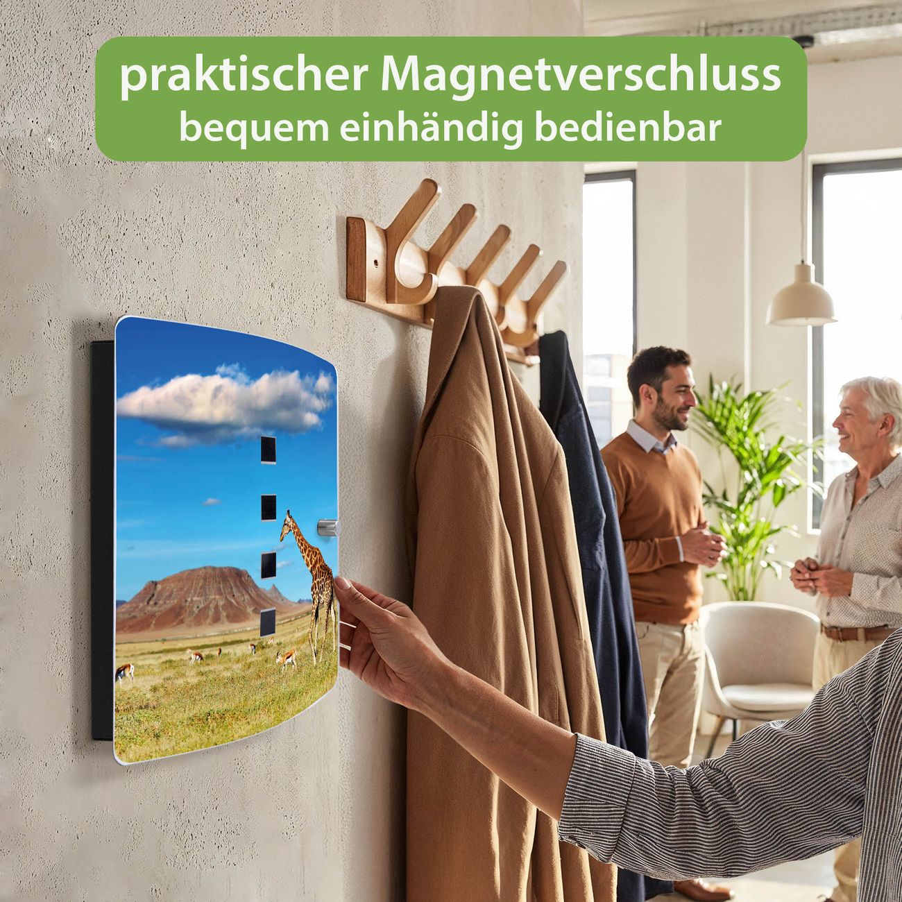 Funktion / Nutzen: Die leicht geschwungene Edelstahltür ist mit einer hochwertigen Motivfolie und dem Motiv Motiv Giraffe kaschiert. Ein praktischer Magnetverschluss ermöglicht Ihnen ein schnelles Öffnen und Schließen. Befestigt wird der Schlüsselkasten an 2 Stellen auf der Rückseite, passendes Montagematerial fügen wir bereits bei.