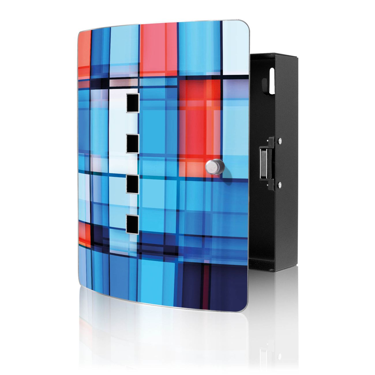 Funktion / Nutzen: Die leicht geschwungene Edelstahltür ist mit einer hochwertigen Motivfolie und dem Motiv Motiv Gläserne Stadt kaschiert. Ein praktischer Magnetverschluss ermöglicht Ihnen ein schnelles Öffnen und Schließen. Befestigt wird der Schlüsselkasten an 2 Stellen auf der Rückseite, passendes Montagematerial fügen wir bereits bei.