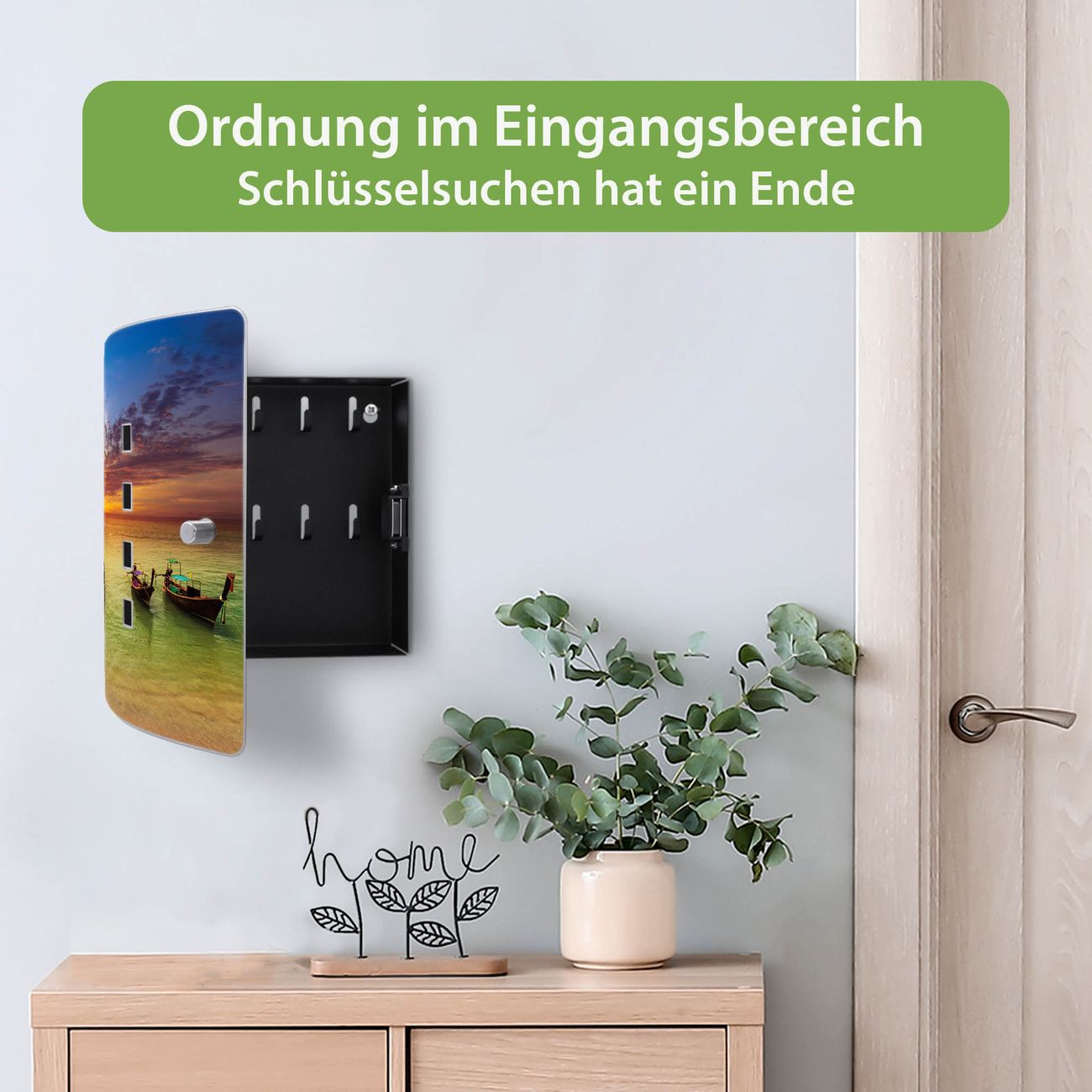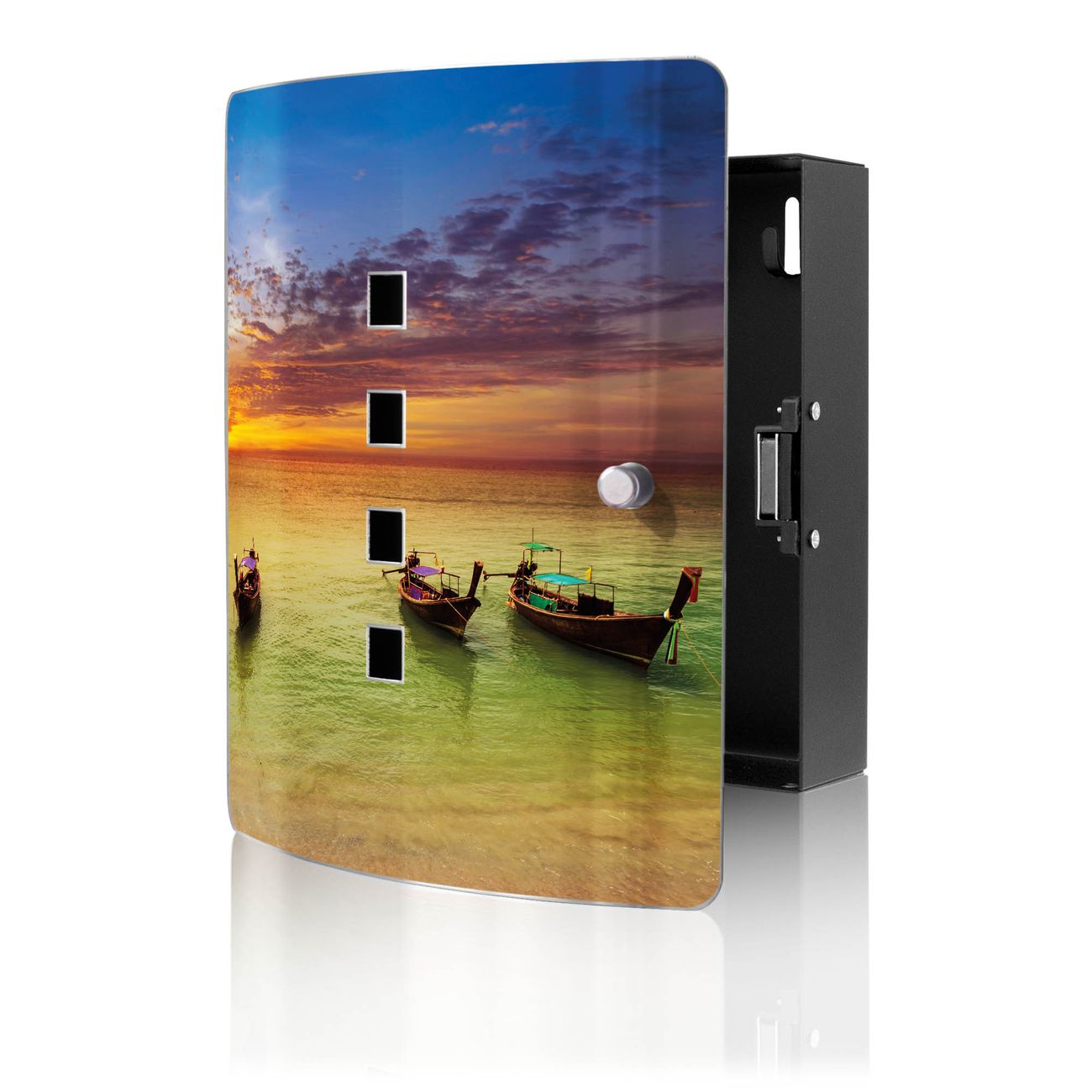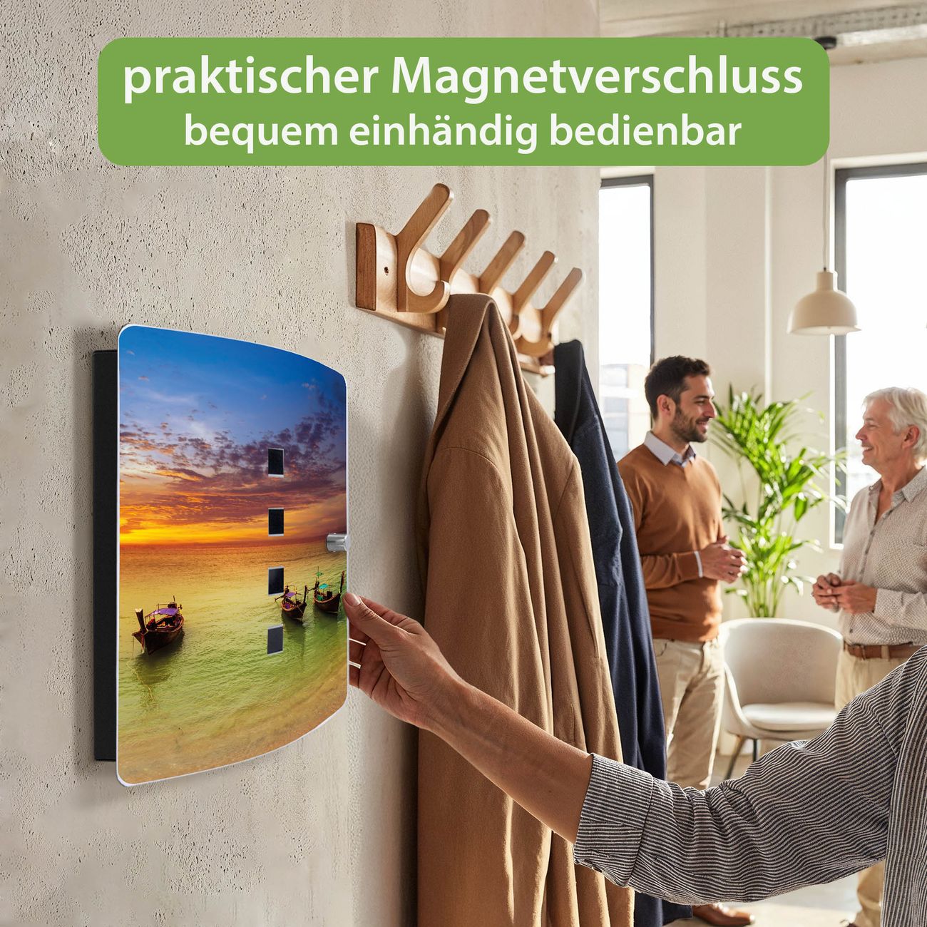 Funktion / Nutzen: Die leicht geschwungene Edelstahltür ist mit einer hochwertigen Motivfolie und dem Motiv Motiv Golf Von Thailand kaschiert. Ein praktischer Magnetverschluss ermöglicht Ihnen ein schnelles Öffnen und Schließen. Befestigt wird der Schlüsselkasten an 2 Stellen auf der Rückseite, passendes Montagematerial fügen wir bereits bei.