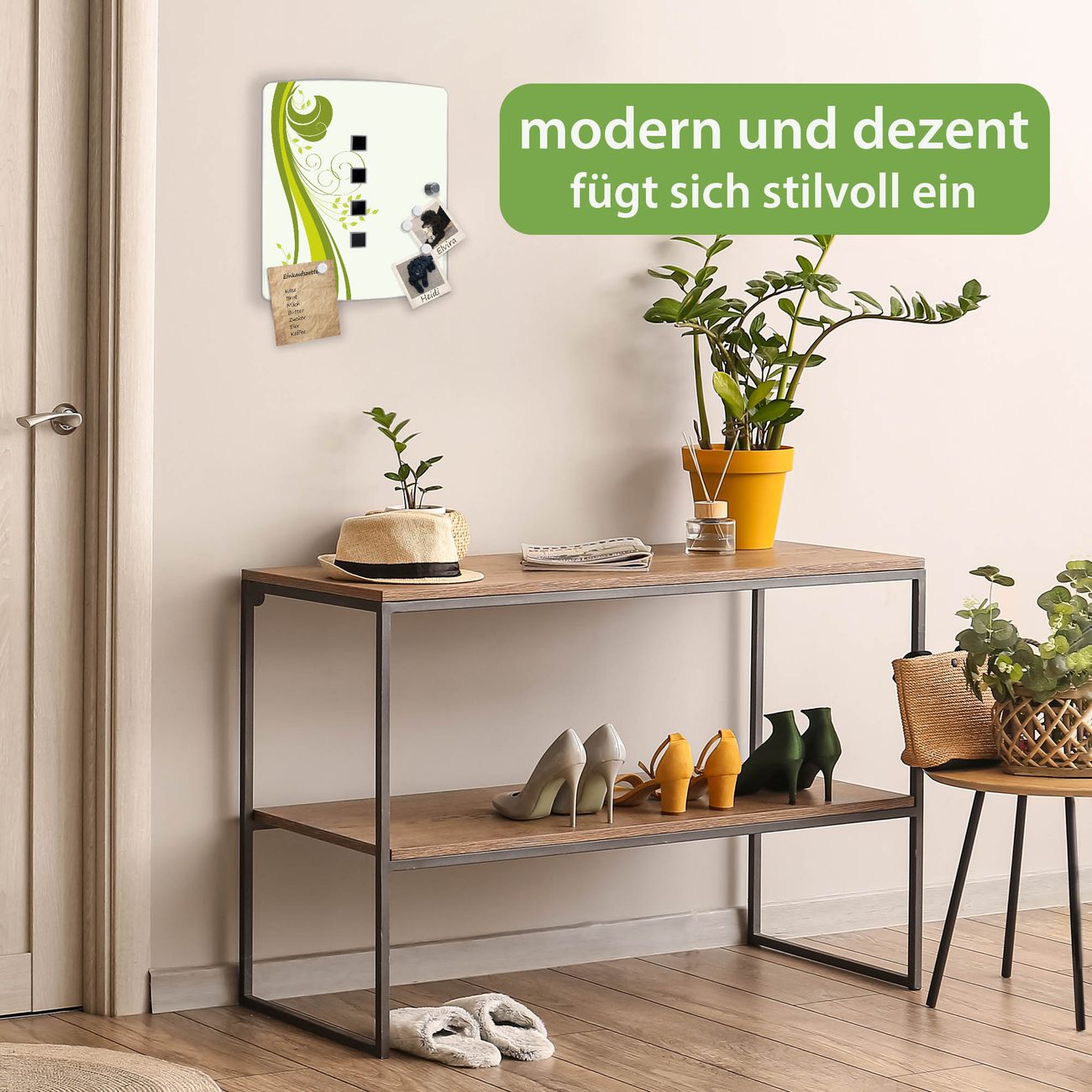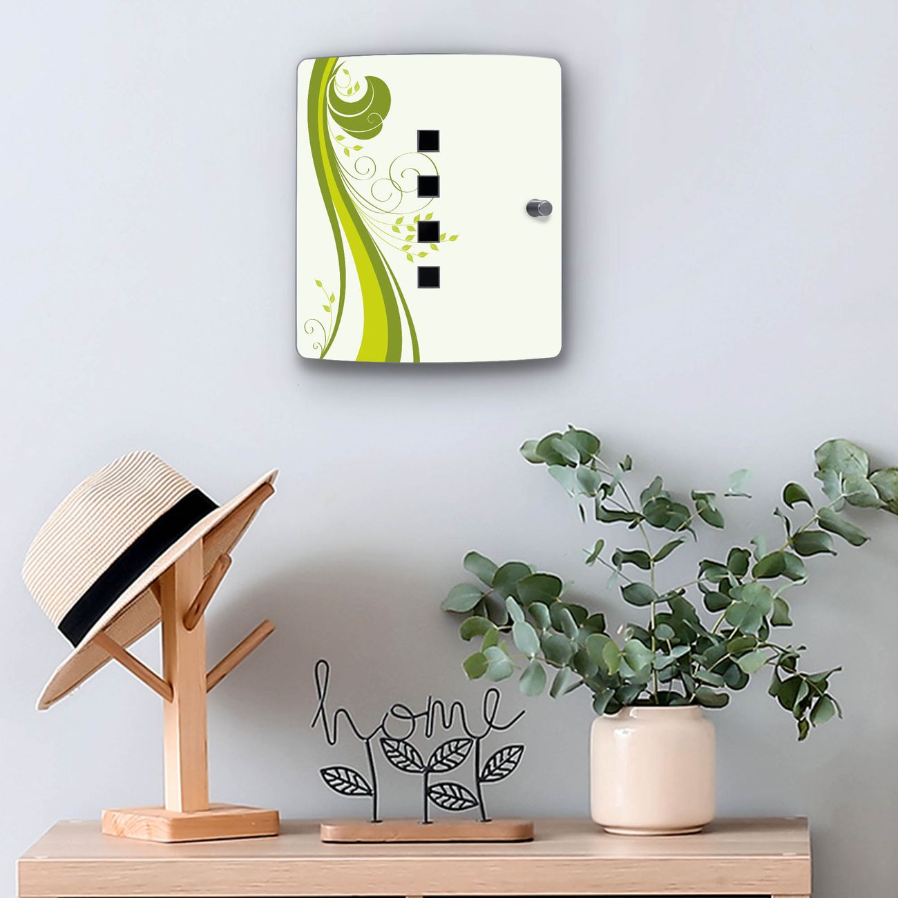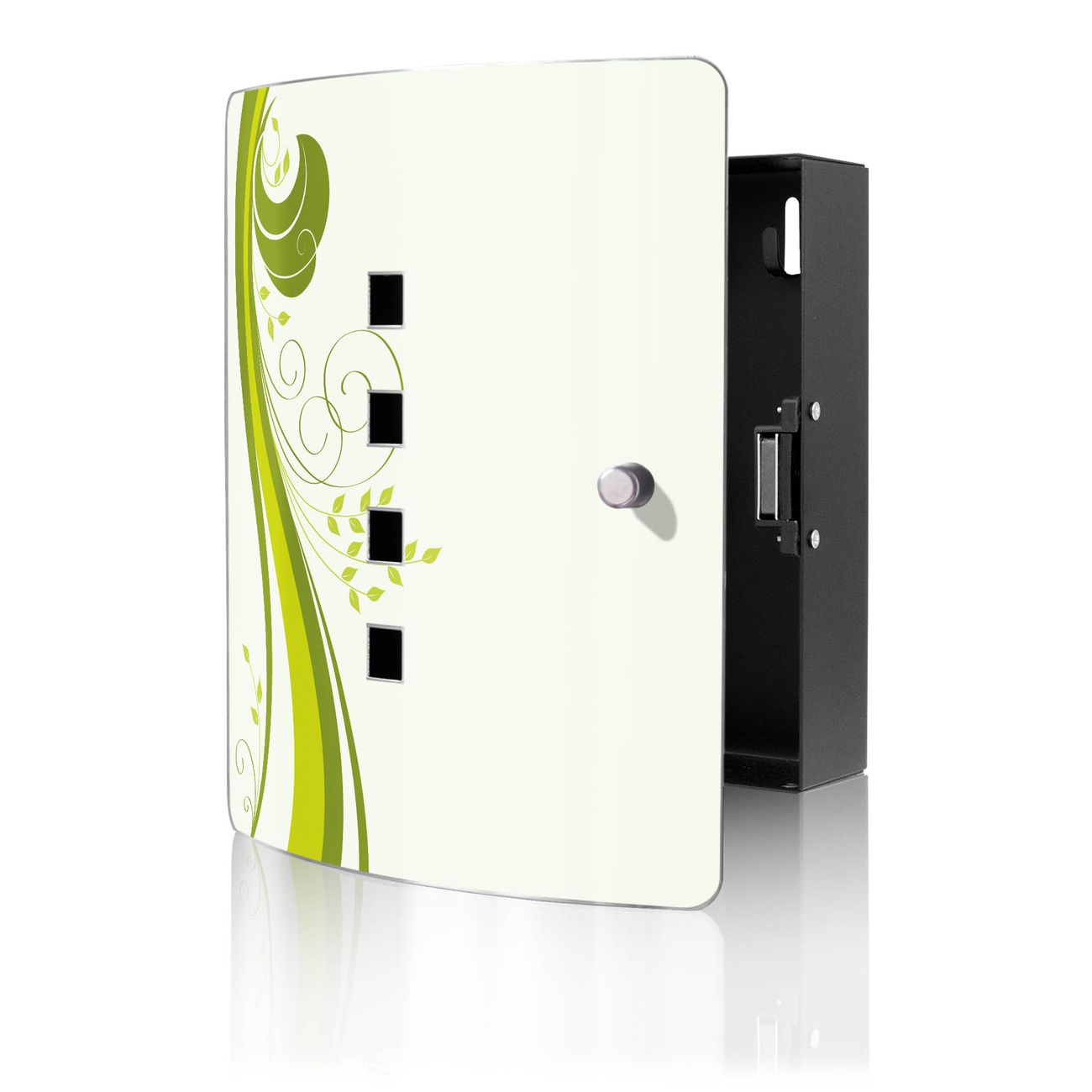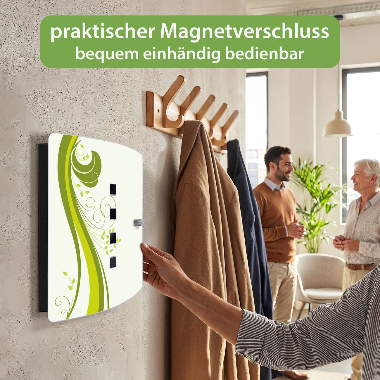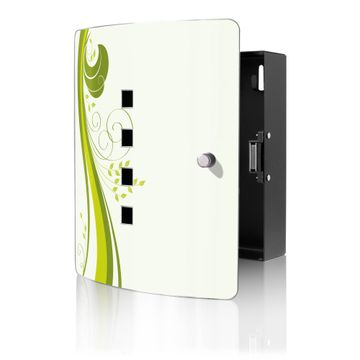 Funktion / Nutzen: Die leicht geschwungene Edelstahltür ist mit einer hochwertigen Motivfolie und dem Motiv Motiv Green Swirl kaschiert. Ein praktischer Magnetverschluss ermöglicht Ihnen ein schnelles Öffnen und Schließen. Befestigt wird der Schlüsselkasten an 2 Stellen auf der Rückseite, passendes Montagematerial fügen wir bereits bei.