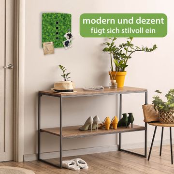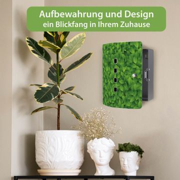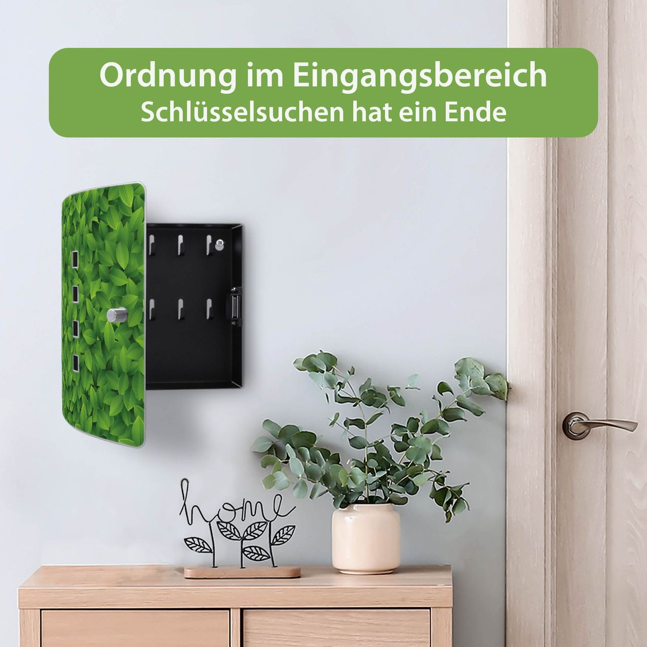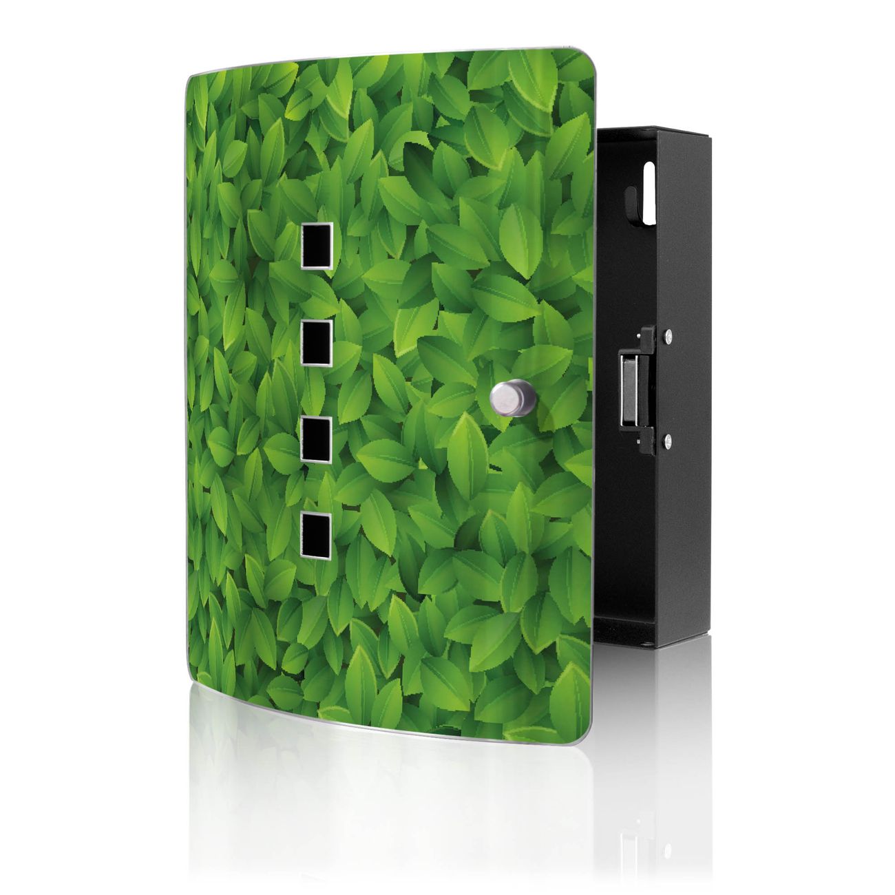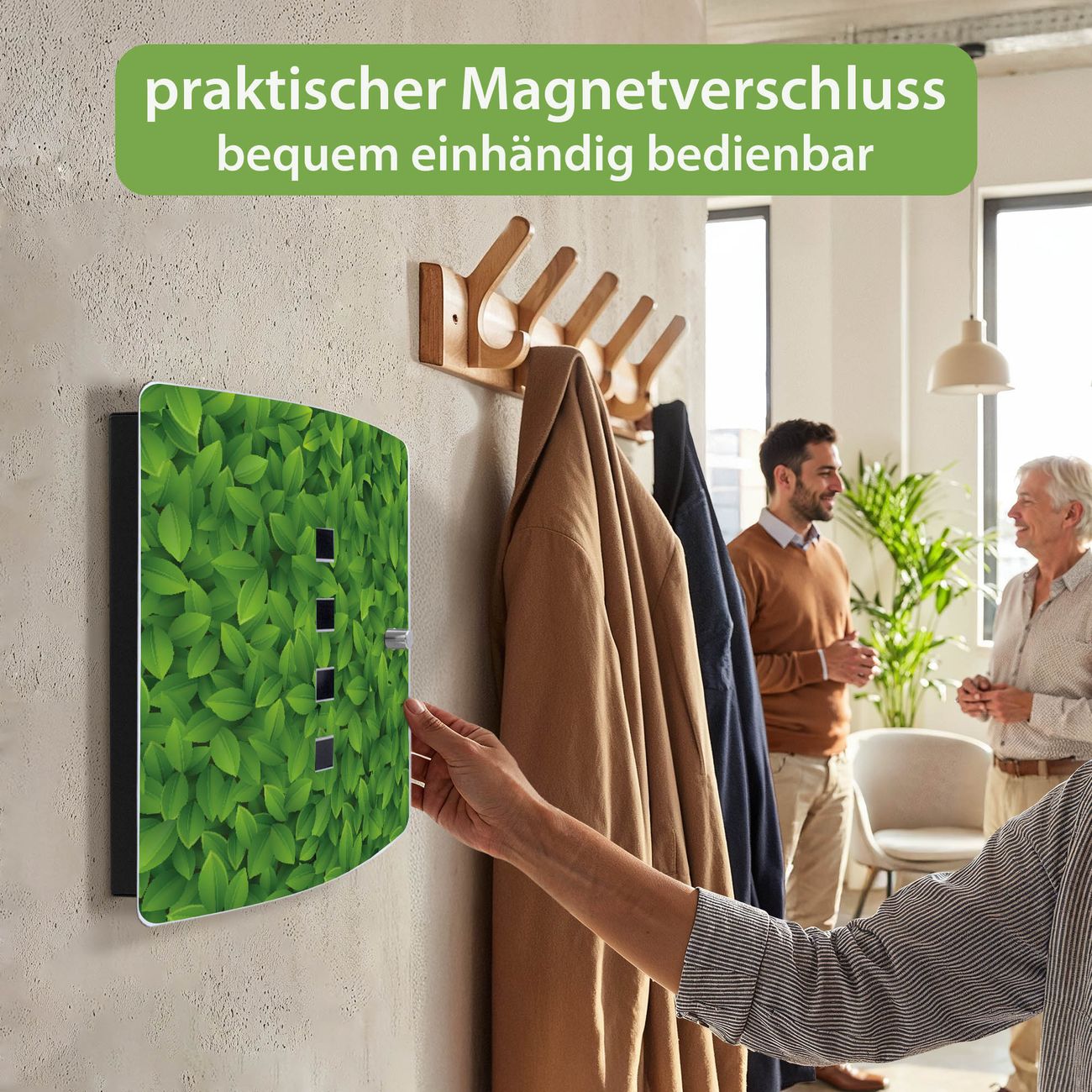 Funktion / Nutzen: Die leicht geschwungene Edelstahltür ist mit einer hochwertigen Motivfolie und dem Motiv Motiv Grüne Blätter kaschiert. Ein praktischer Magnetverschluss ermöglicht Ihnen ein schnelles Öffnen und Schließen. Befestigt wird der Schlüsselkasten an 2 Stellen auf der Rückseite, passendes Montagematerial fügen wir bereits bei.