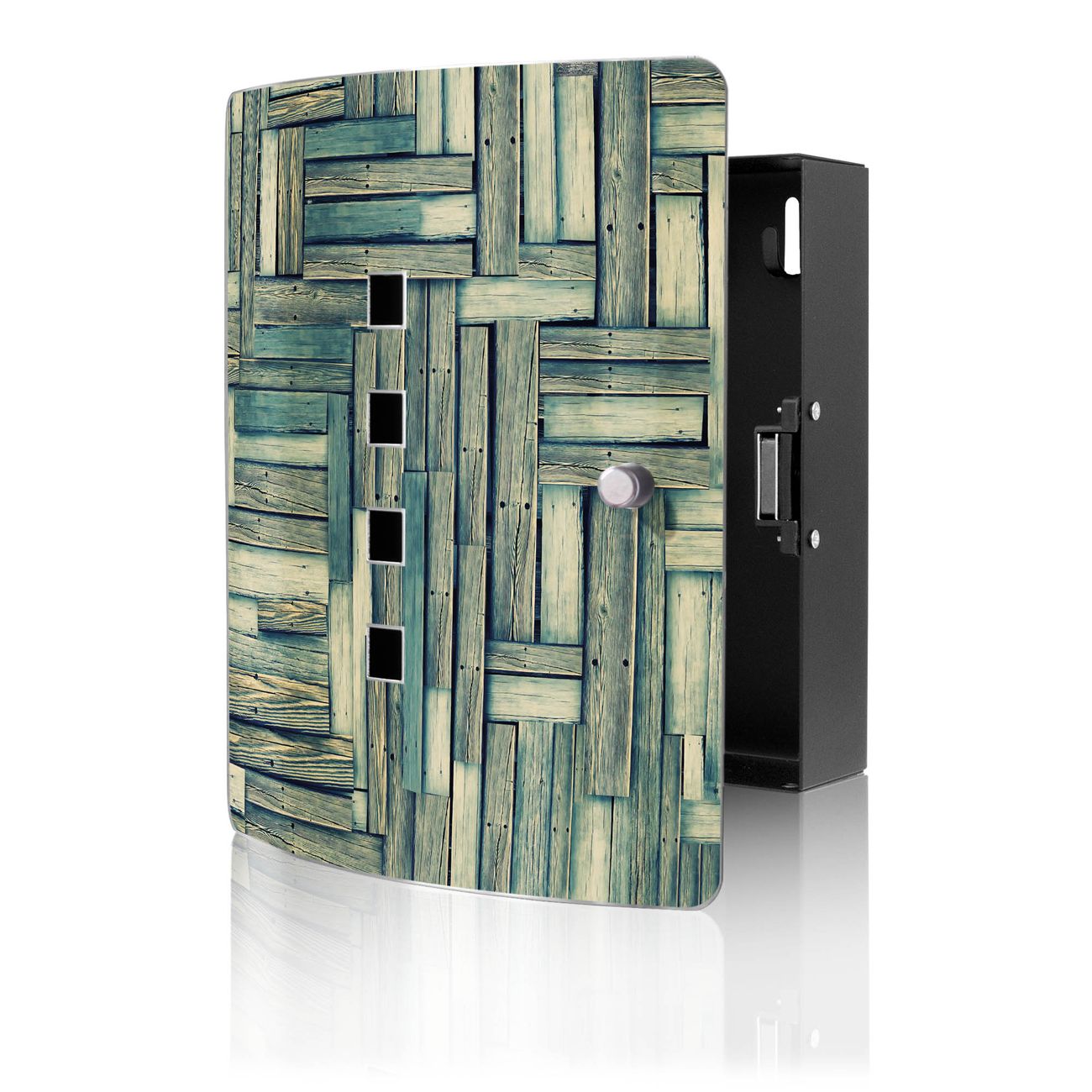 Funktion / Nutzen: Die leicht geschwungene Edelstahltür ist mit einer hochwertigen Motivfolie und dem Motiv Motiv Grüne Planken kaschiert. Ein praktischer Magnetverschluss ermöglicht Ihnen ein schnelles Öffnen und Schließen. Befestigt wird der Schlüsselkasten an 2 Stellen auf der Rückseite, passendes Montagematerial fügen wir bereits bei.